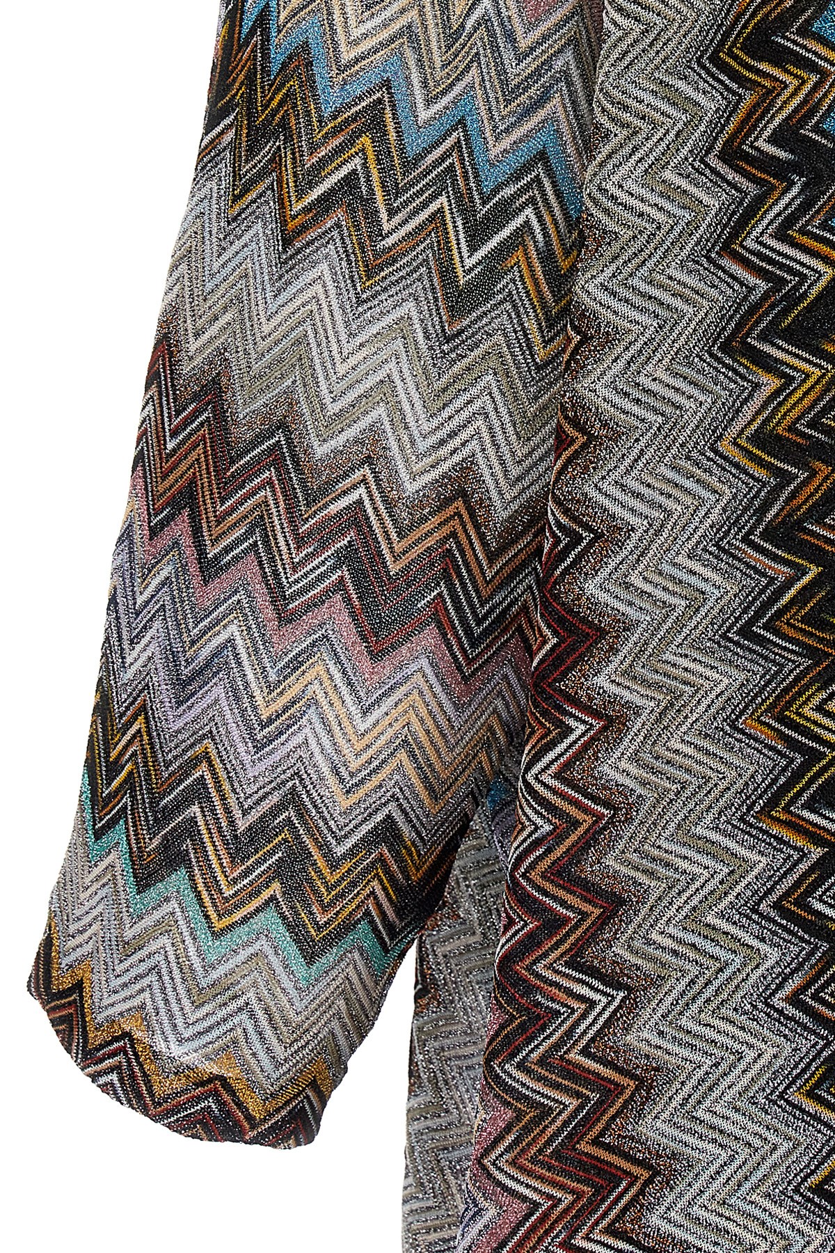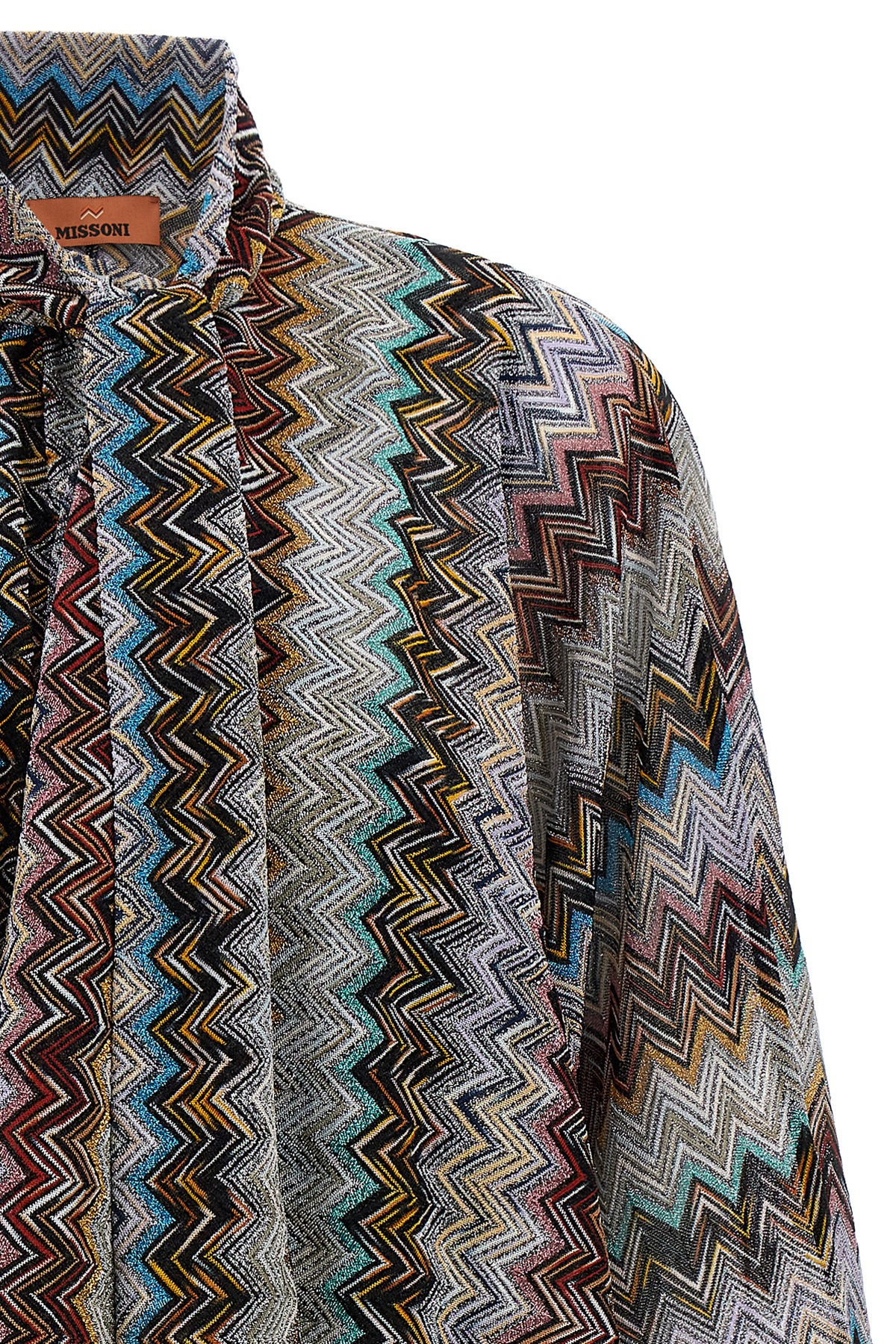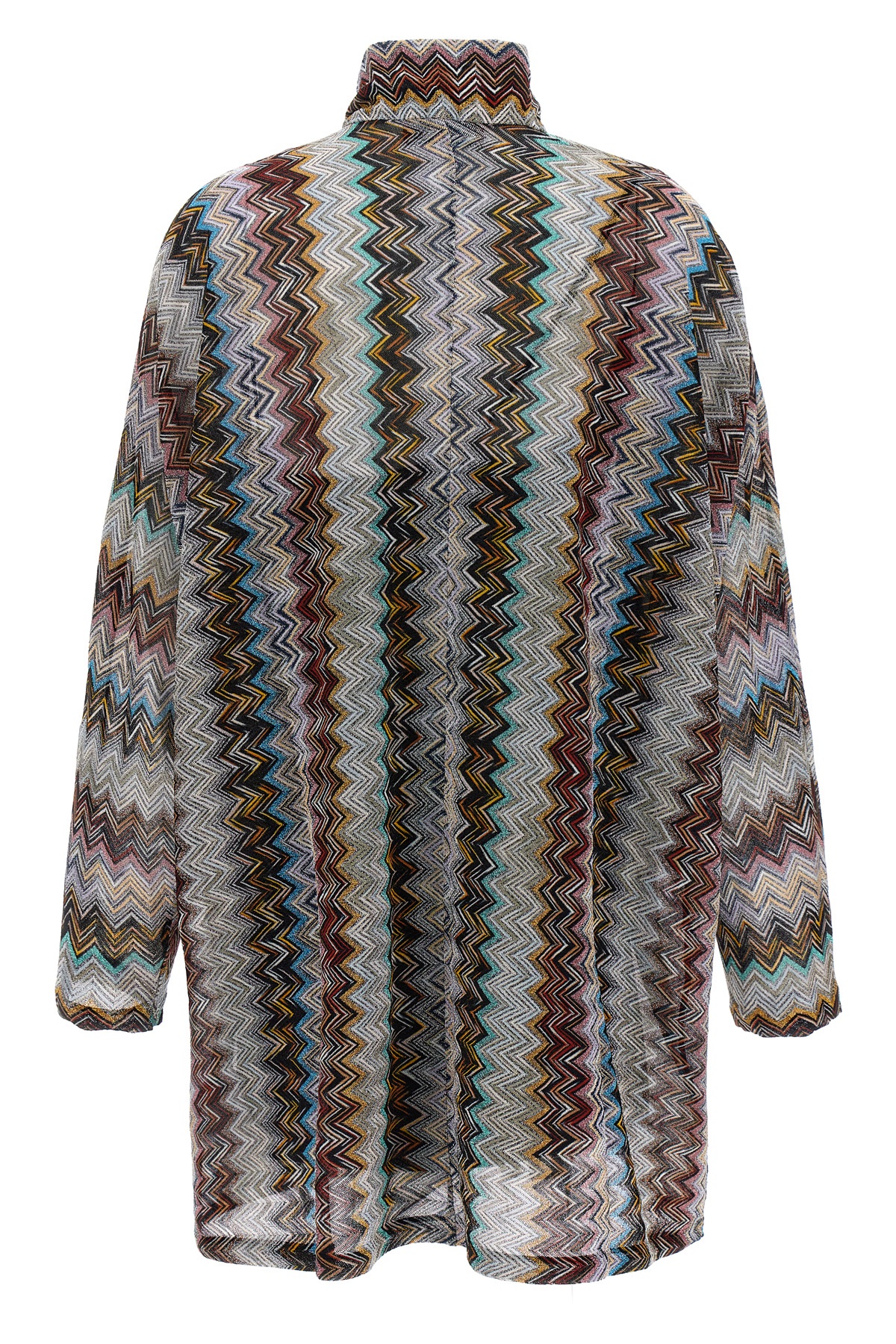 Viscose blend mini dress with raschel pattern, all-over zig zag lame pattern, high collar with sash, front button closure, long wide sleeves.