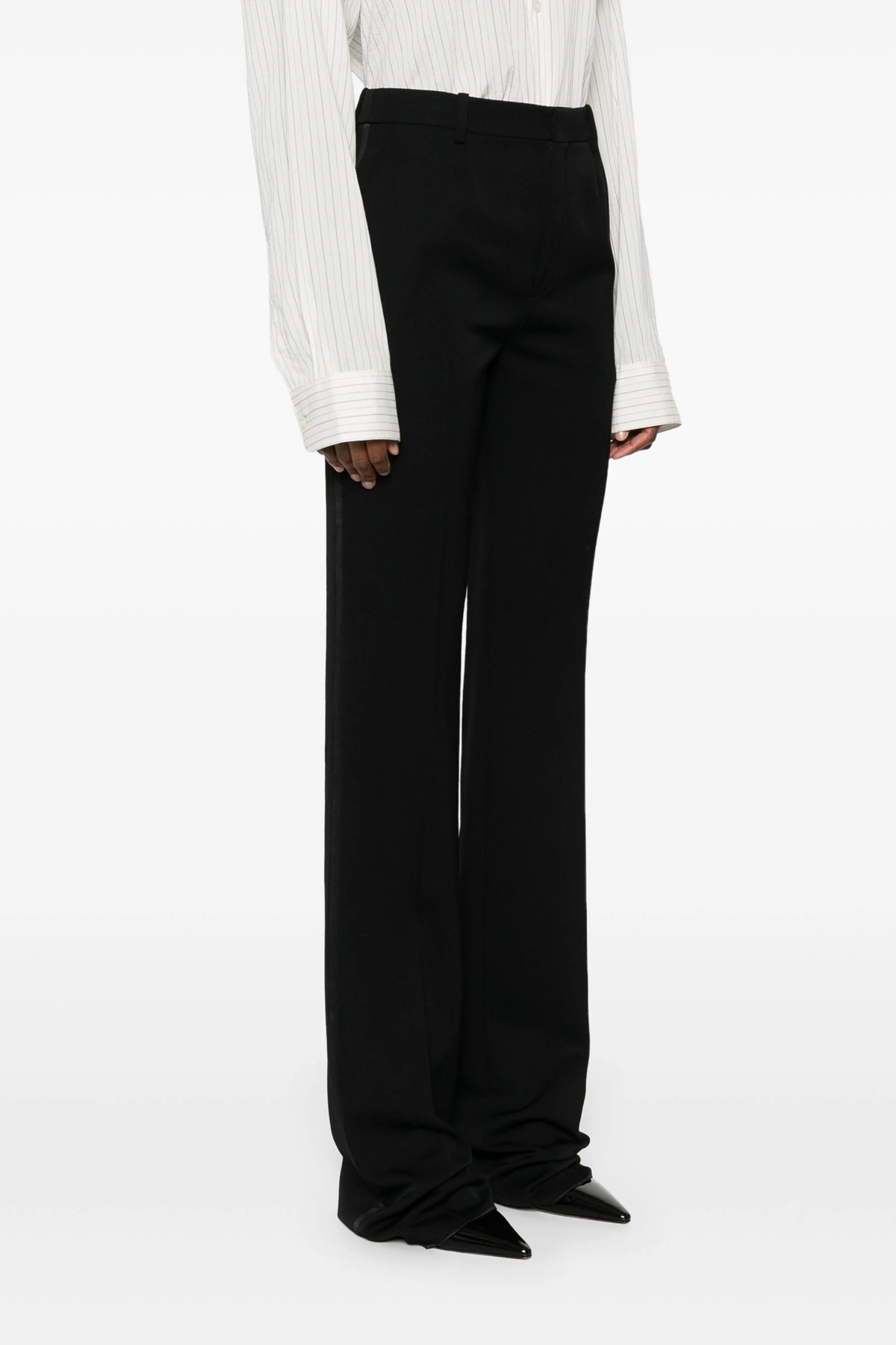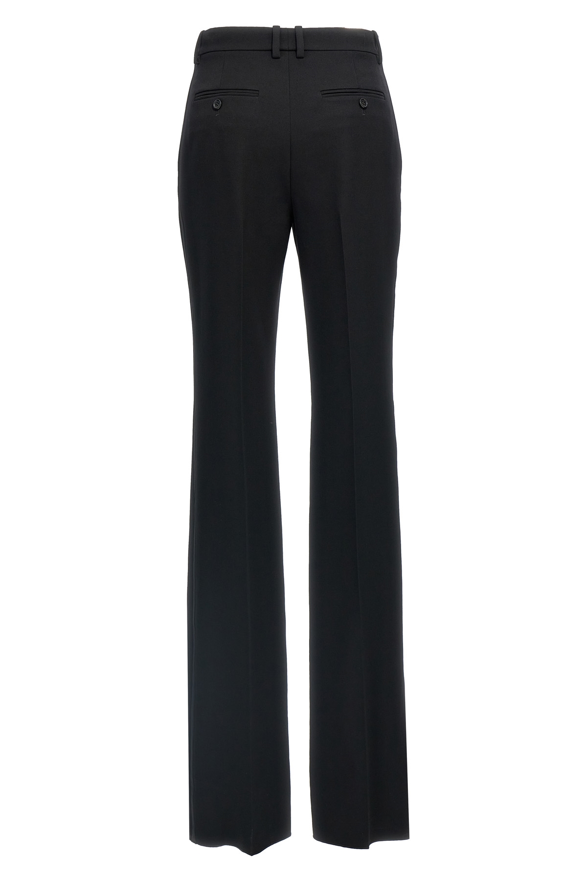 Tuxedo pants in grain de poudre wool, side satin band, zip and button closure, pockets, flared leg with stretched pleat.