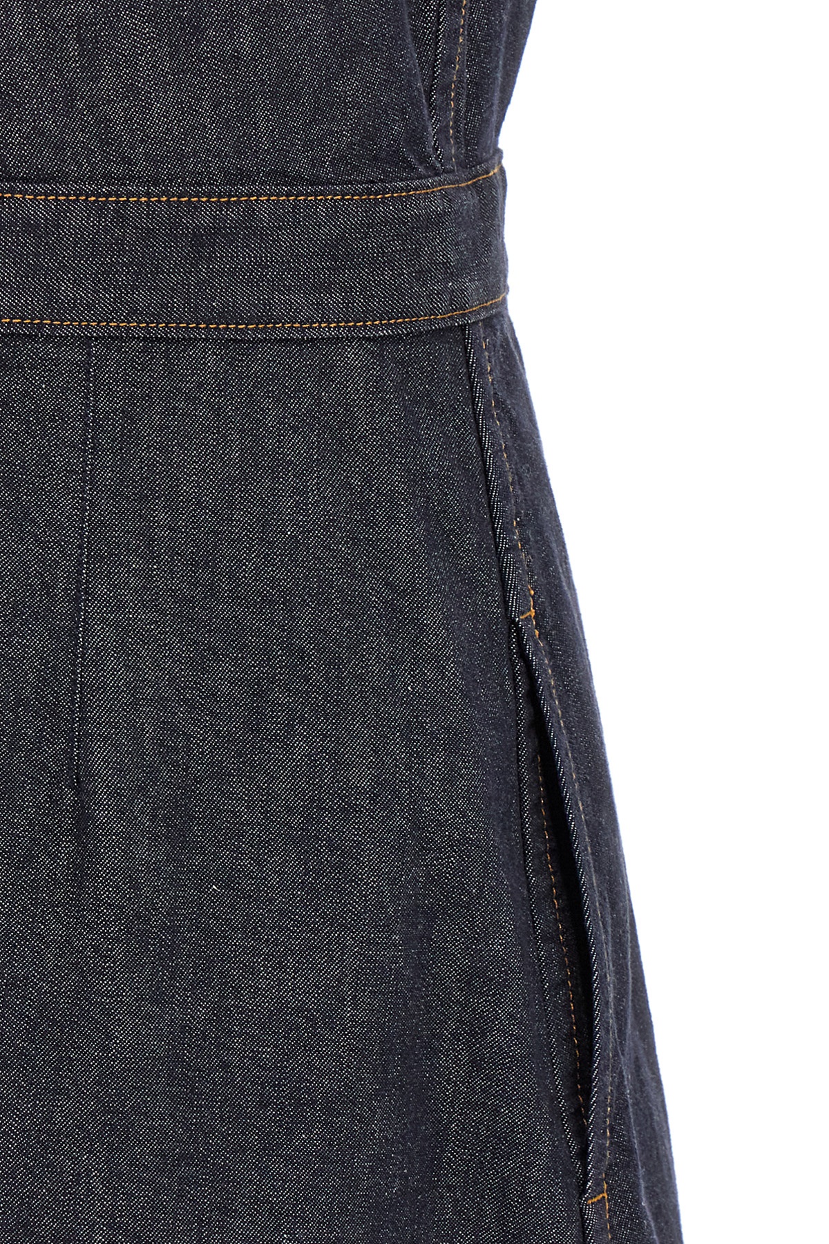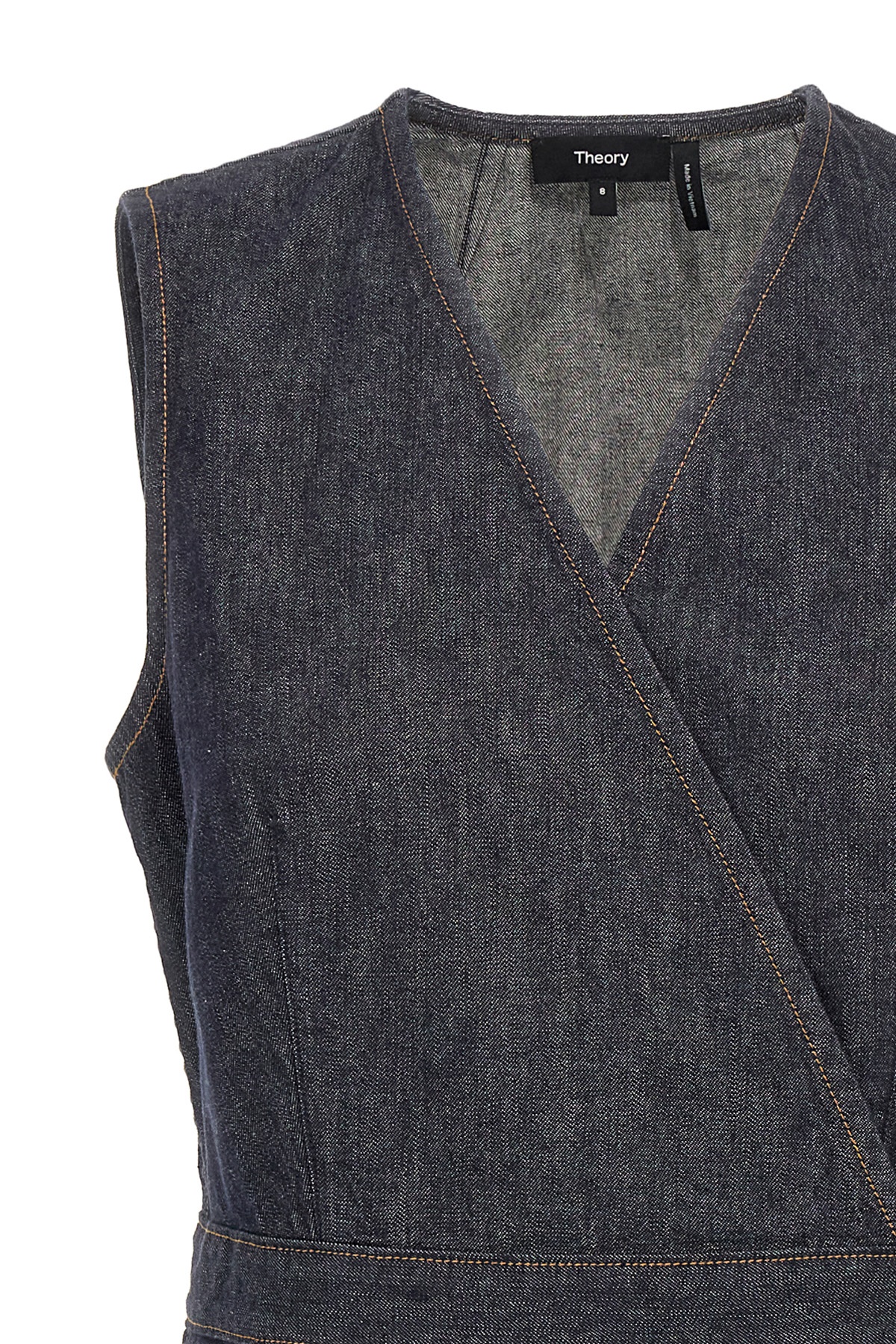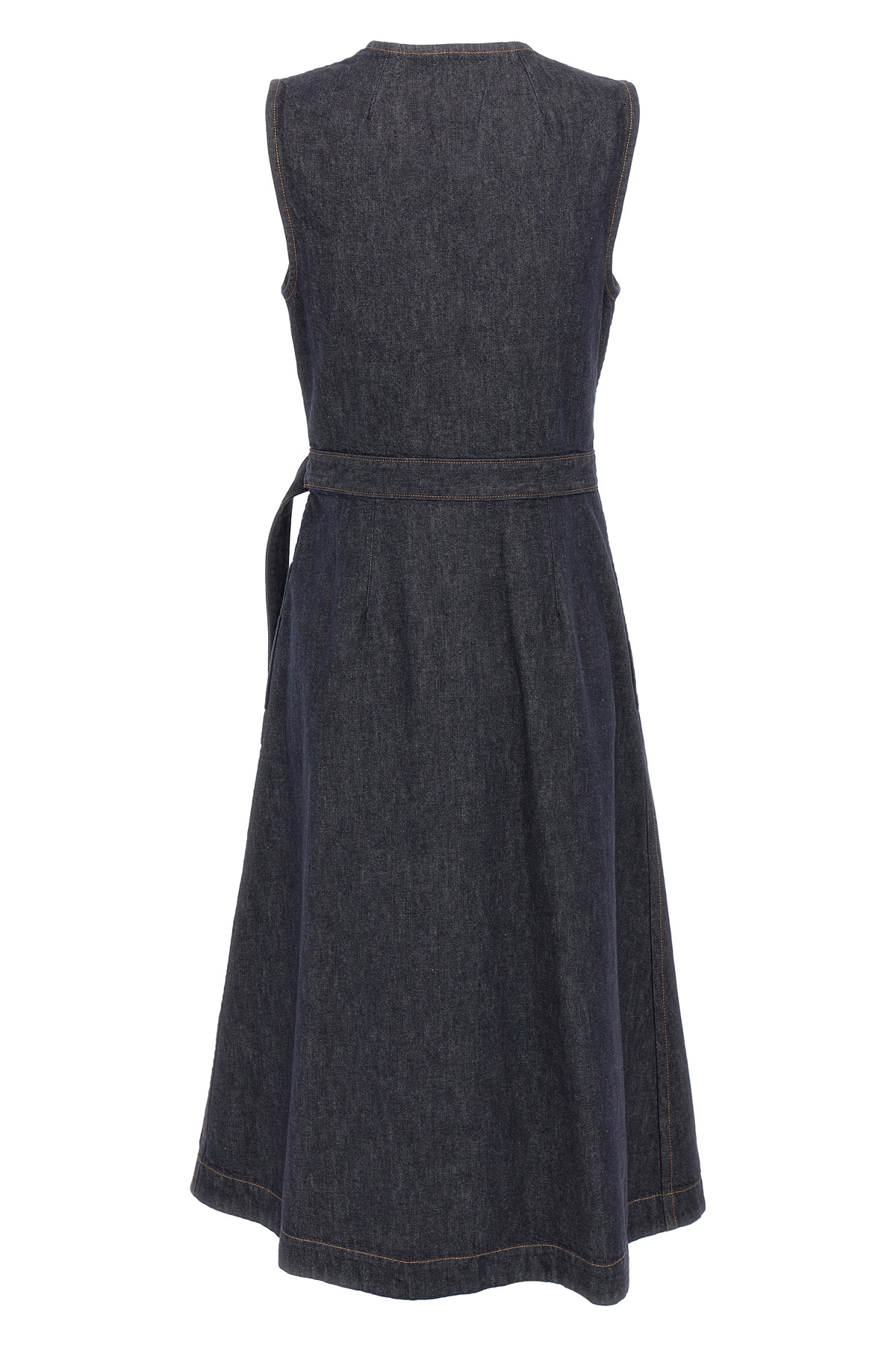Denim sleeveless wallet dress with V-neck, adjustable belt.