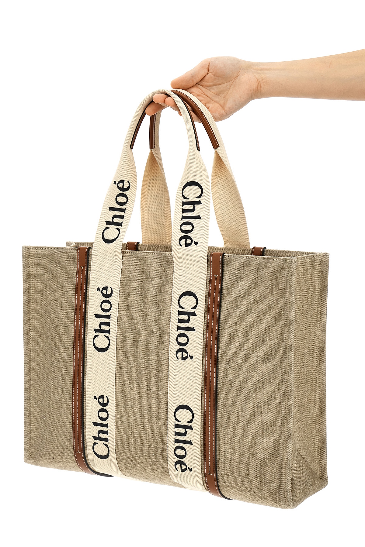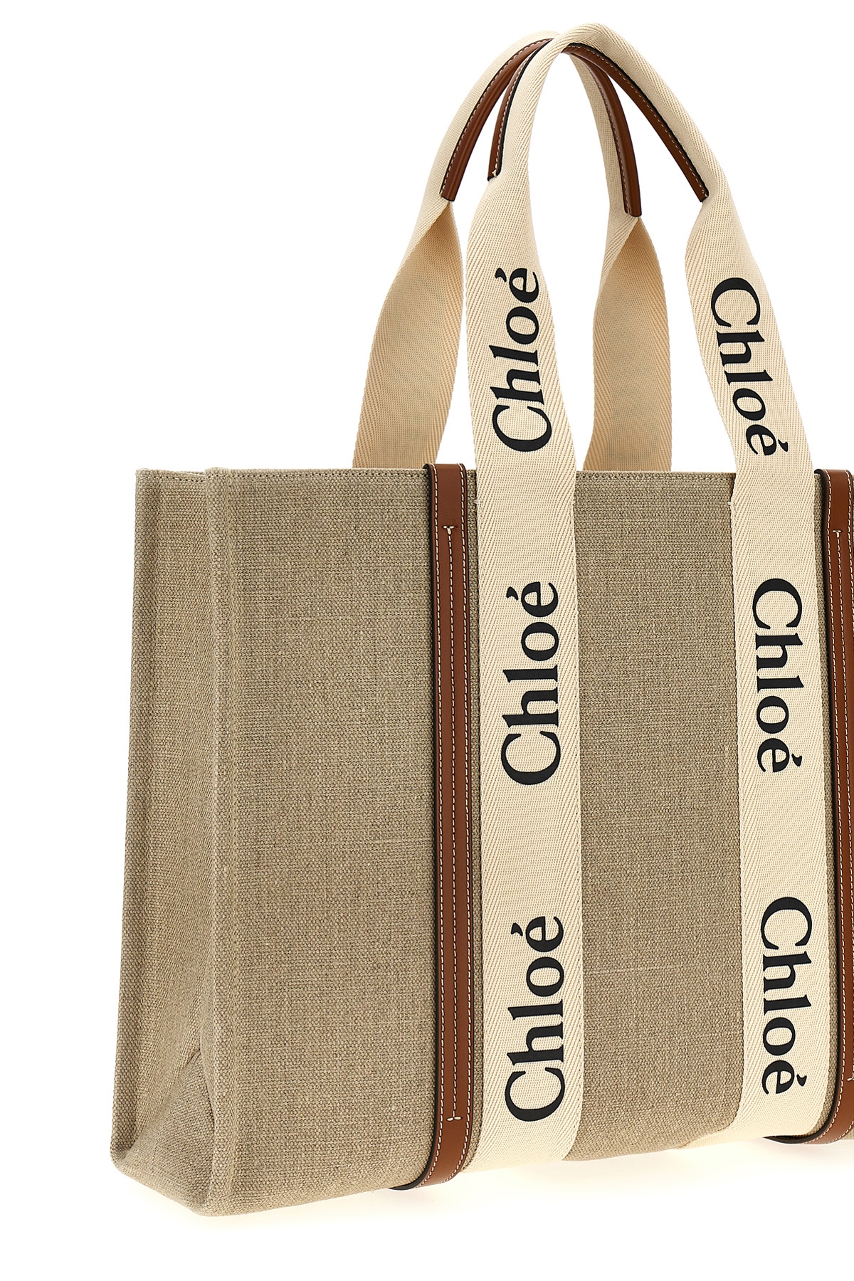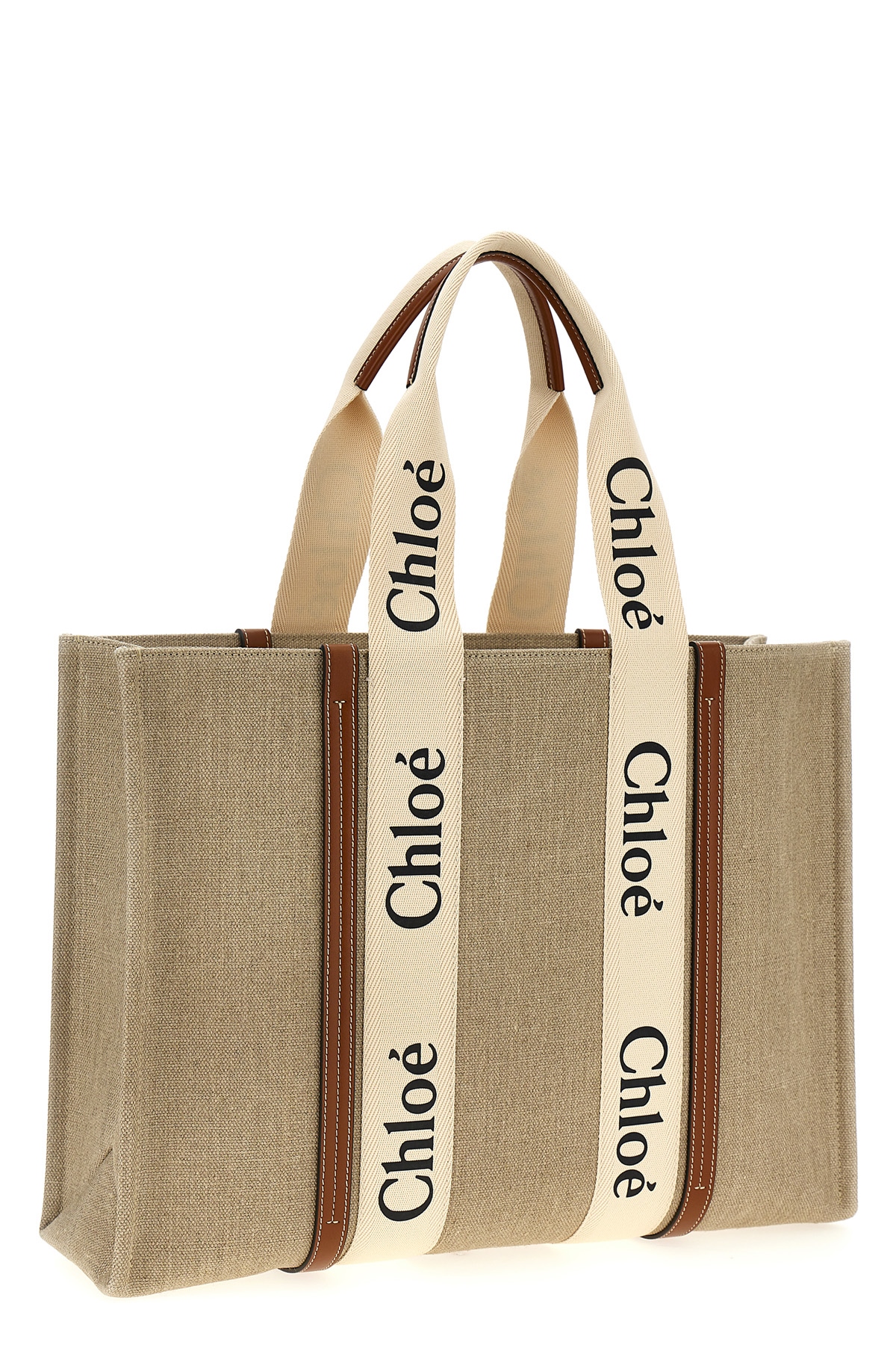 'Woody' large shopping bag in linen canvas featuring shiny calf leather details and logo grosgrain details. Featuring a handle.
