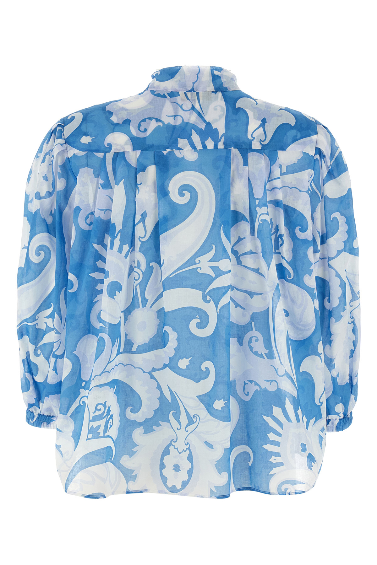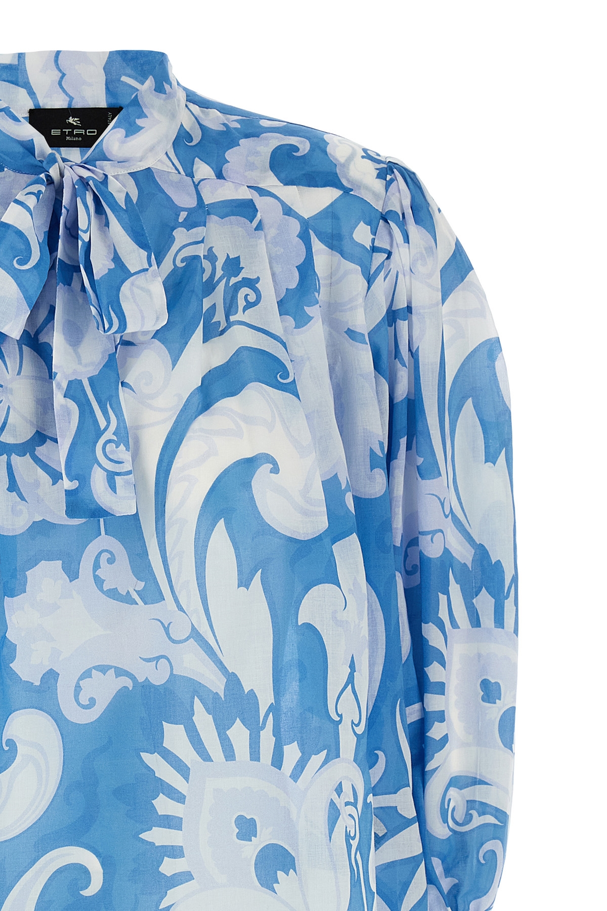 Light cotton blouse with floral print, lavalliere collar with V-neck, long sleeves with elastic on the cuffs.
