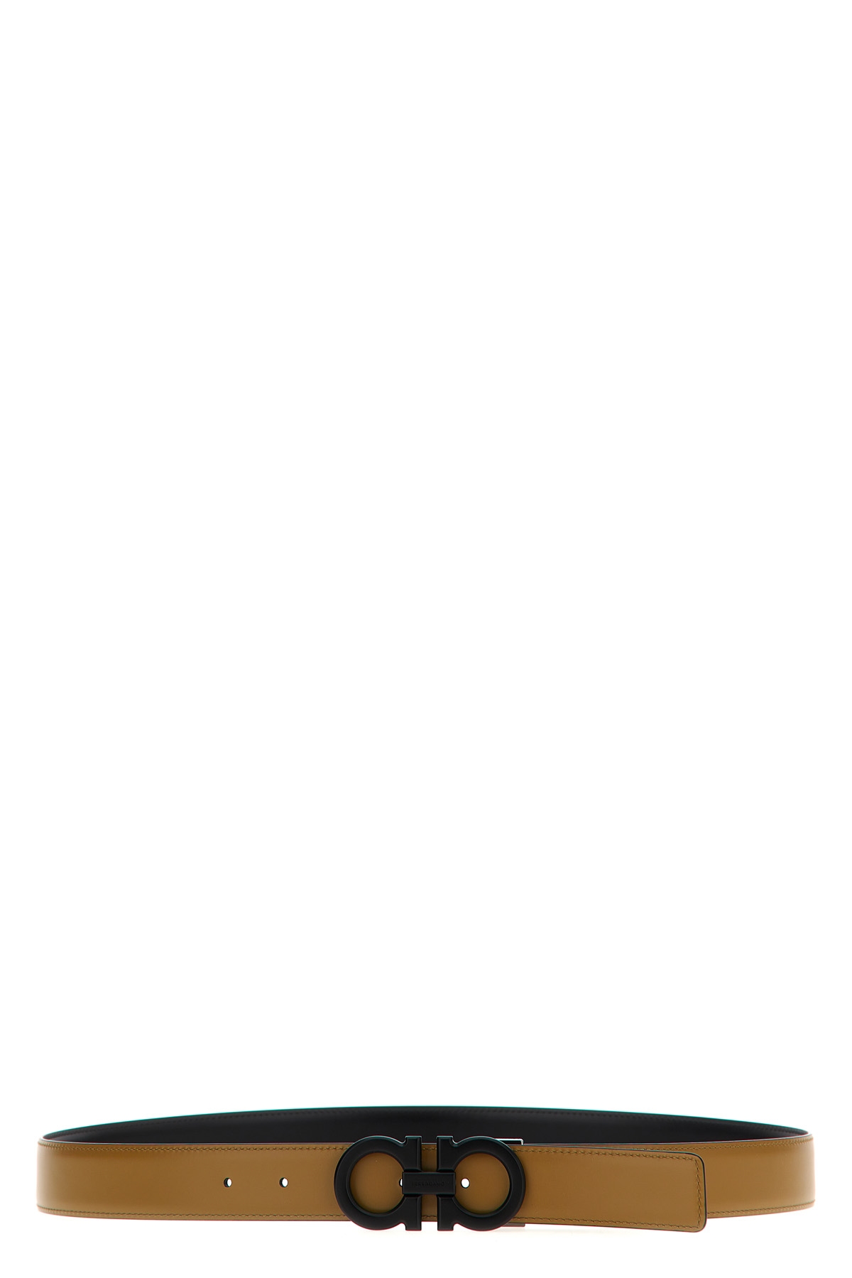 Reversible belt in beige and black leather, metal buckle with hooks.