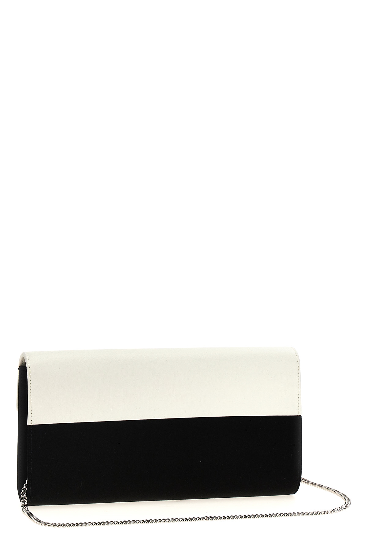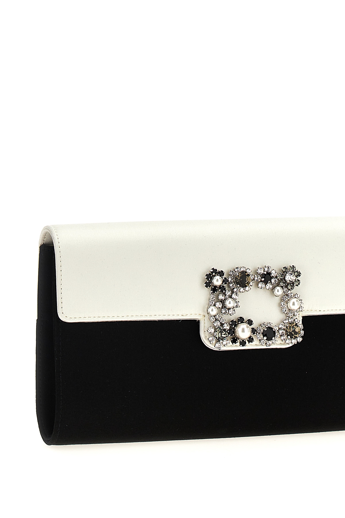 'Flower Strass' satin clutch bag, magnetic flap closure, front jewel buckle, metal chain shoulder strap.