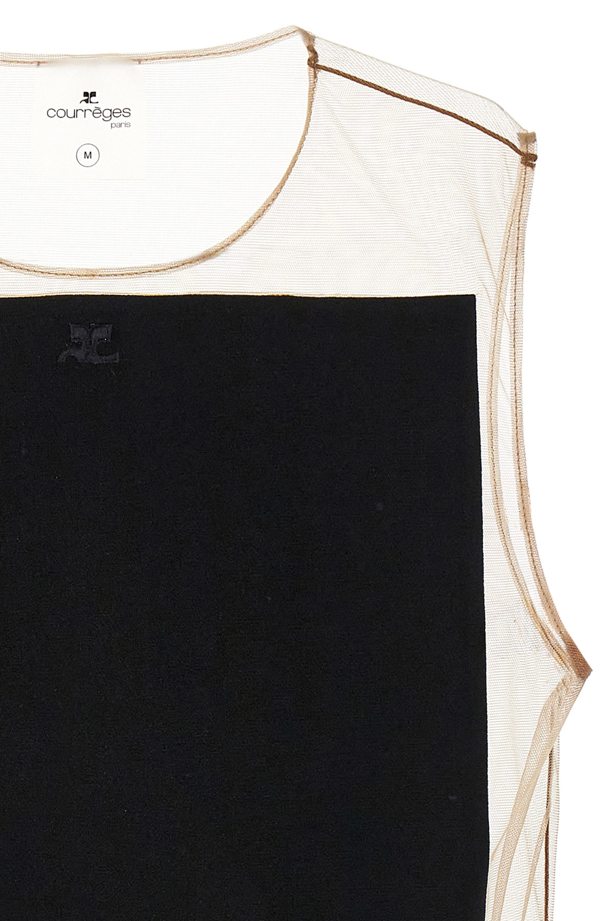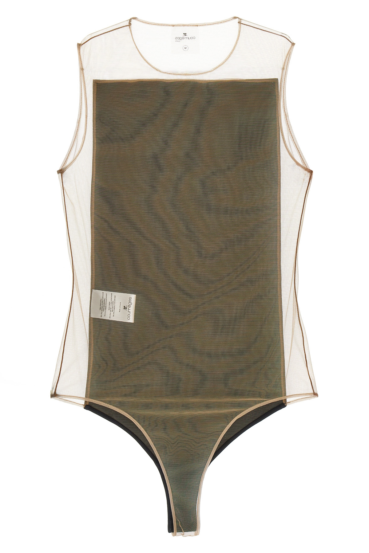 'Illusion' sleeveless bodysuit with front logo embroidery, transparent tulle shoulders and back, button closure.