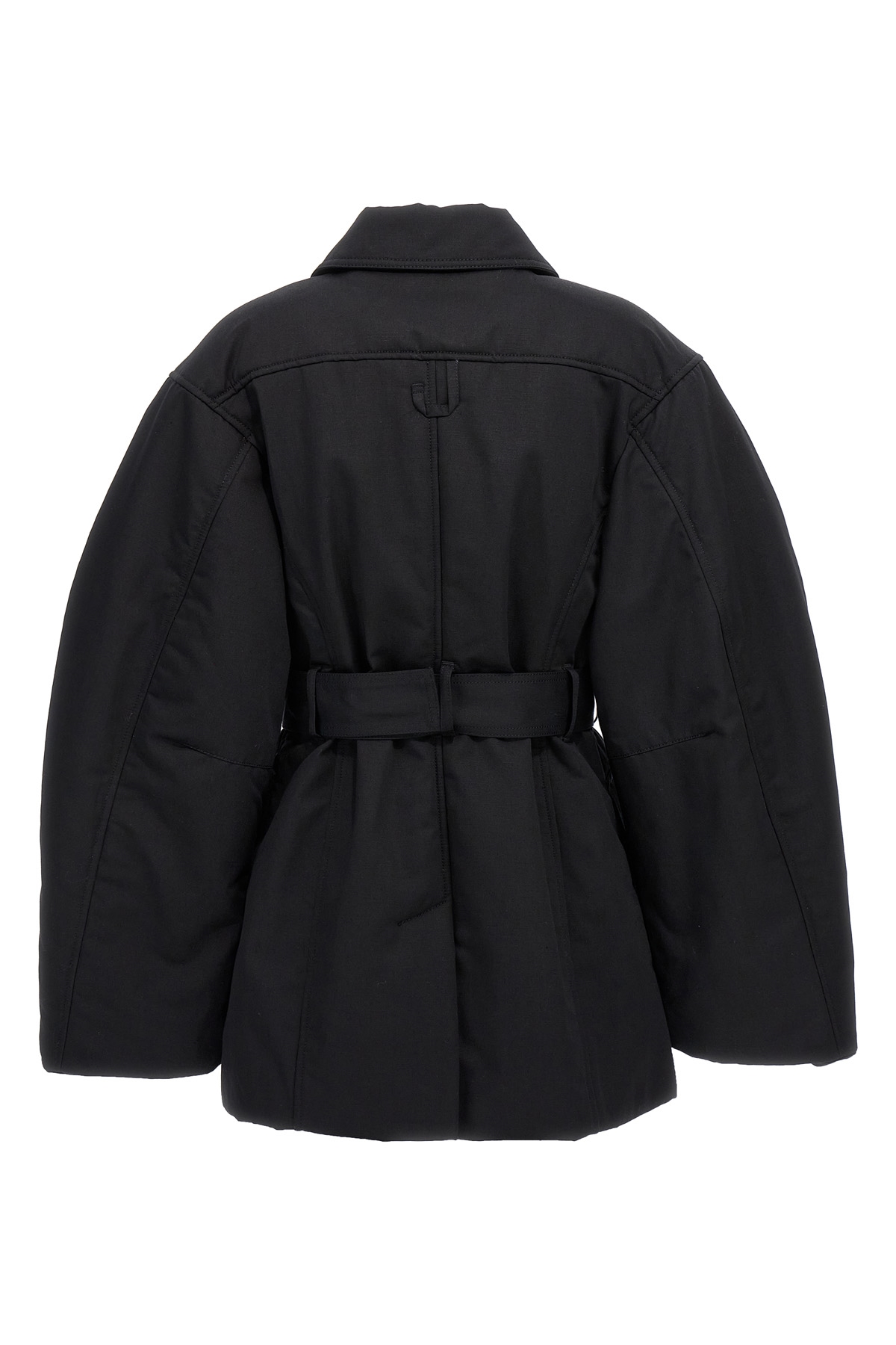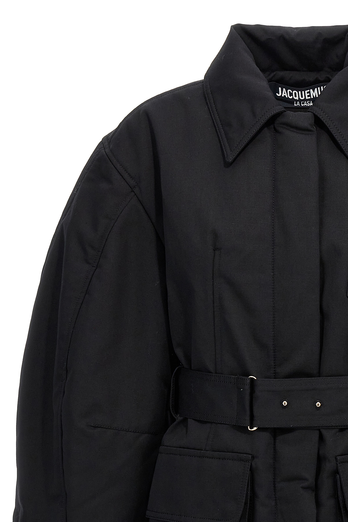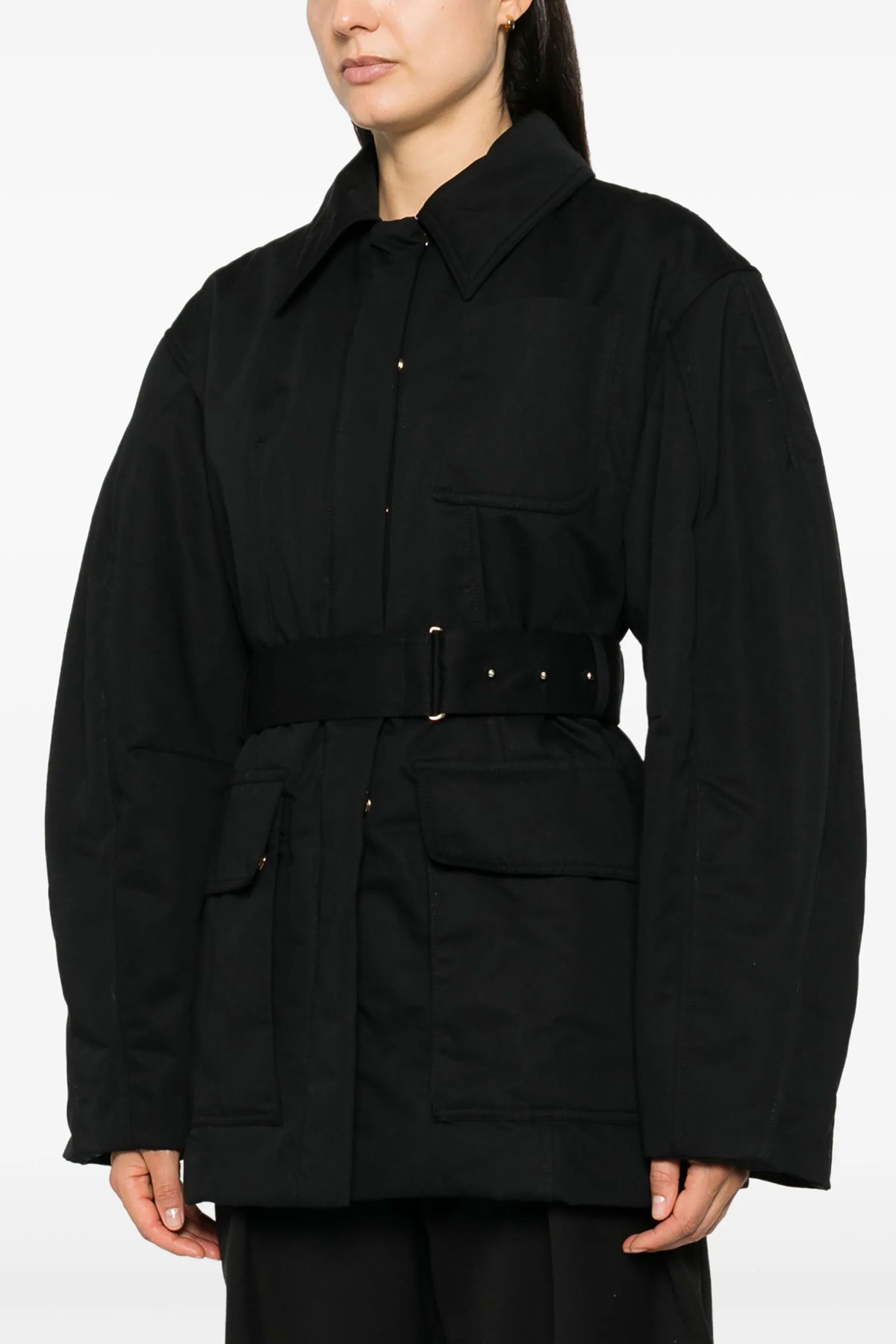 'Le Blouson Bari' jacket, padded with patch pockets, shirt collar, belt at the waist with hooks, zip and button closure, long sleeves.