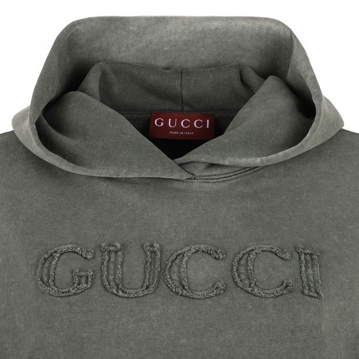 Dark green cotton jersey hoodie from Gucci featuring logo embroidery on chest, fixed hood, long sleeves, dropped shoulders, kangaroo pocket, regular fit and ribbed-knit trims.