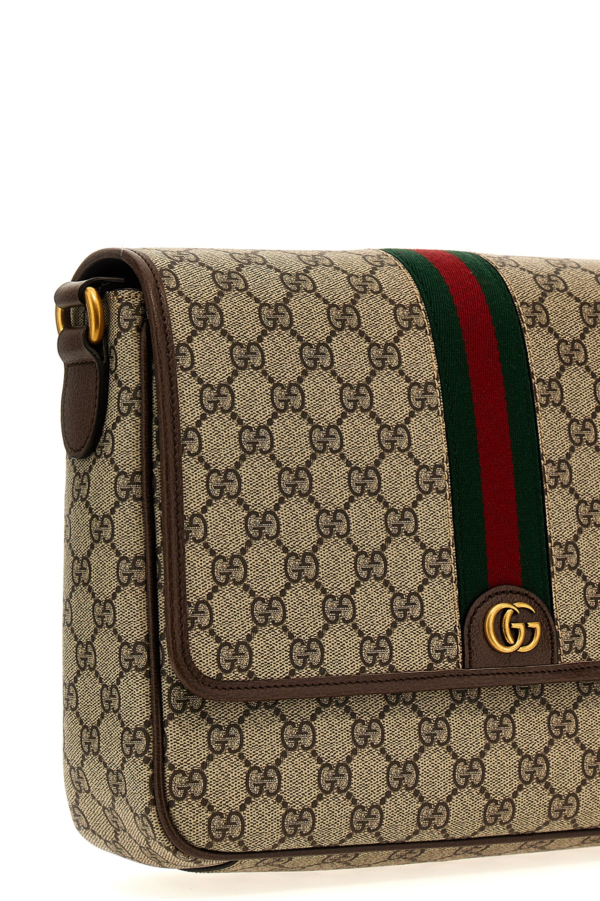 'Ophidia' medium crossbody bag in GG Supreme fabric with leather details, magnetic closure, metal logo detail and Web Ribbon, adjustable shoulder strap.