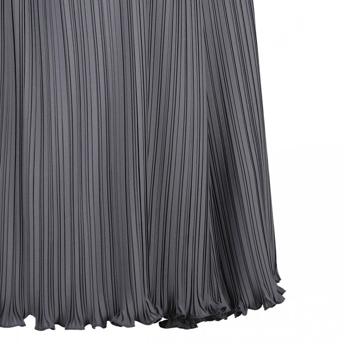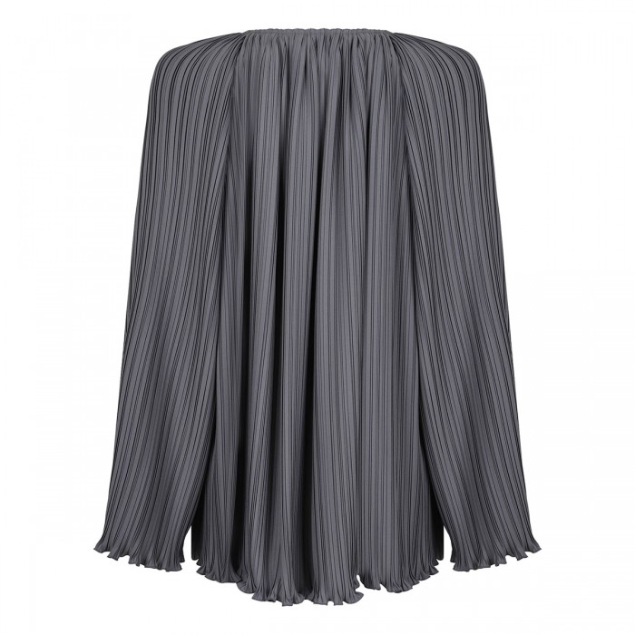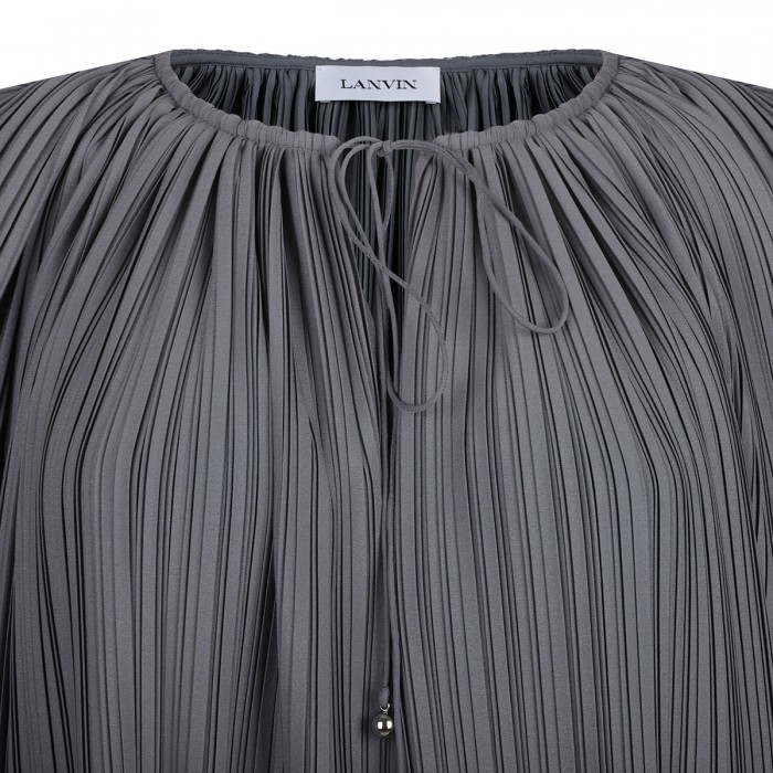 Steel gray fluid pleated jersey top from Lanvin featuring pleated silhouette, gathered tie neck, crew collar with split, long sleeves, ruffled hem.