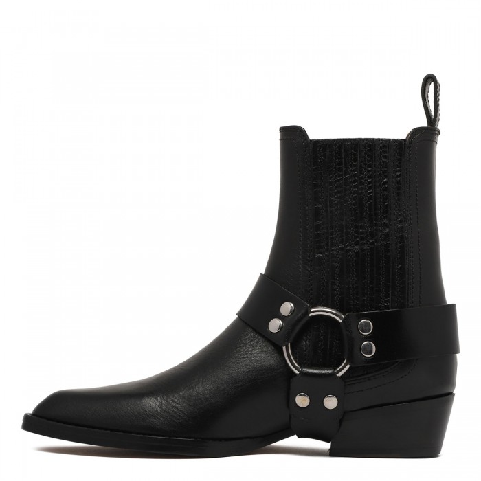 Black leather Helena booties from Paris Texas featuring back pull loop, metal ring detail, elasticated side panels, slightly squared toe, leather lining and insole, leather sole.