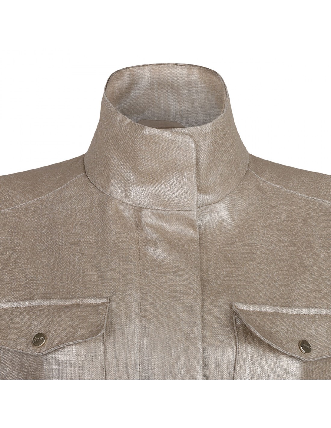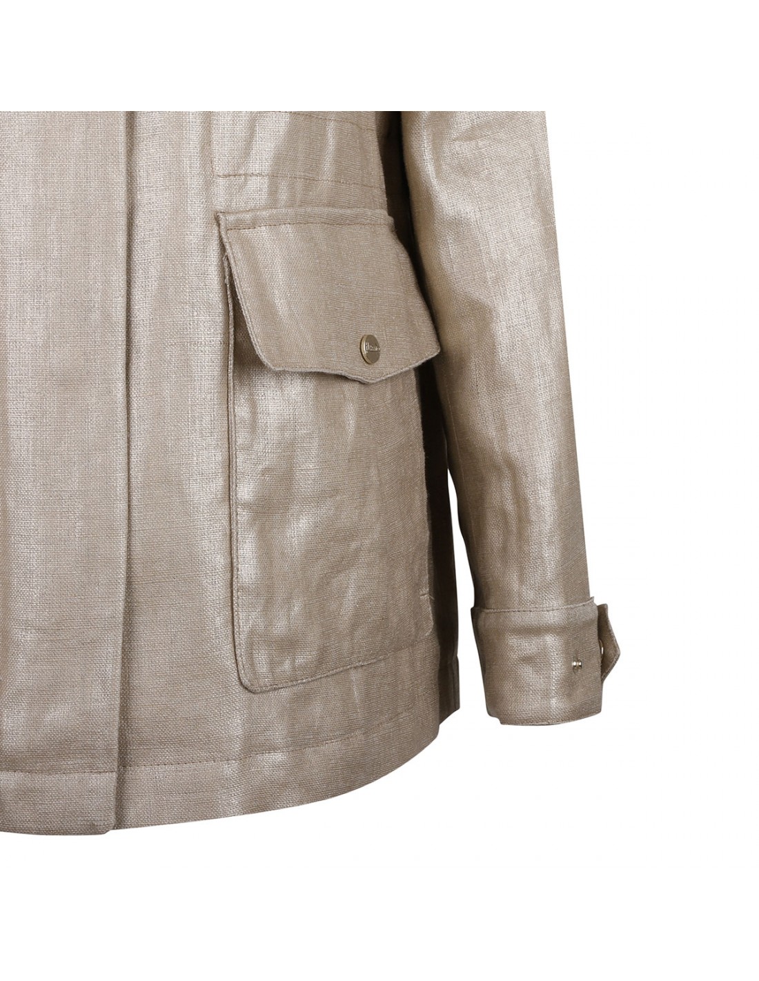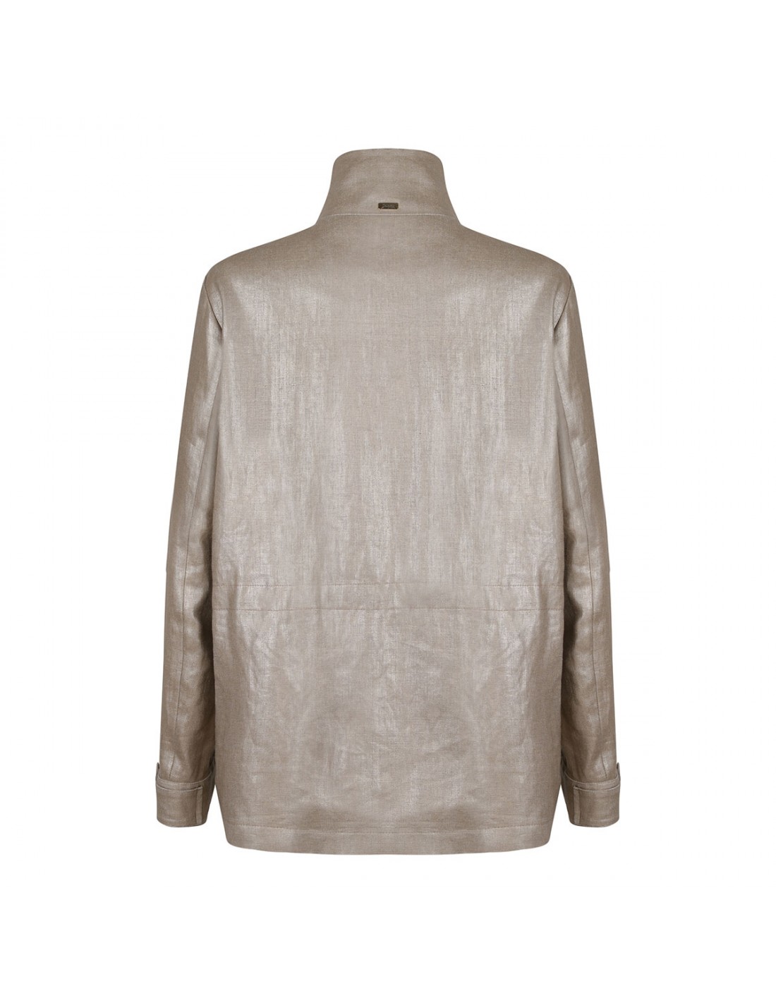 Gold-beige iridescent linen jacket from Herno featuring stand-up collar, concealed zip and snap fastening, four buttoned flap pockets, side slit pockets, adjustable waist, snaps on cuffs.