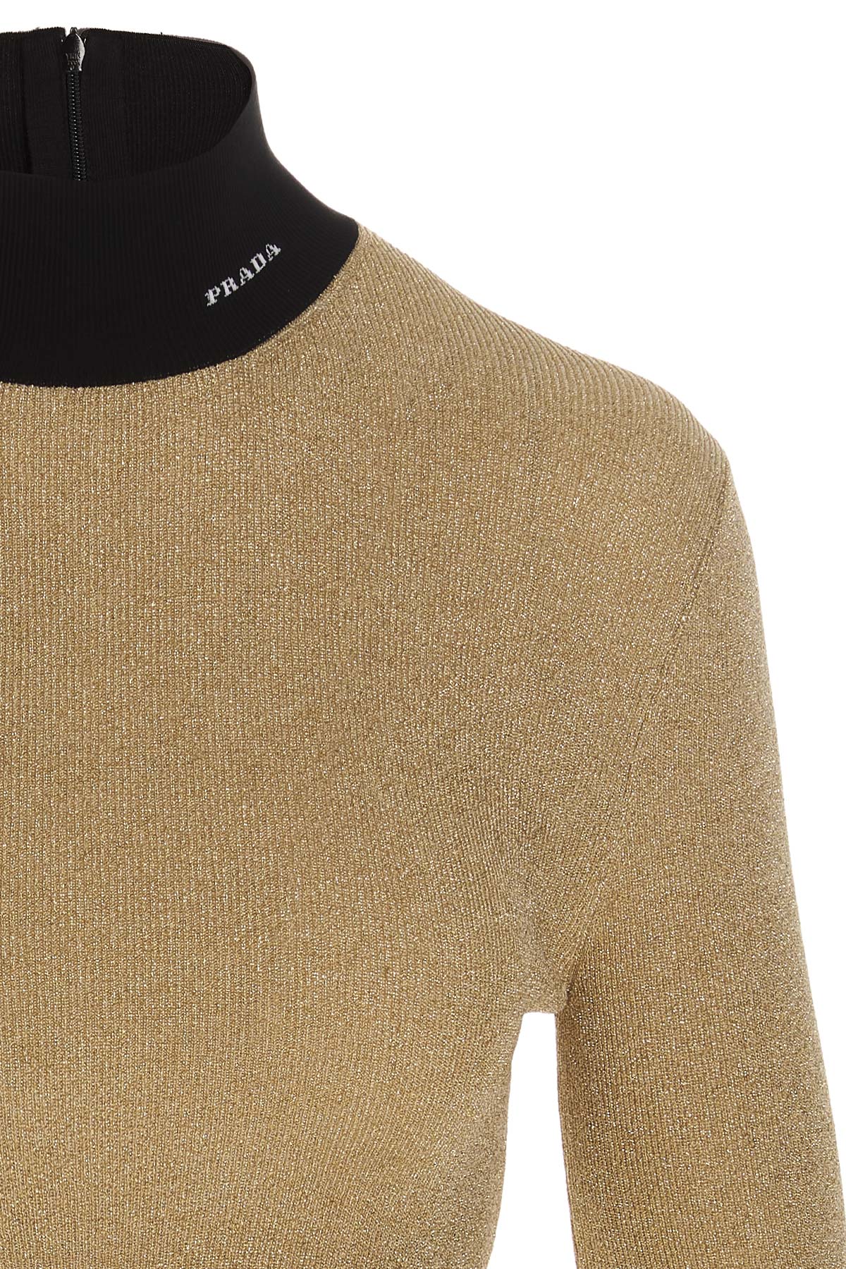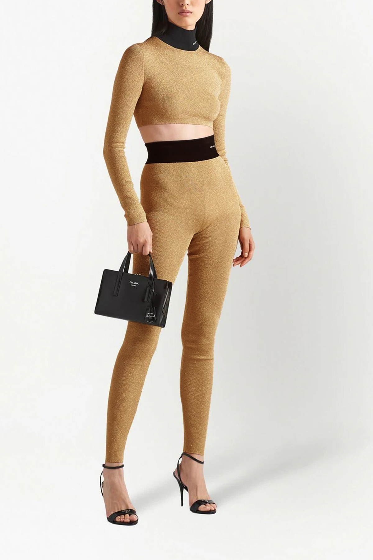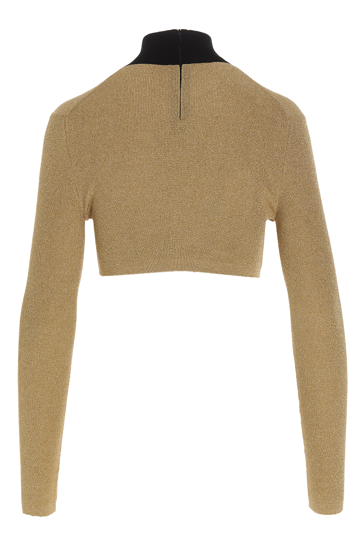 Lame top with contrast high collar with jacquard logo, back zip closure, long sleeves and a cropped style.
