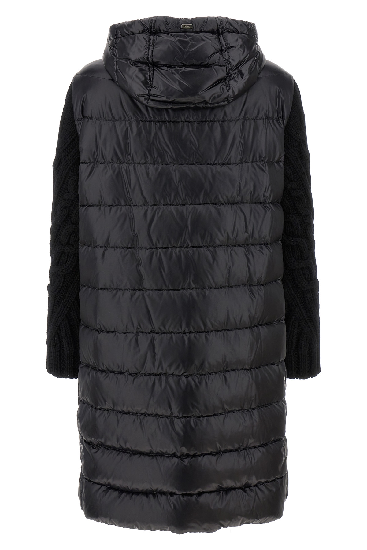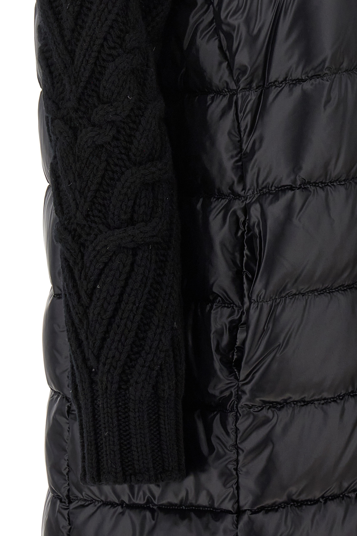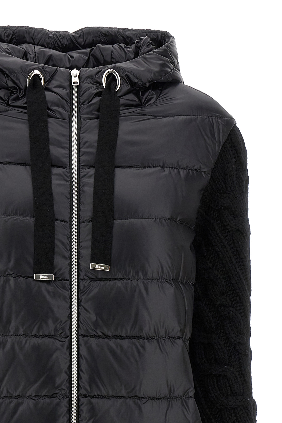 Quilted nylon down jacket with goose feather padding, long wool knit sleeves, hood, zip closure, pockets.