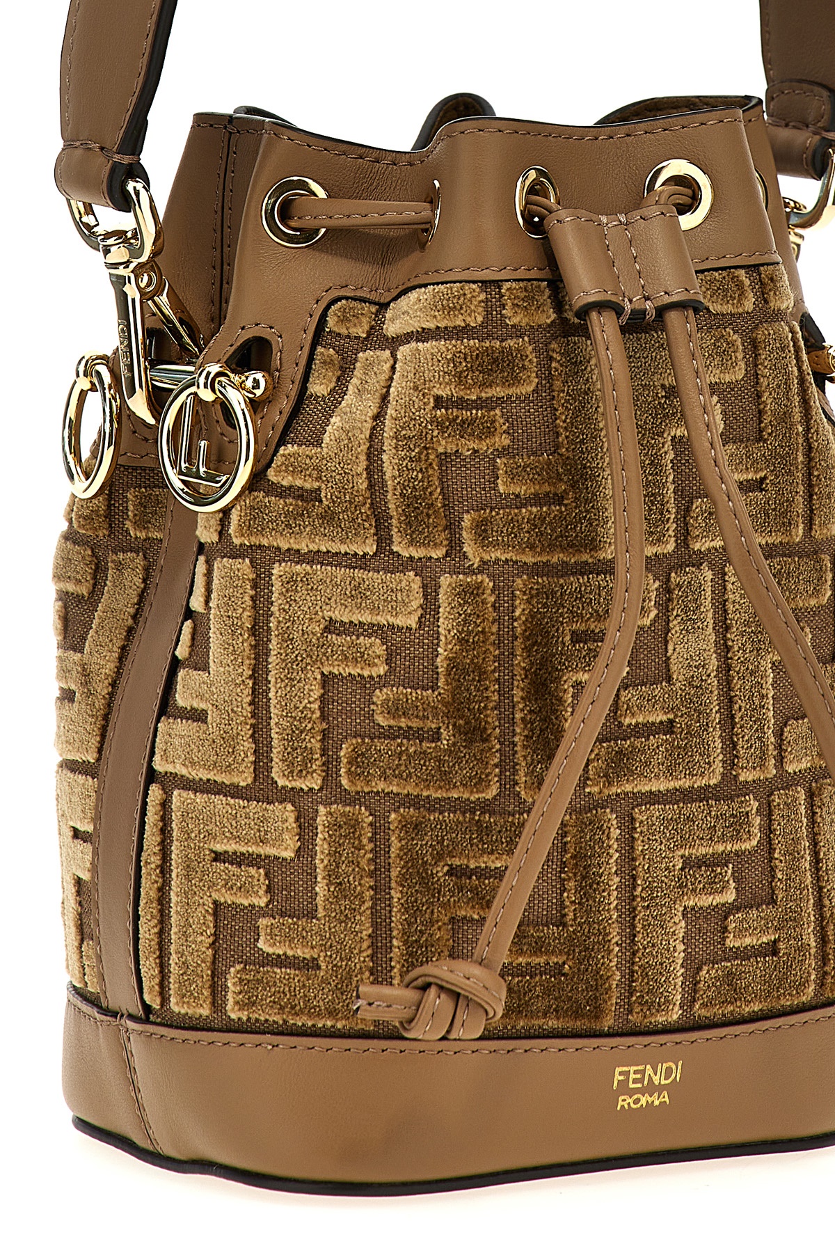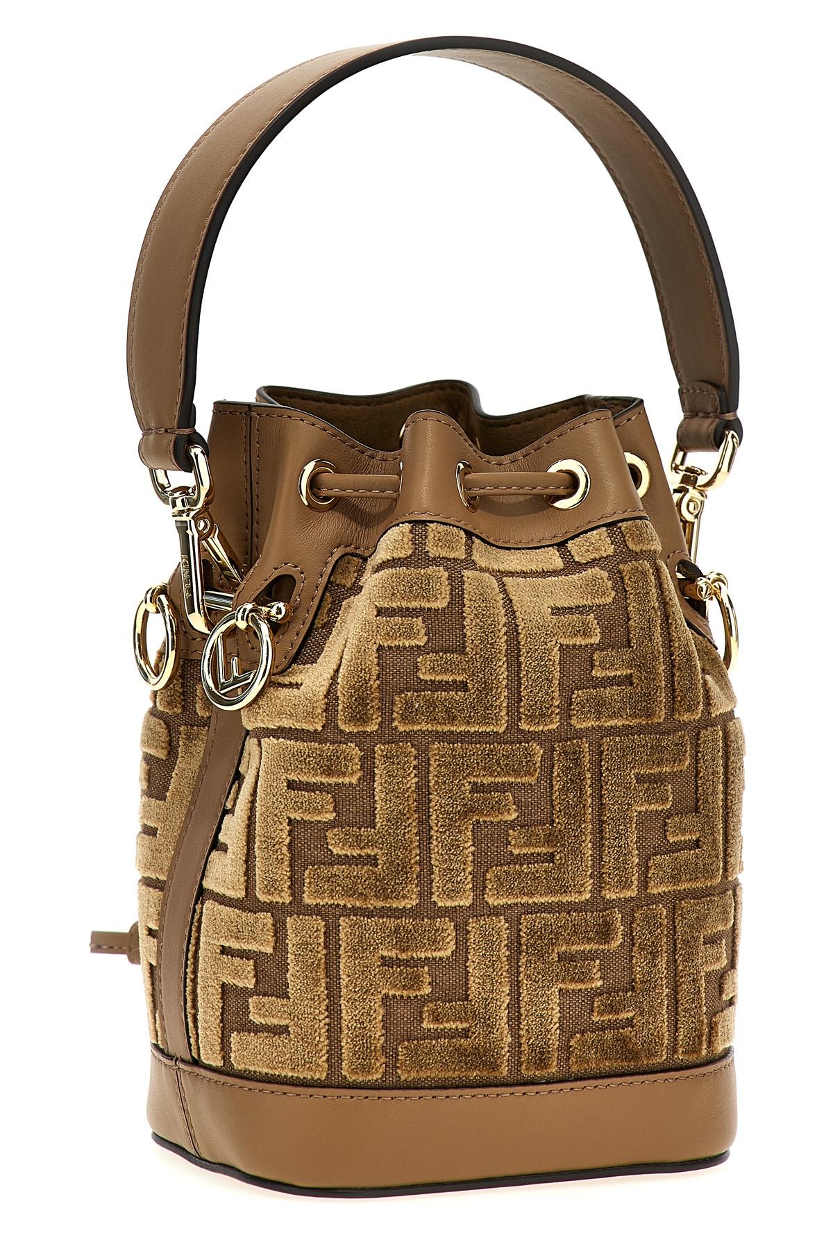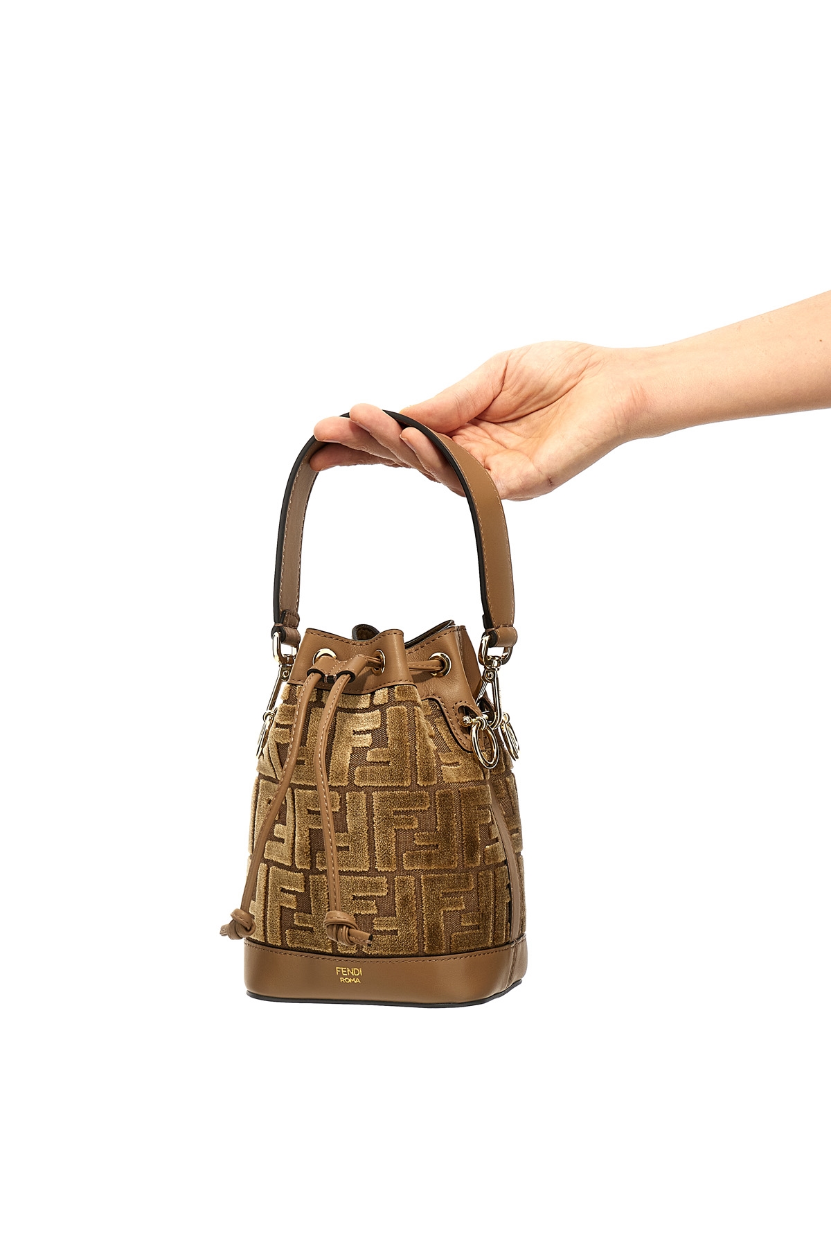 FF jacquard all-over mini leather and velvet mini handbag Mon Tresor with drawstring closure, removable short handle, and removable long shoulder strap.