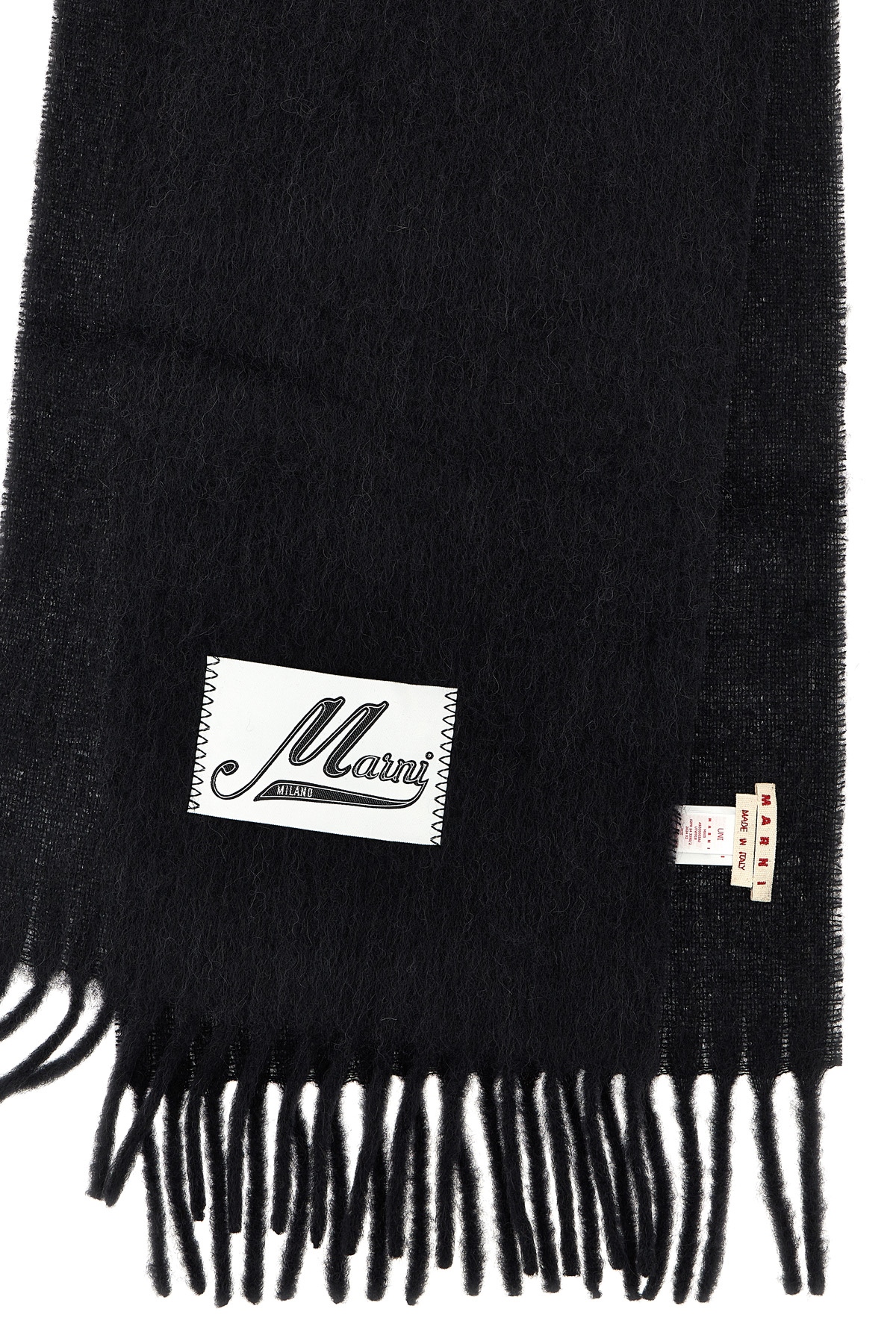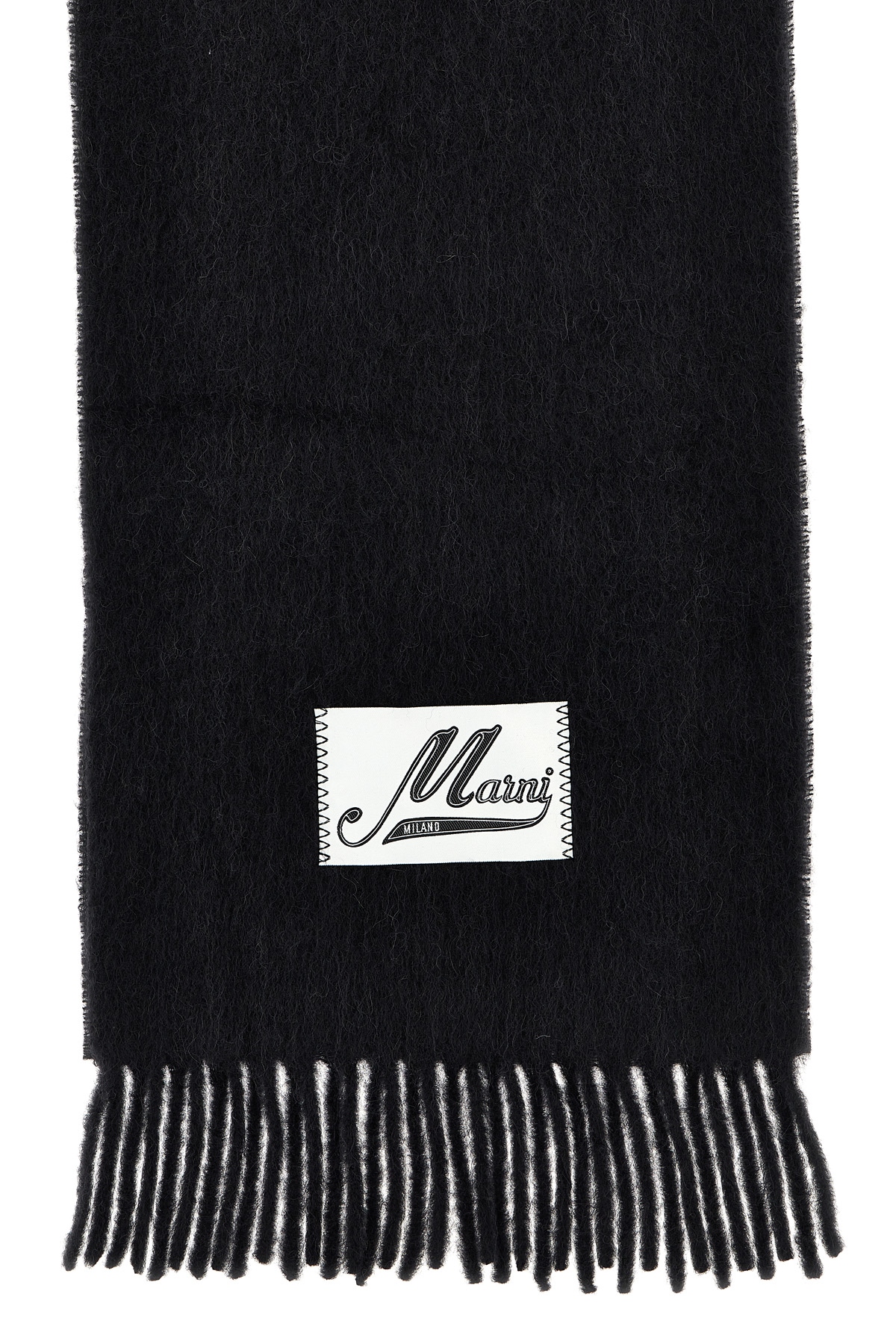 Scarf in brushed alpaca blend, logo patch, fringes at the edges.