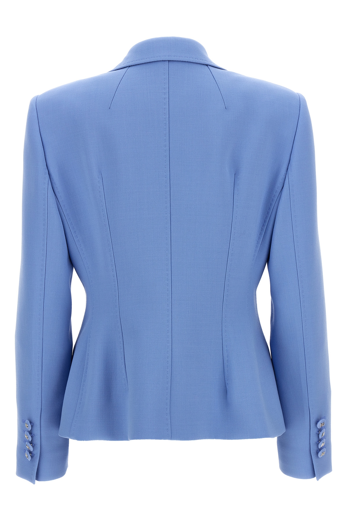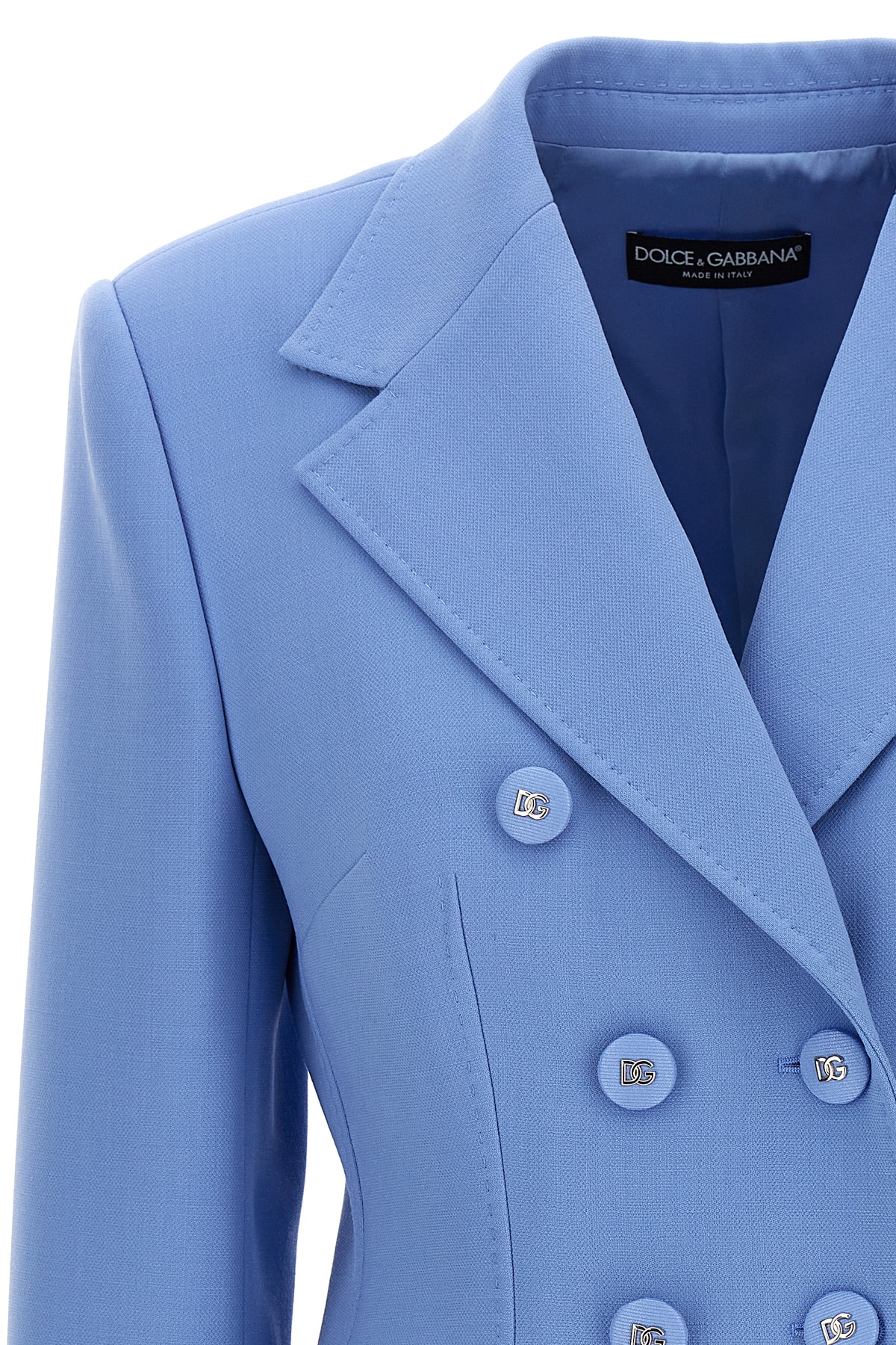 Double-breasted wool blazer with flared style, front closure with logo buttons, slightly padded shoulders, long sleeves with buttons on the logo hem.