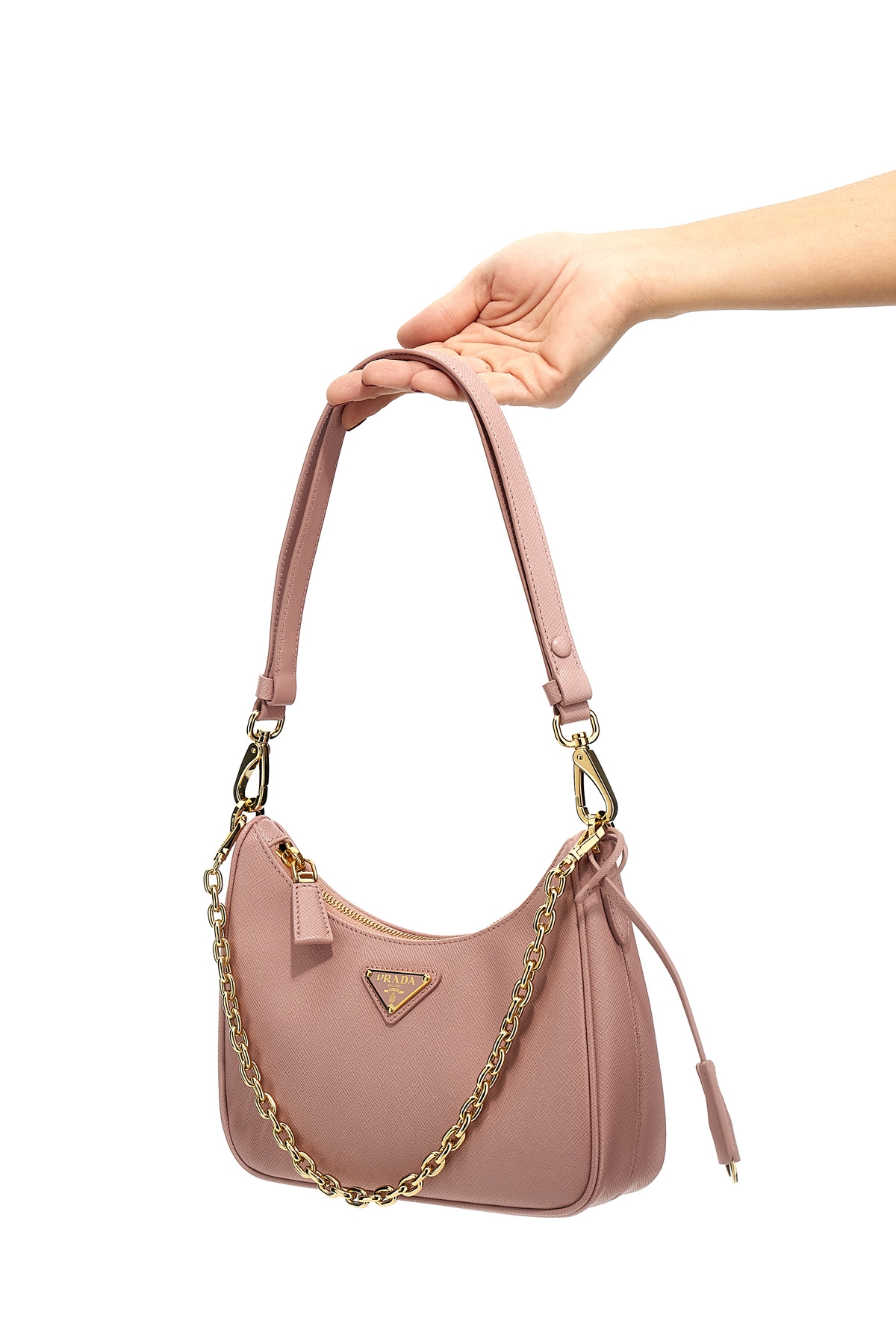 'Re-Edition' mini shoulder bag in Saffiano leather with zip closure, removable leather handle, removable chain handle, front enameled metal triangle logo, and removable leather and metal key ring.