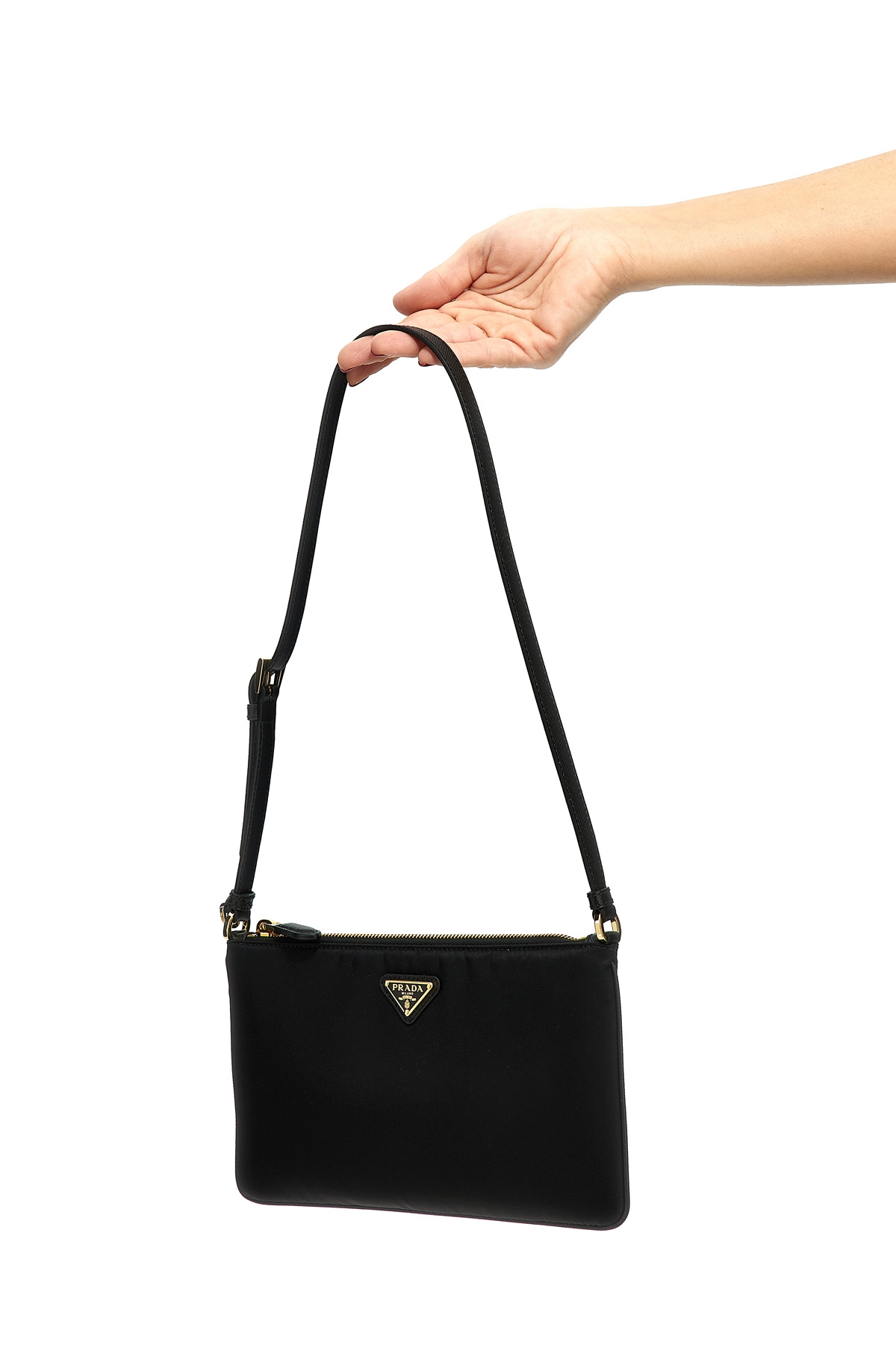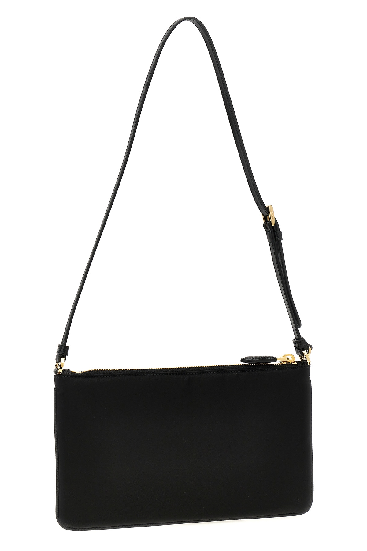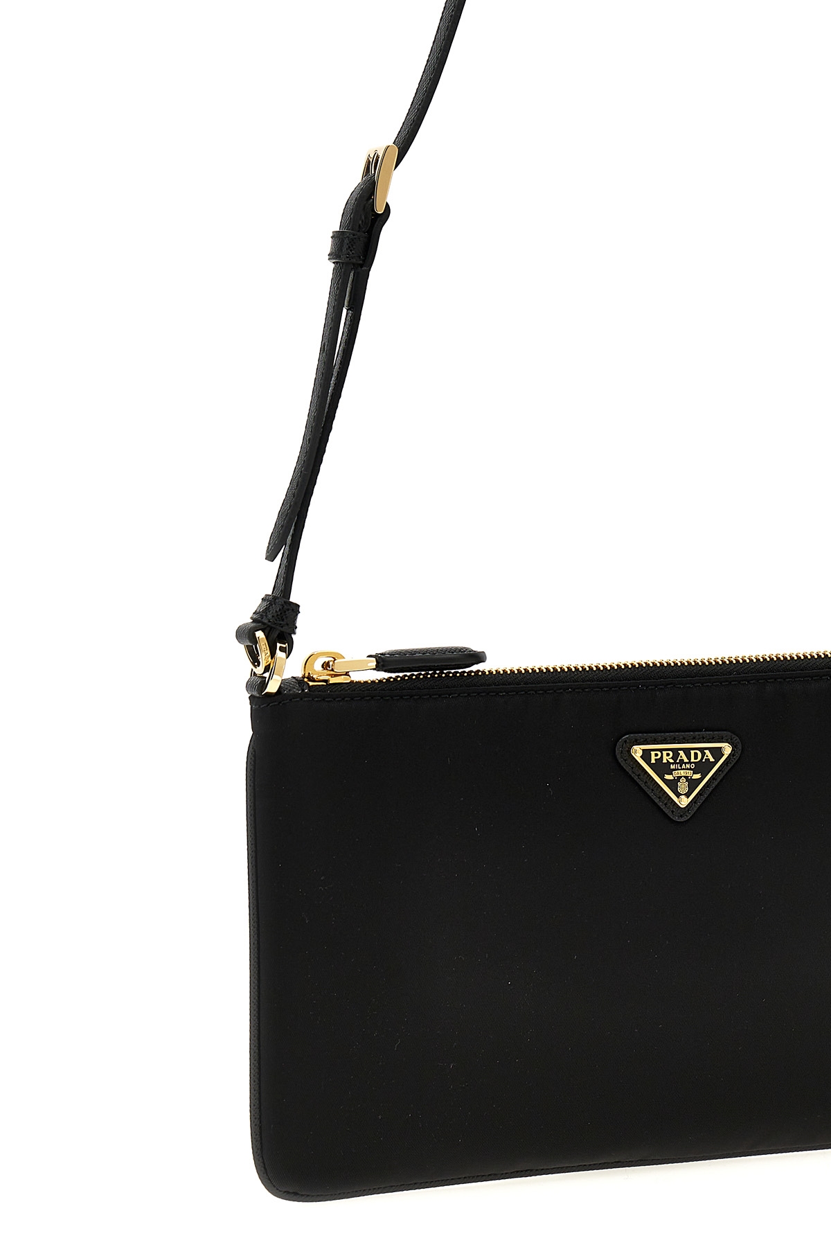 Re-Nylon and Saffiano leather shoulder bag, front enameled metal triangle logo, adjustable handle, zip closure, metal details.