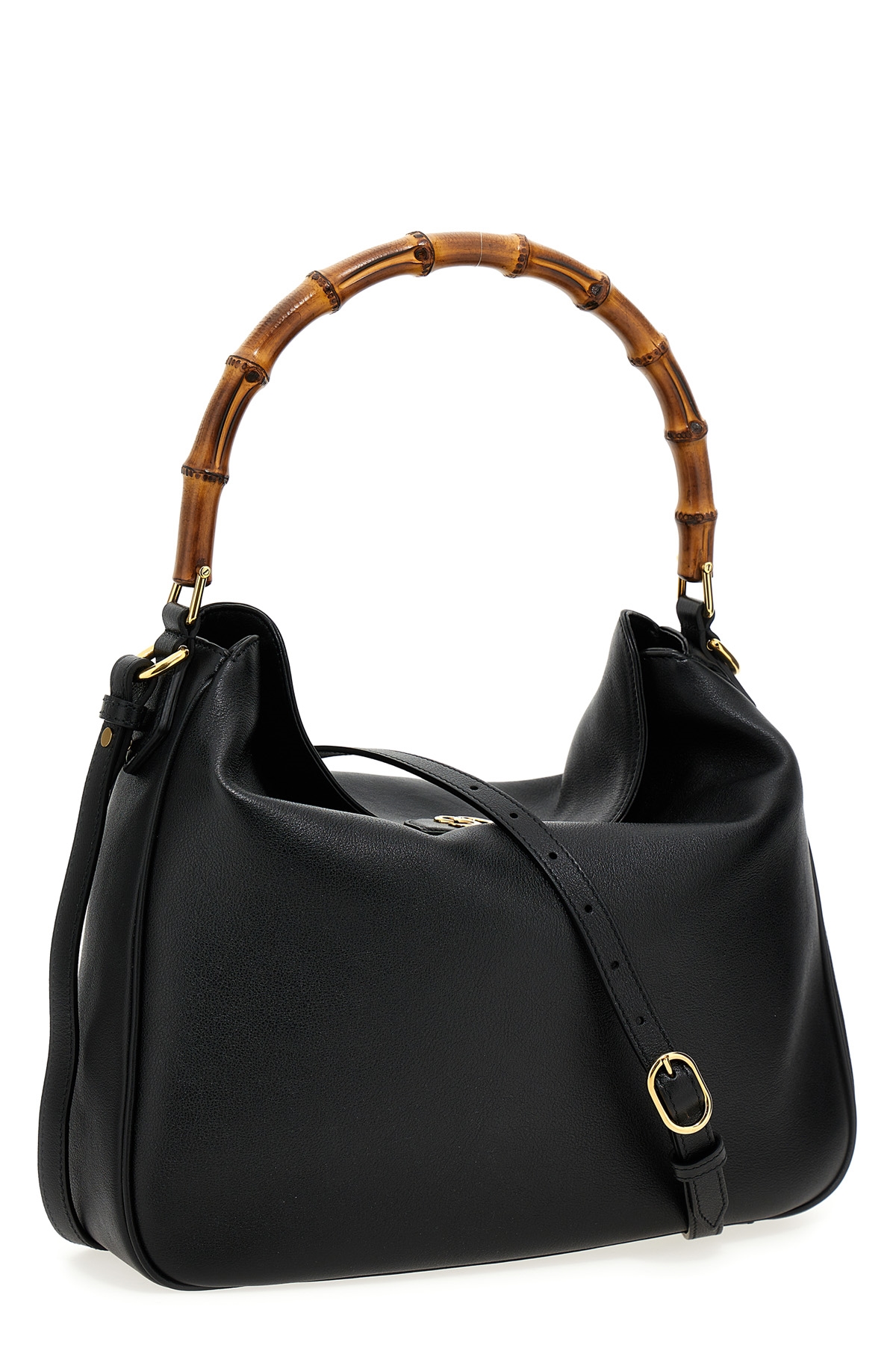 Diana large shoulder bag in leather with gold metal details, microfiber suede lining, Double G, bamboo handle, adjustable and removable leather shoulder strap, and magnetic closure.