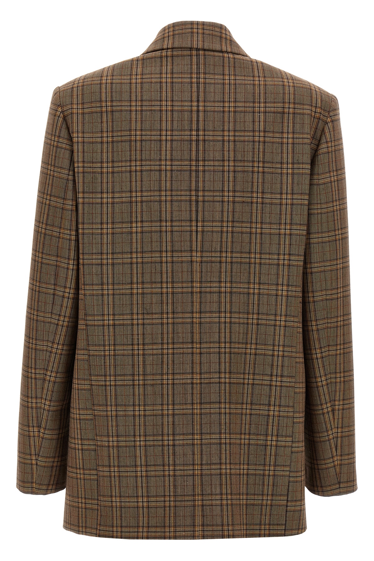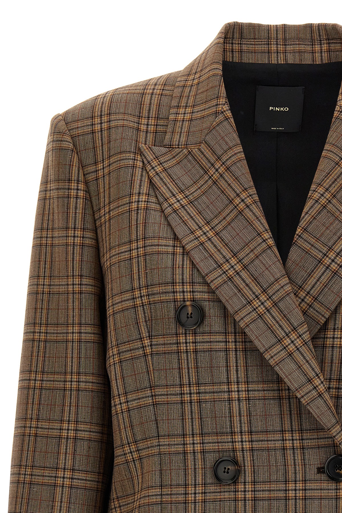 'New Guinea' double-breasted blazer in wool blend with check print, button closure, peak lapels, long sleeves, pockets, padded shoulders, lining.