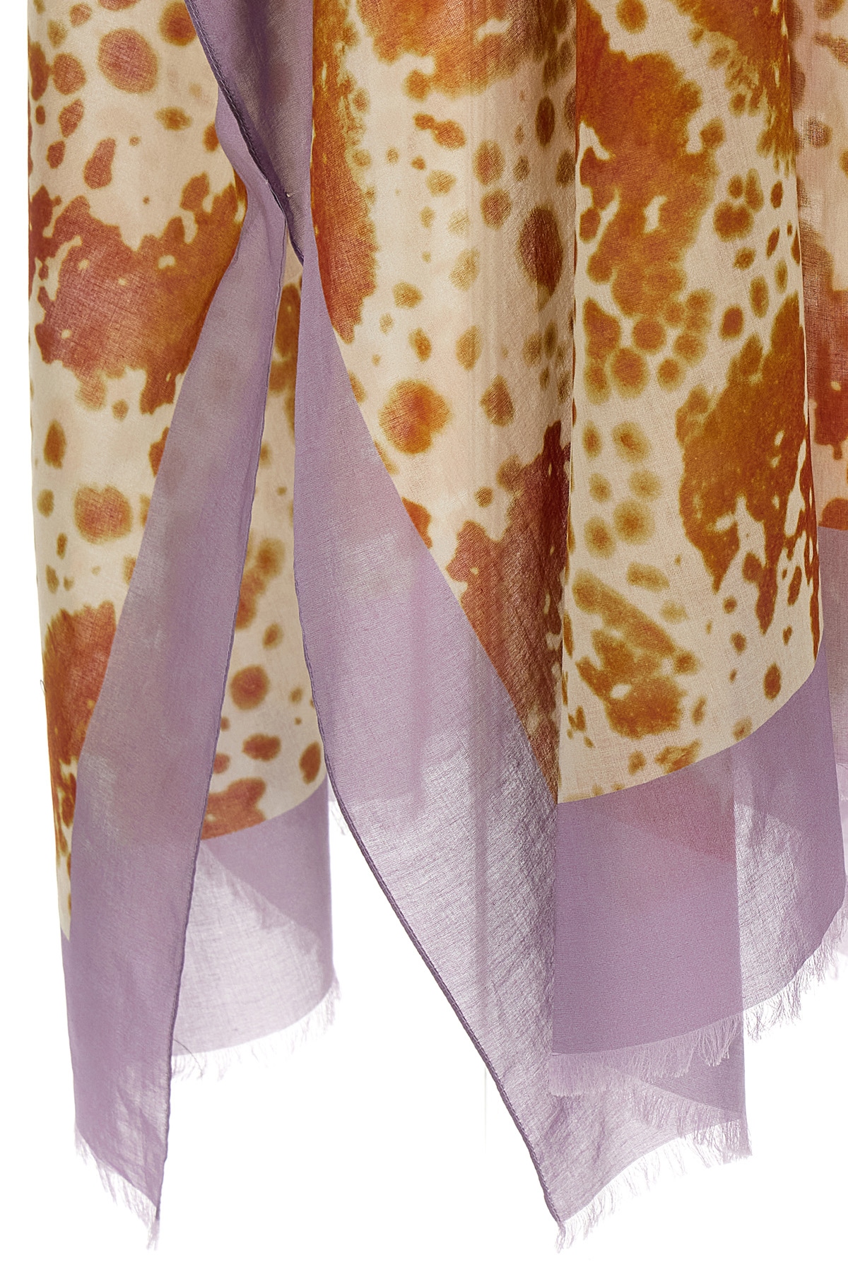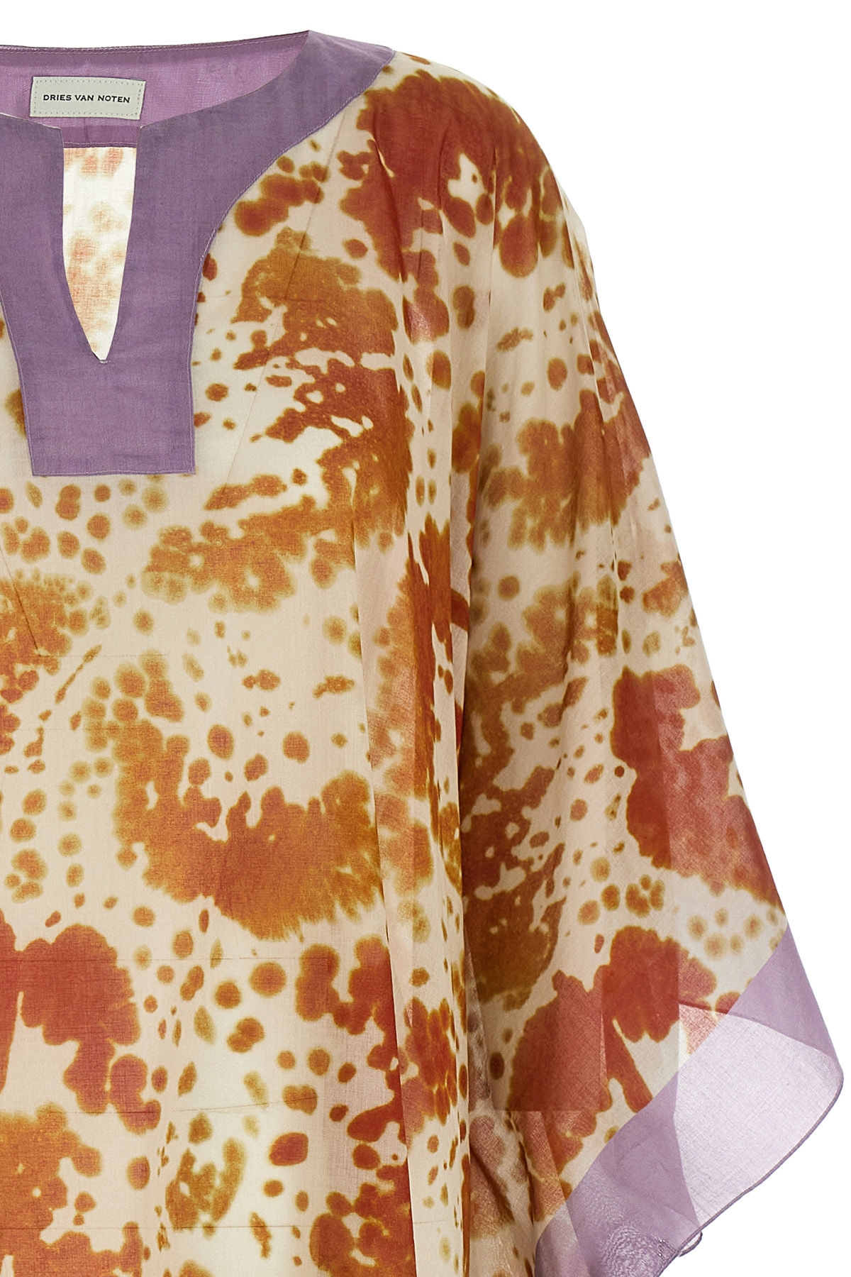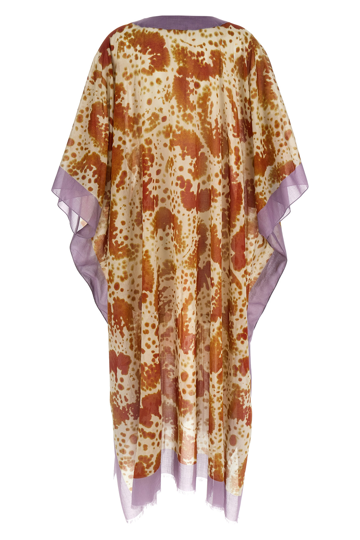 'Cartland' printed cotton kaftan with contrast piping, V-neck, side slits, 3/4 wide sleeves, fringes on the hem.