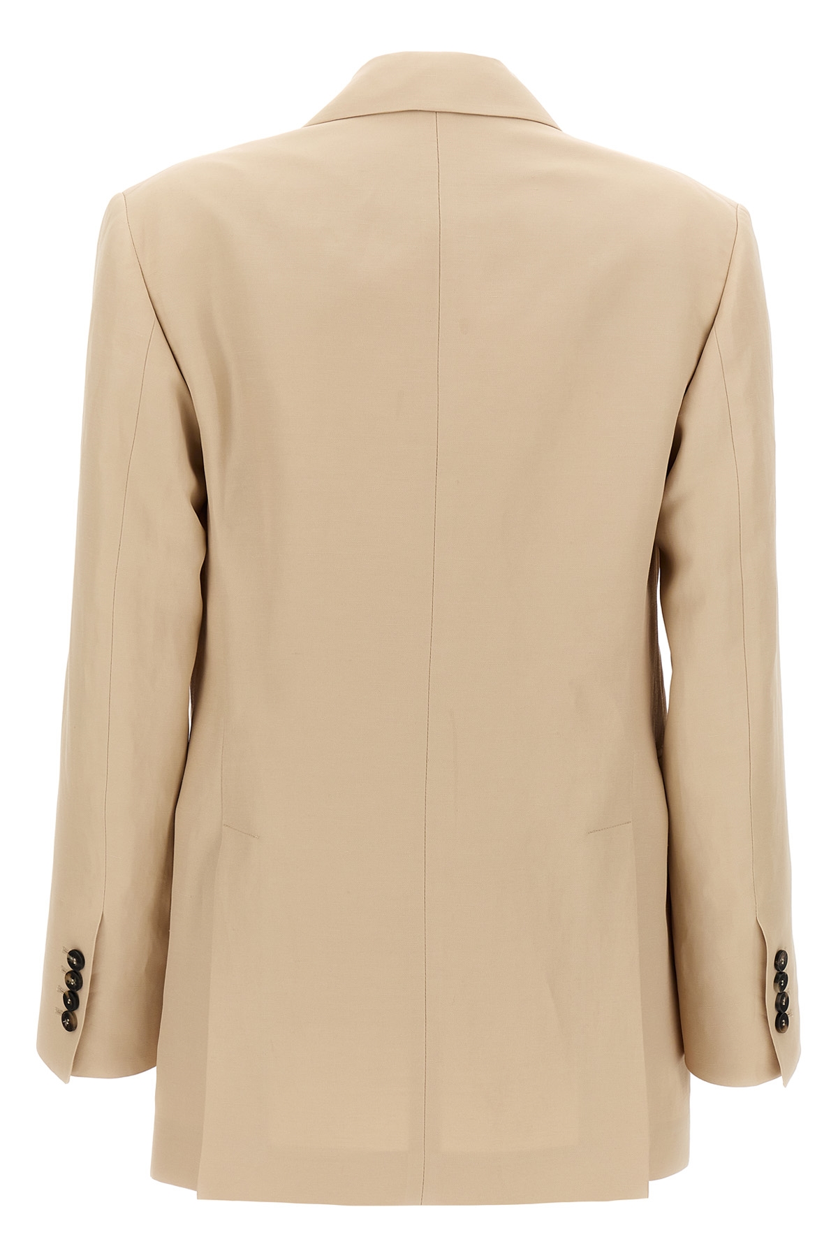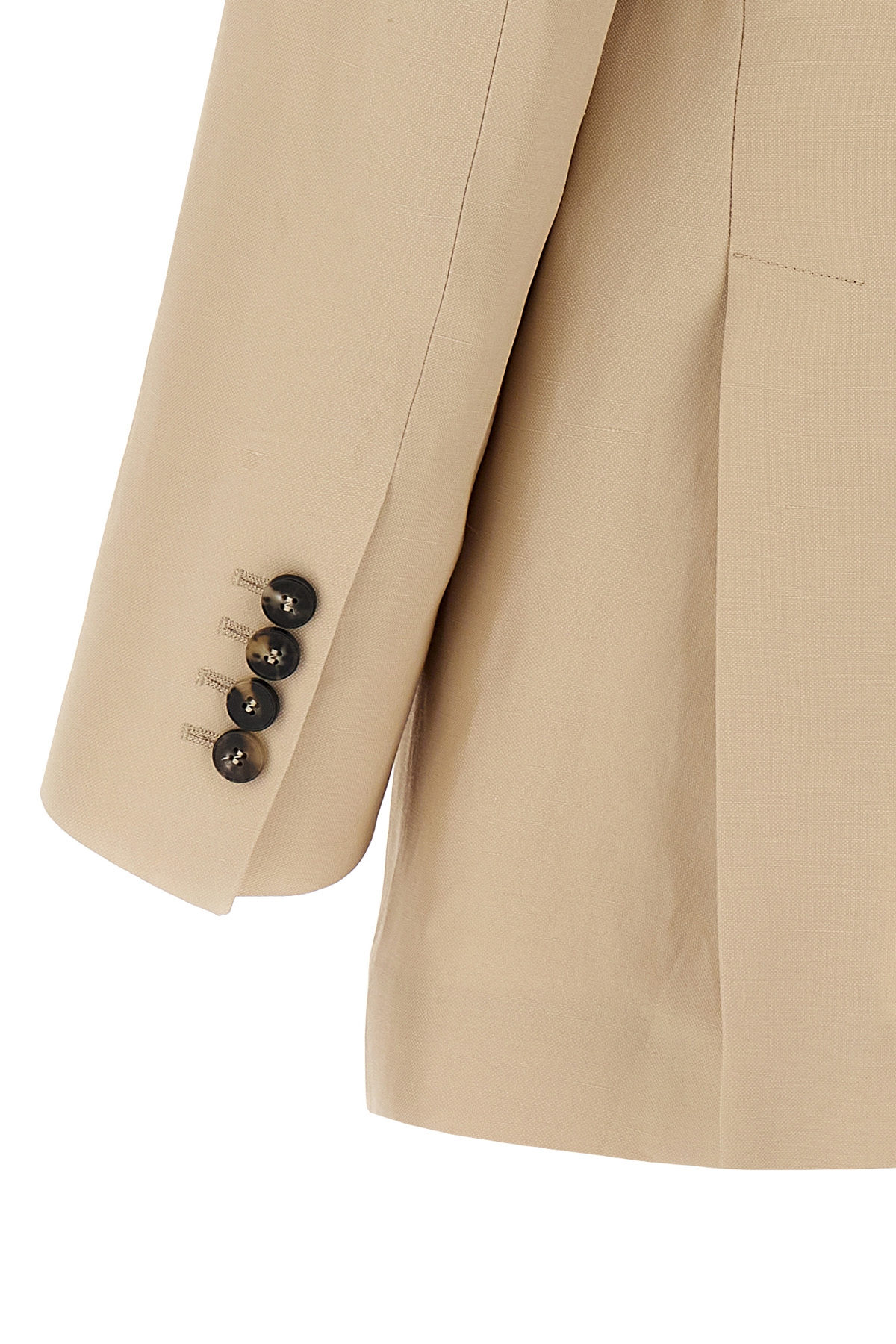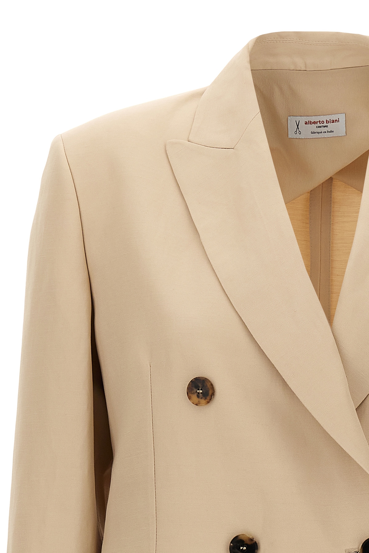 Double-breasted viscose and linen blazer with button closure, peak lapels, long sleeves, pockets, back vents, and slightly padded shoulders.