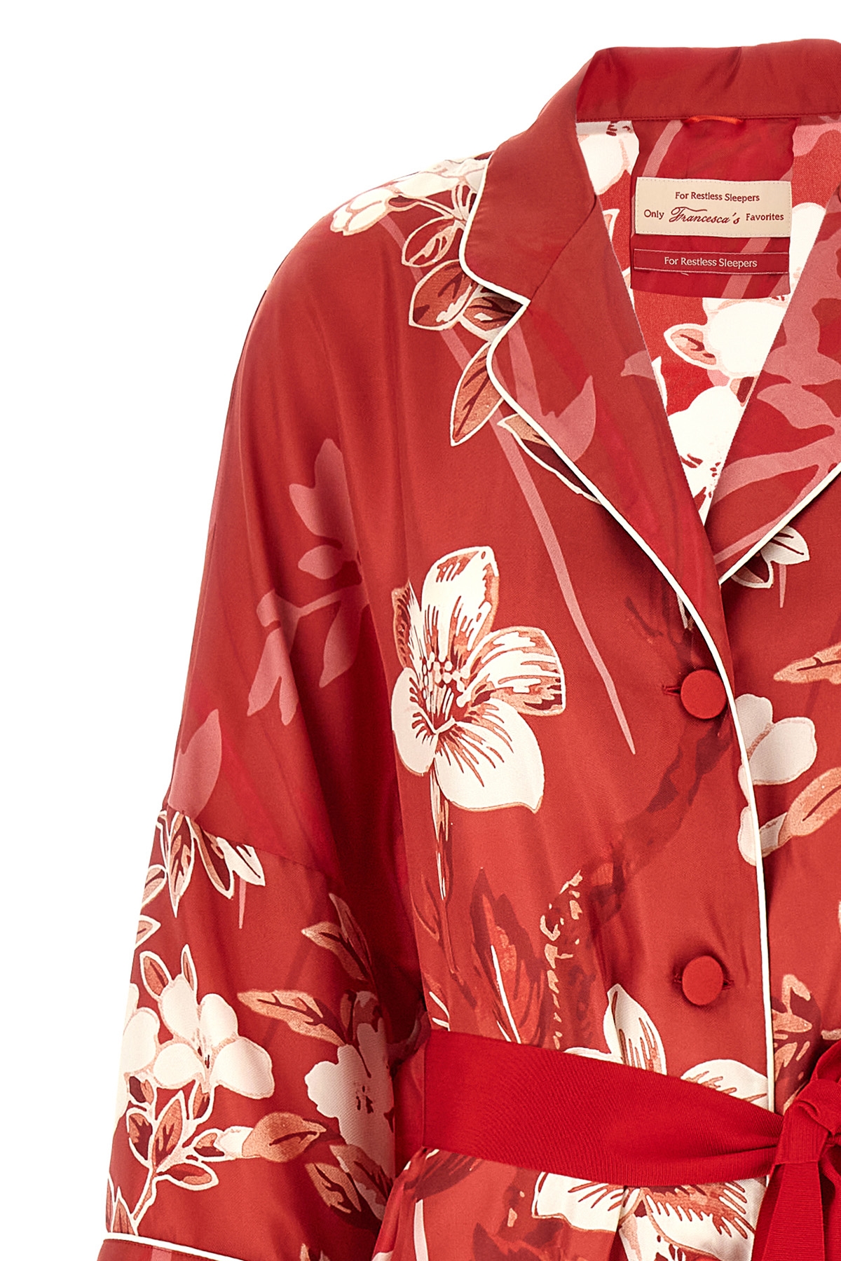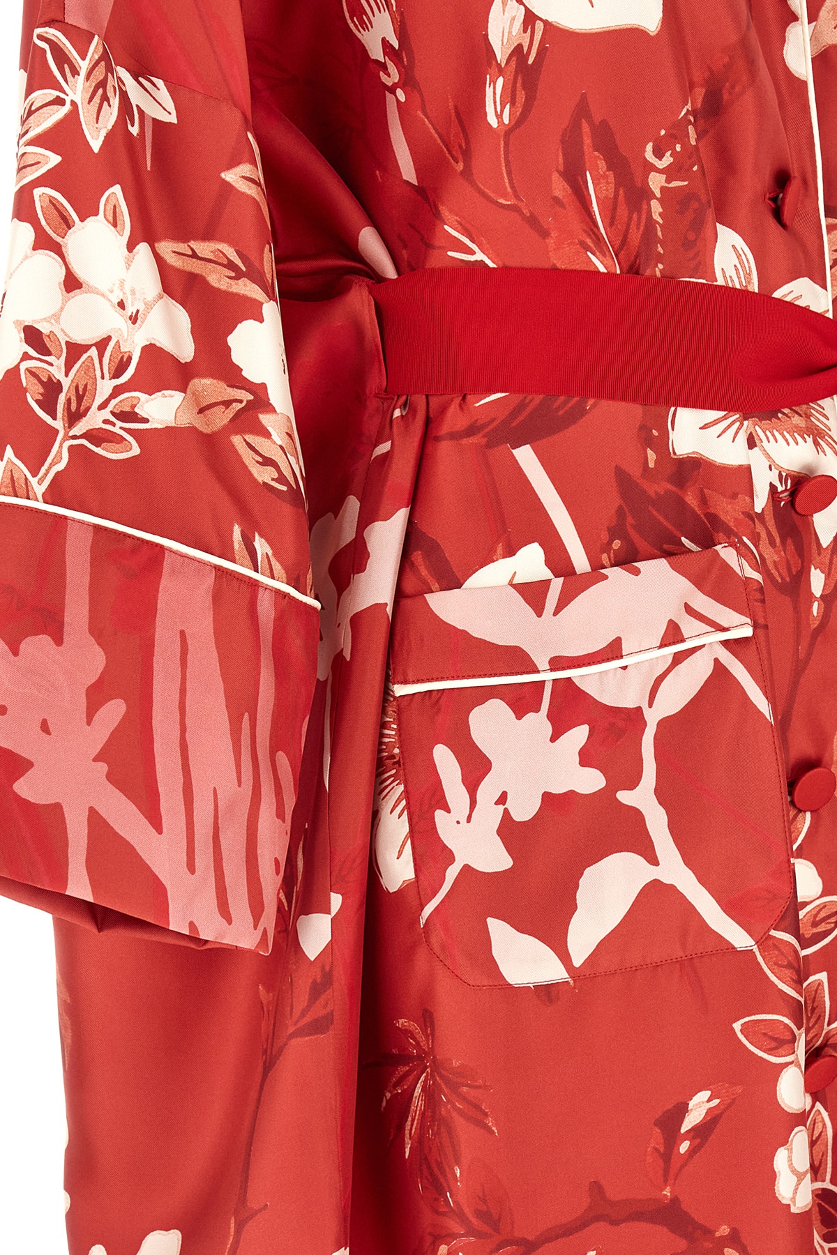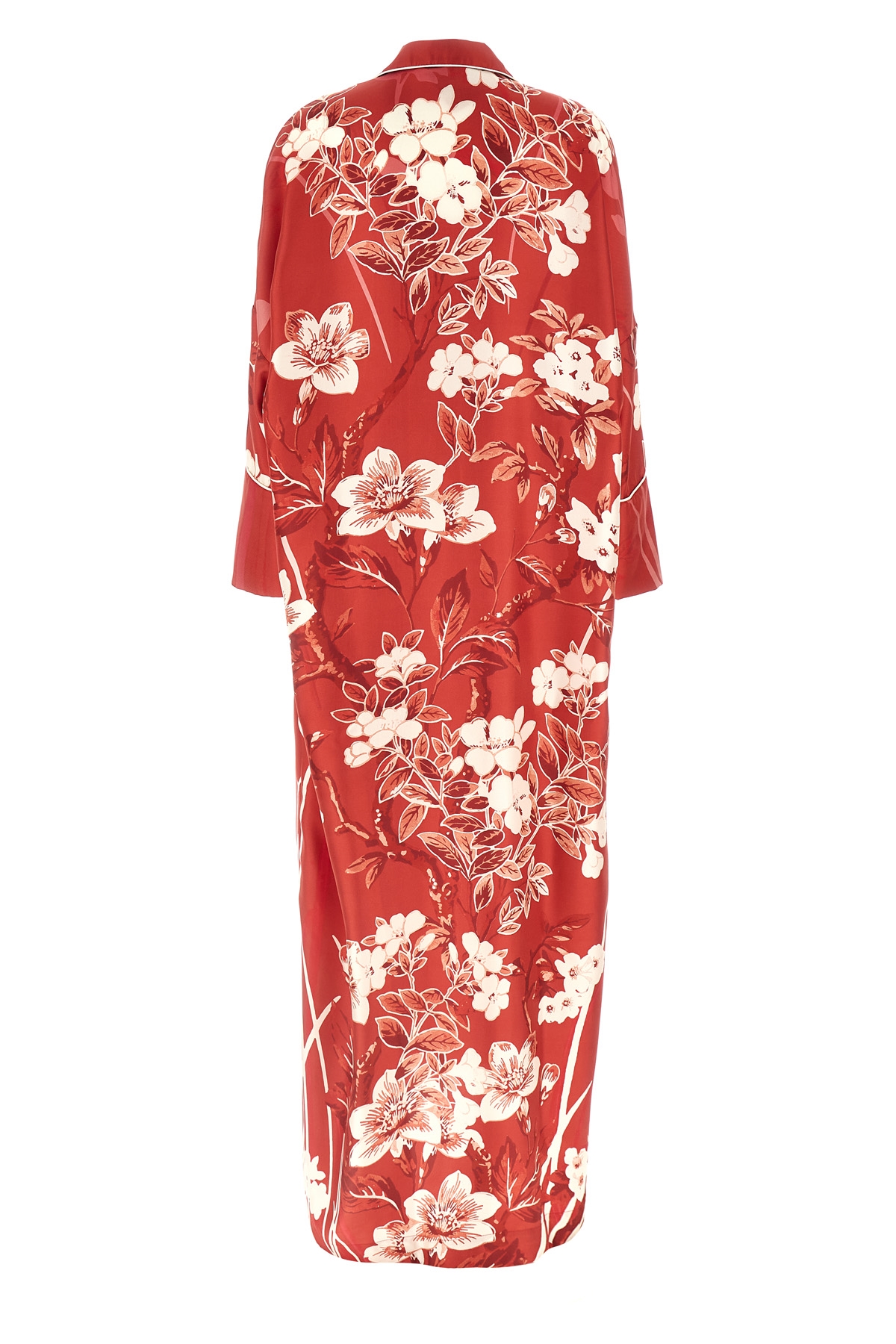 Derinoe' silk dress with floral branch print, wallet style, contrast piping, pockets and shawl collar.