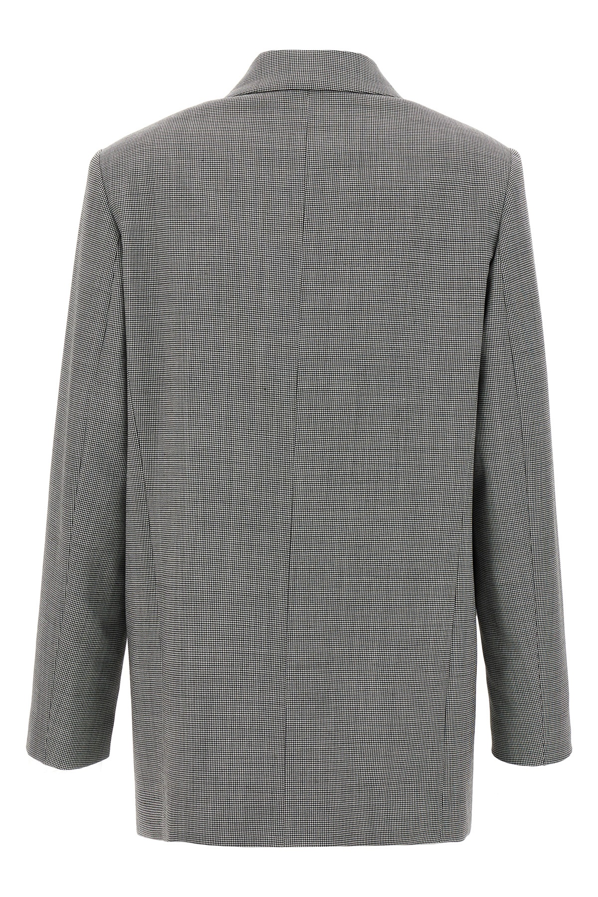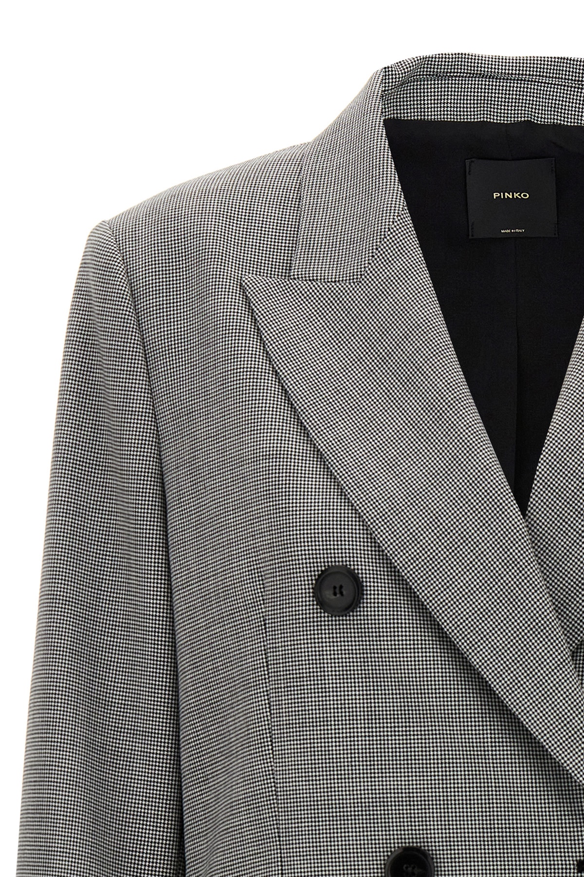 'New Guinea' double-breasted wool blend blazer with houndstooth print, button closure, peak lapels, long sleeves, pockets, padded shoulders, lining.