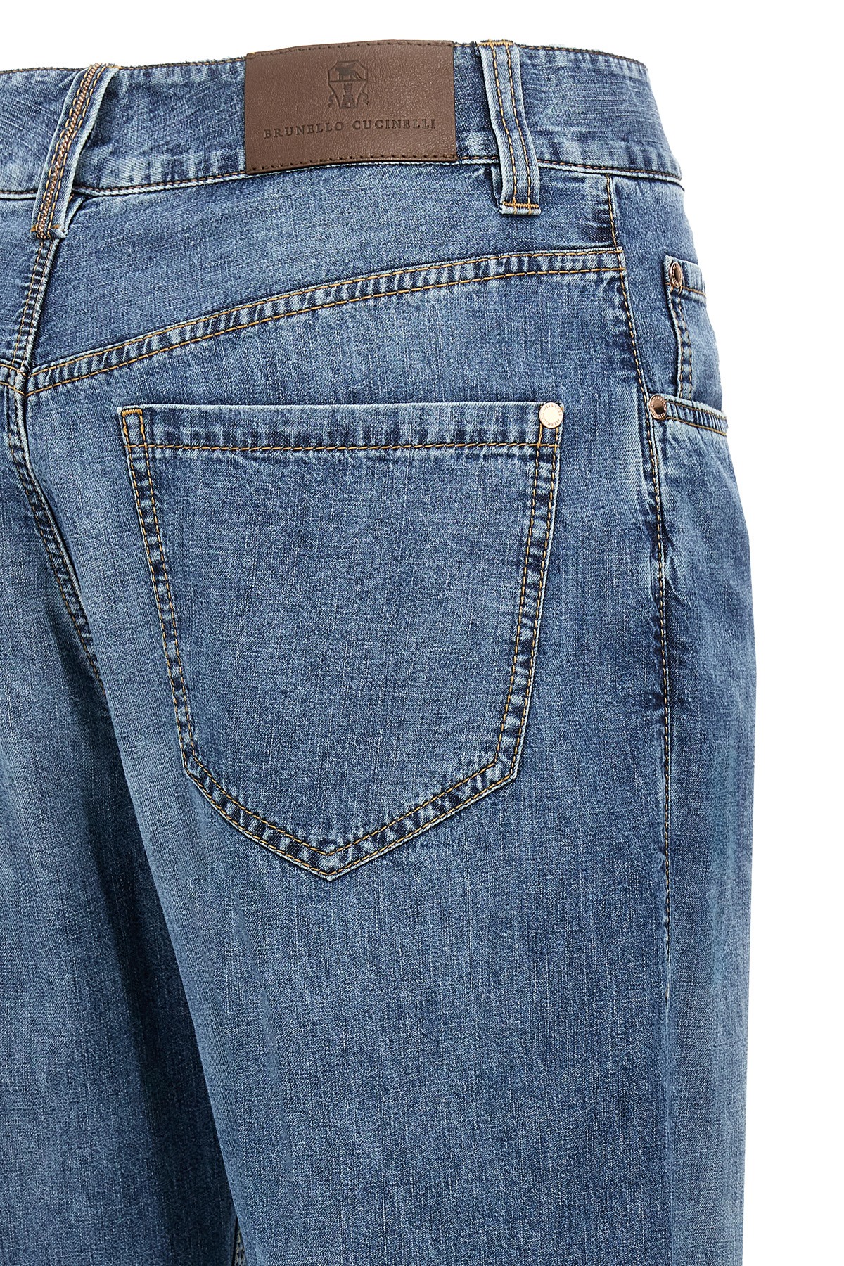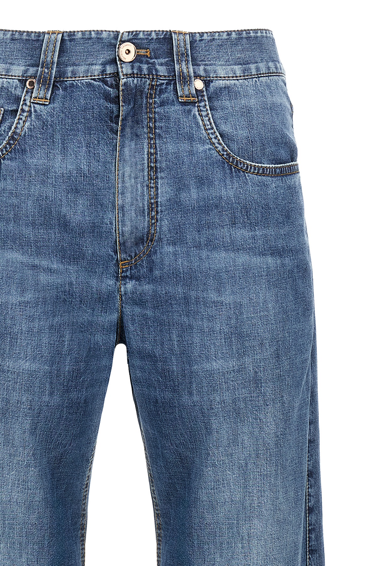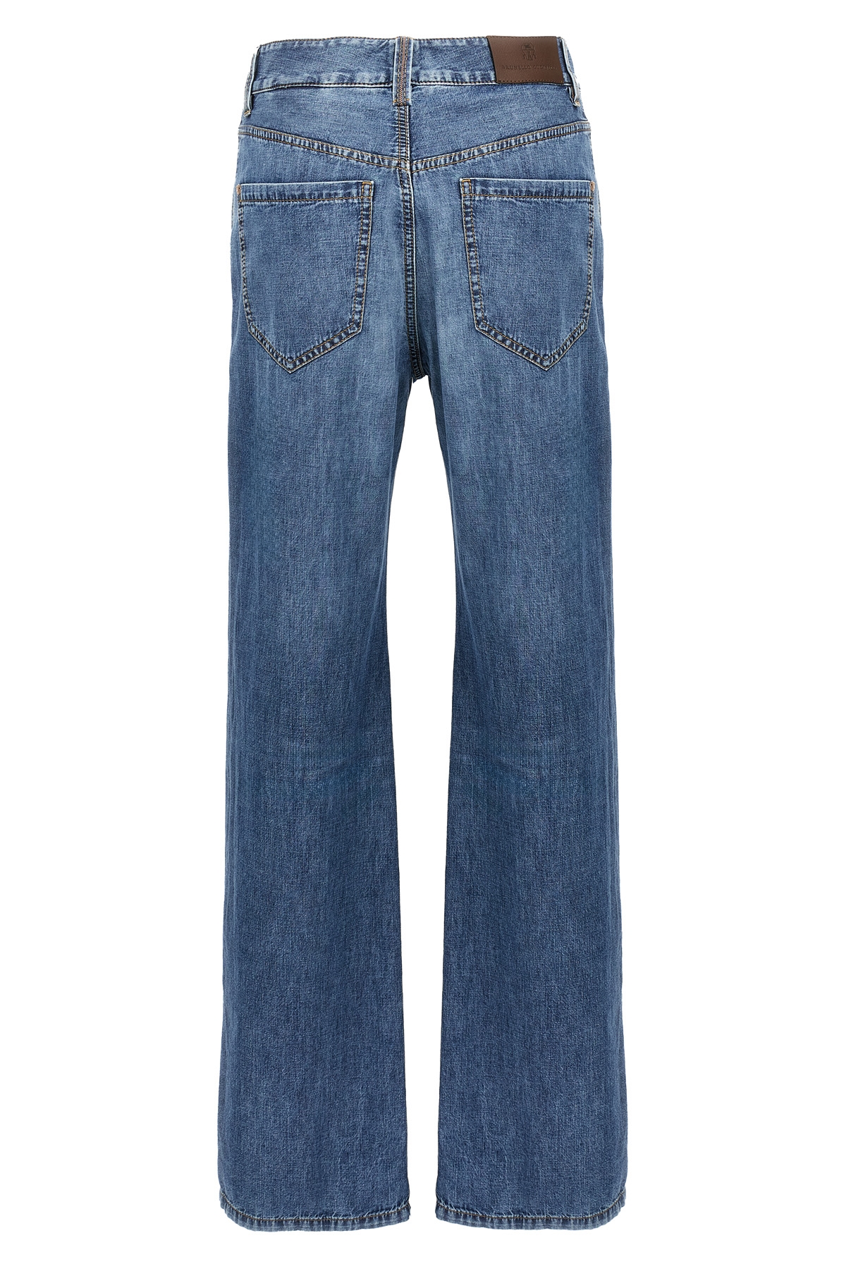 Delave cotton denim jeans with Monile detail on the back, straight leg, zip and button closure, five pockets, and leather logo label on the back.