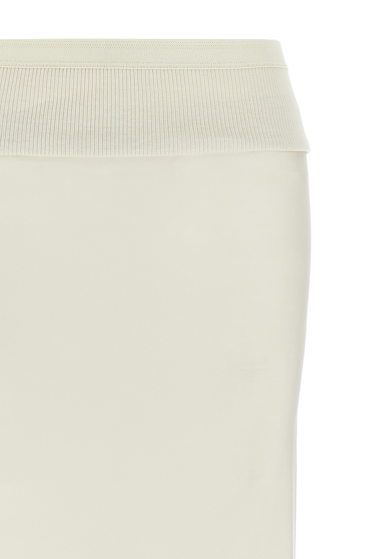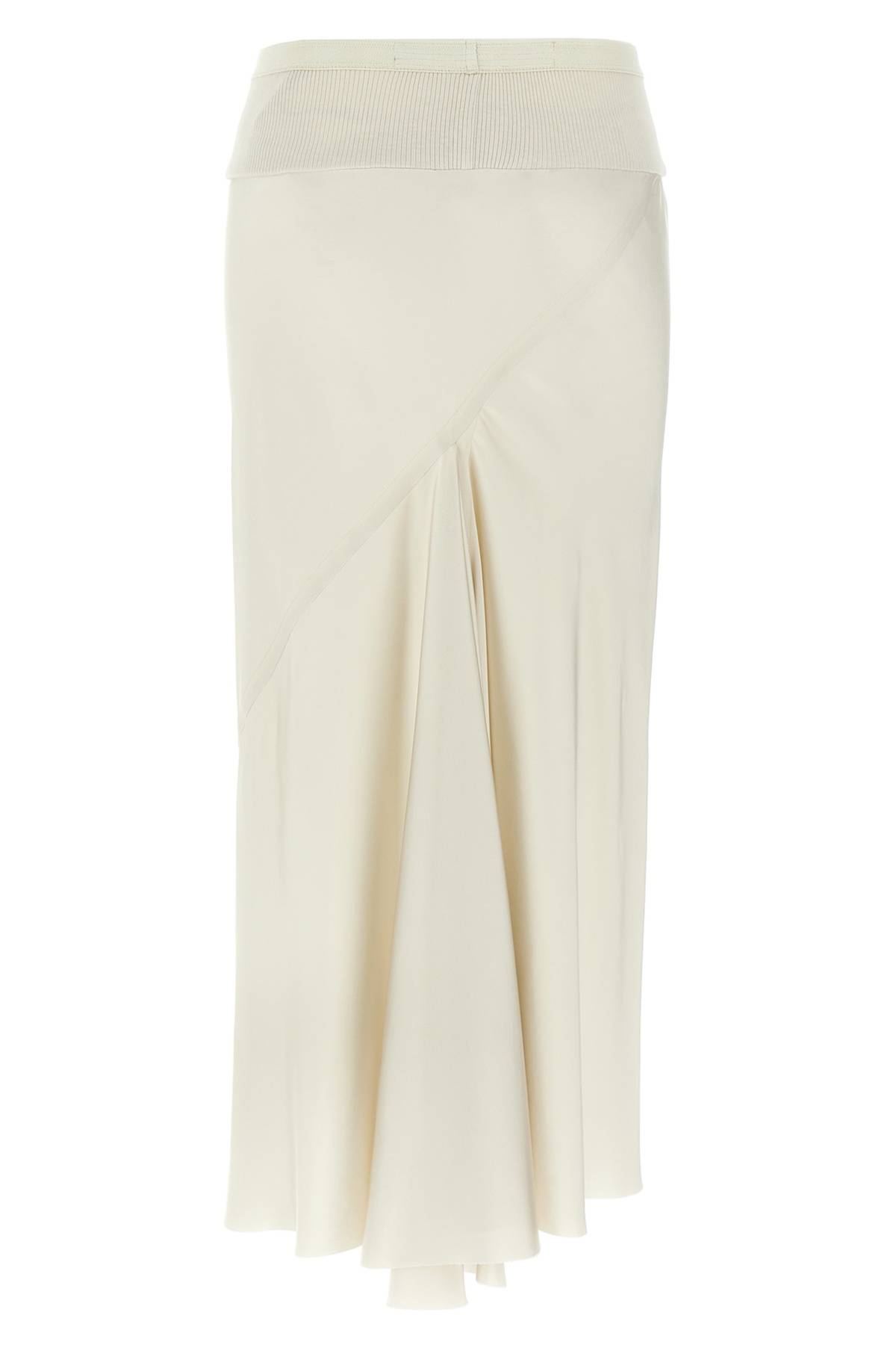 'A Line Bias' viscose blend midi skirt, stretch ribbed knit band at the waist, mermaid style with flounced back.