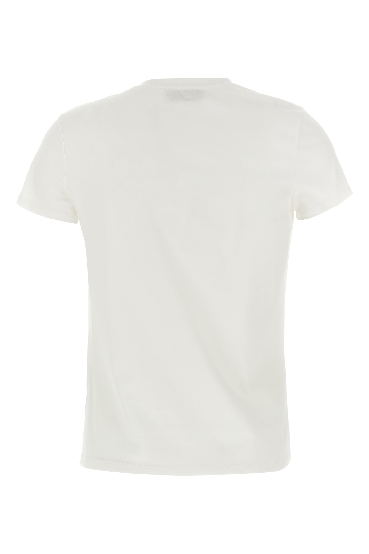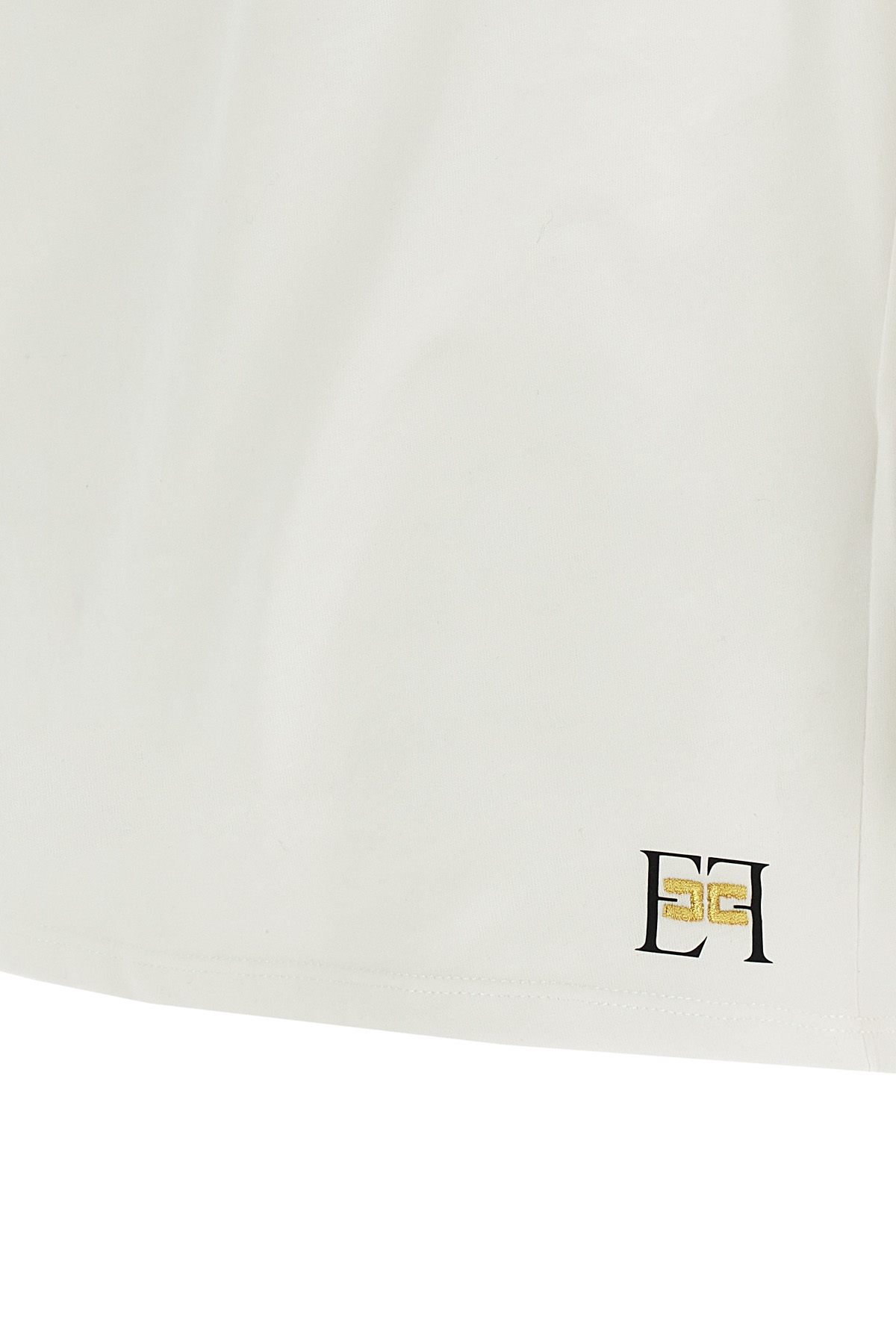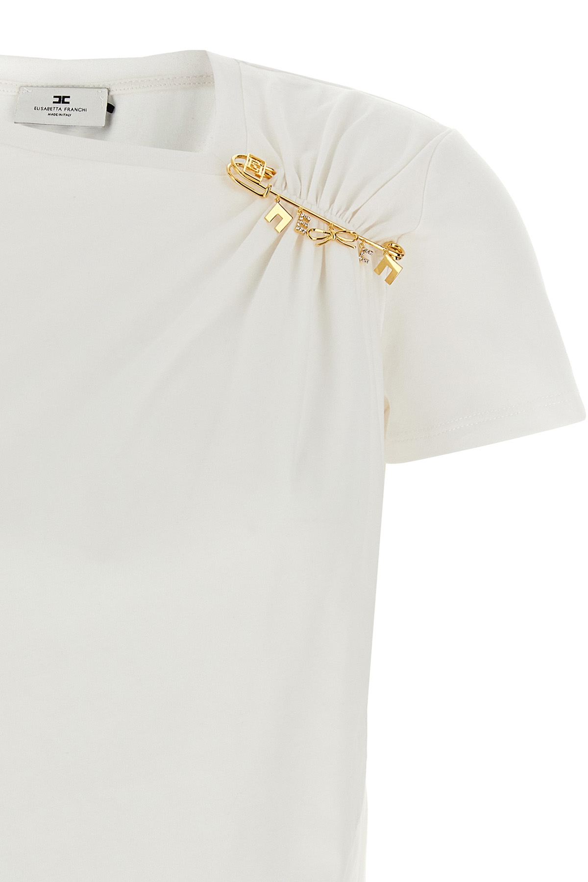 Stretch cotton jersey T-shirt, with asymmetric neckline with gold metal brooch with charms, front logo embroidery, and short sleeves.