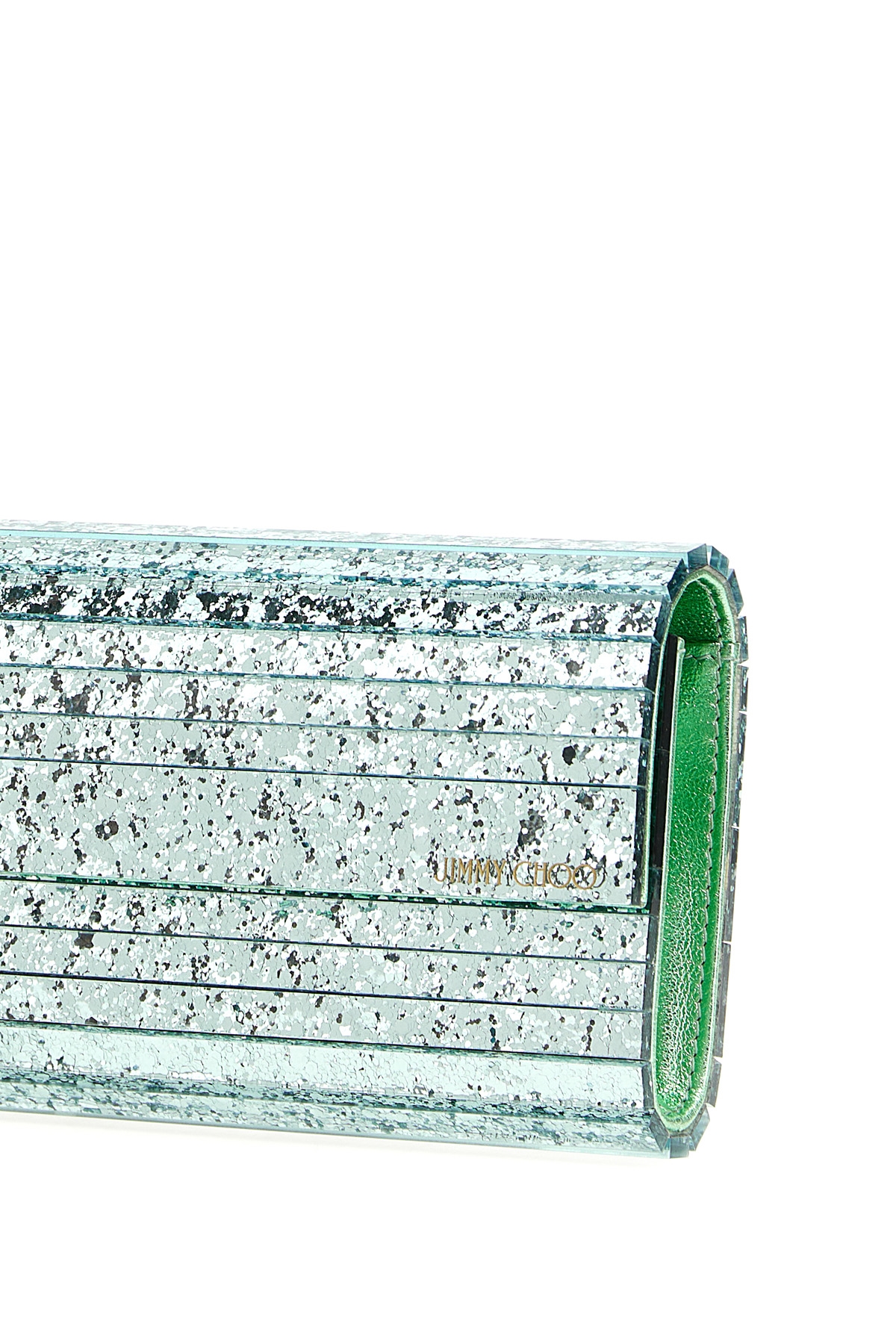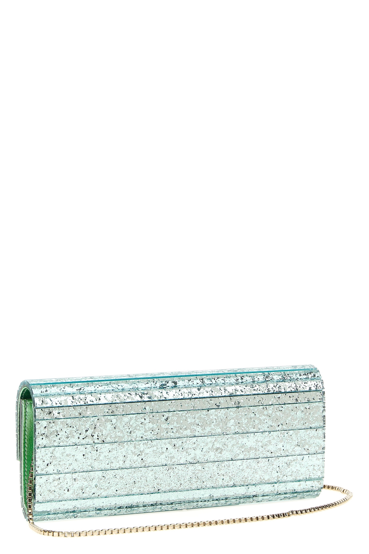 'Sweetie' clutch bag in glitter acrylic fabric with magnetic flap closure, removable chain shoulder strap.