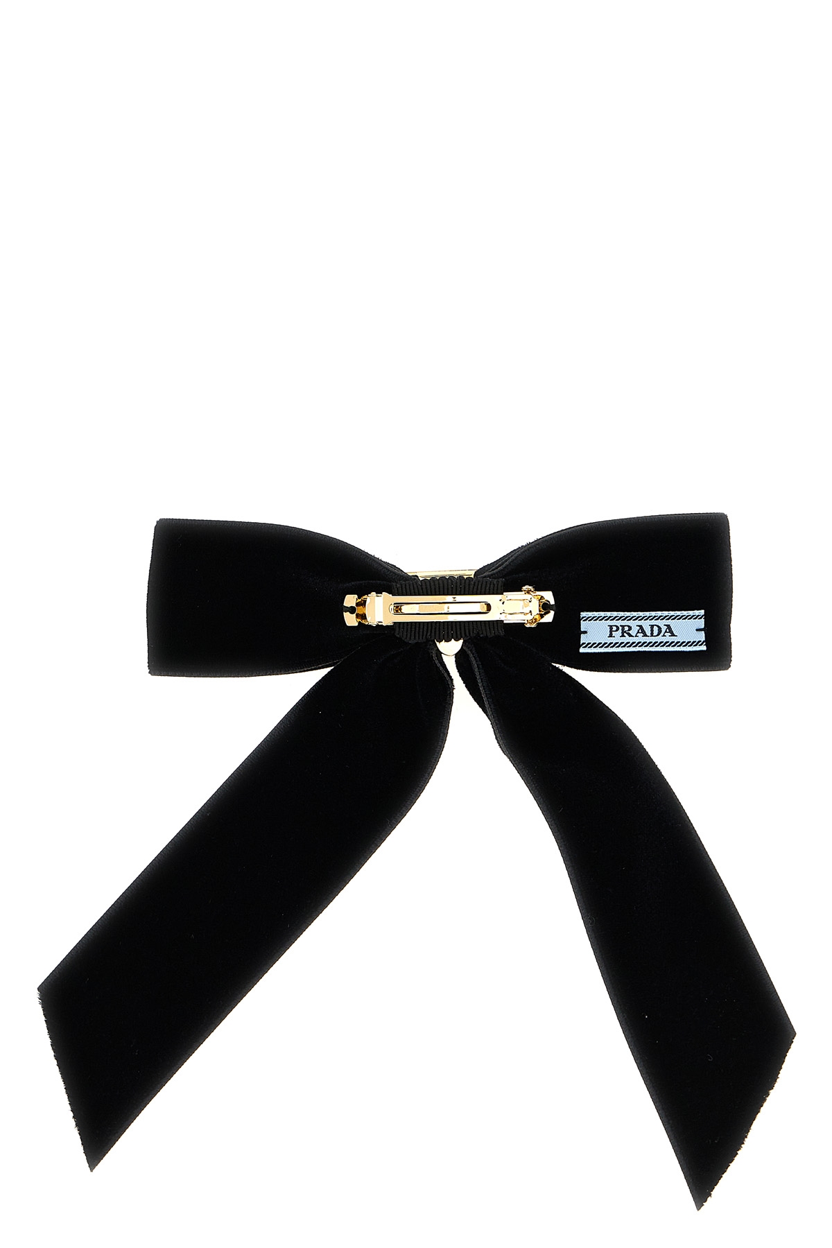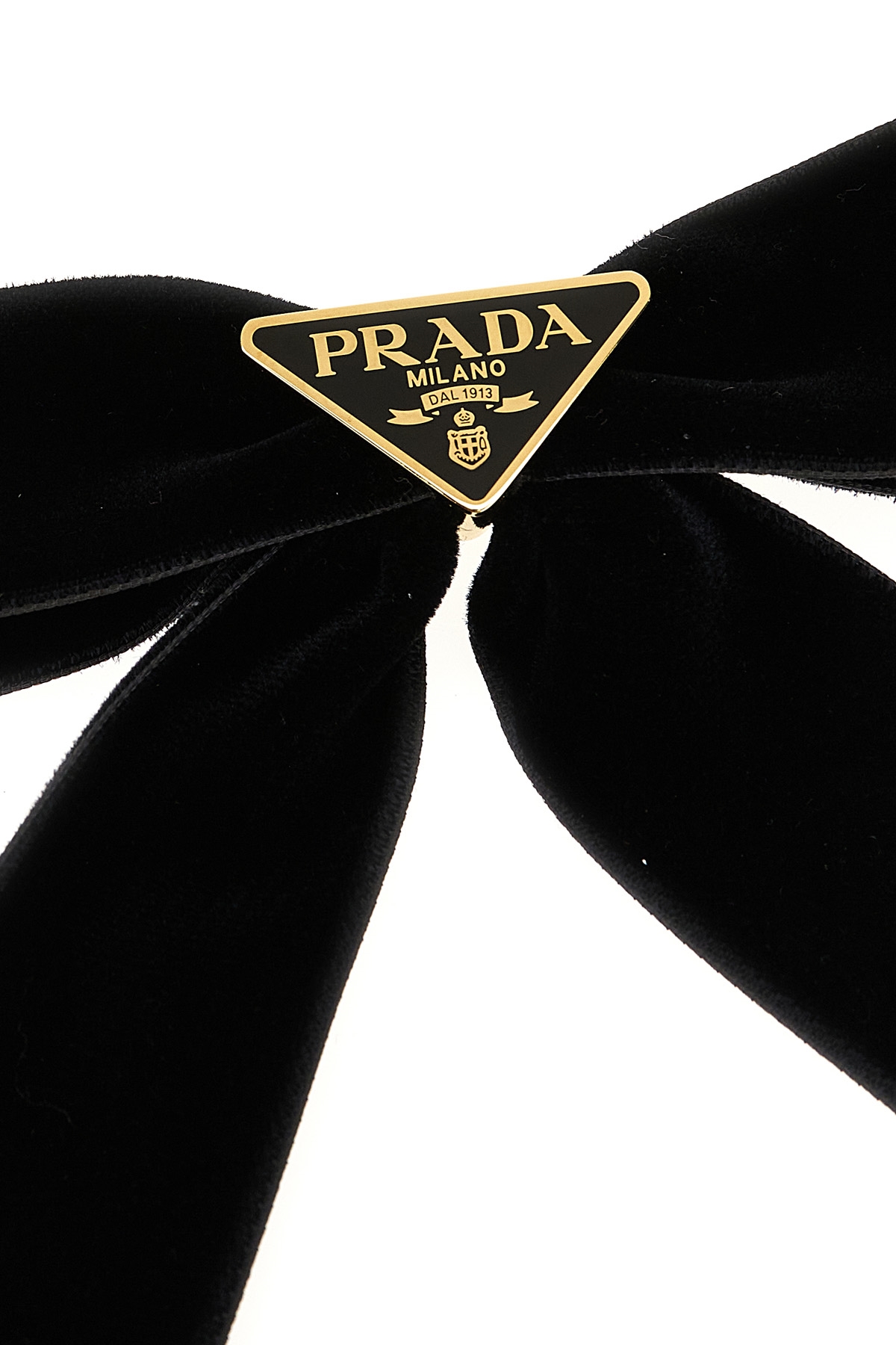 Velvet bow hair clip, triangle metal enamel logo application.