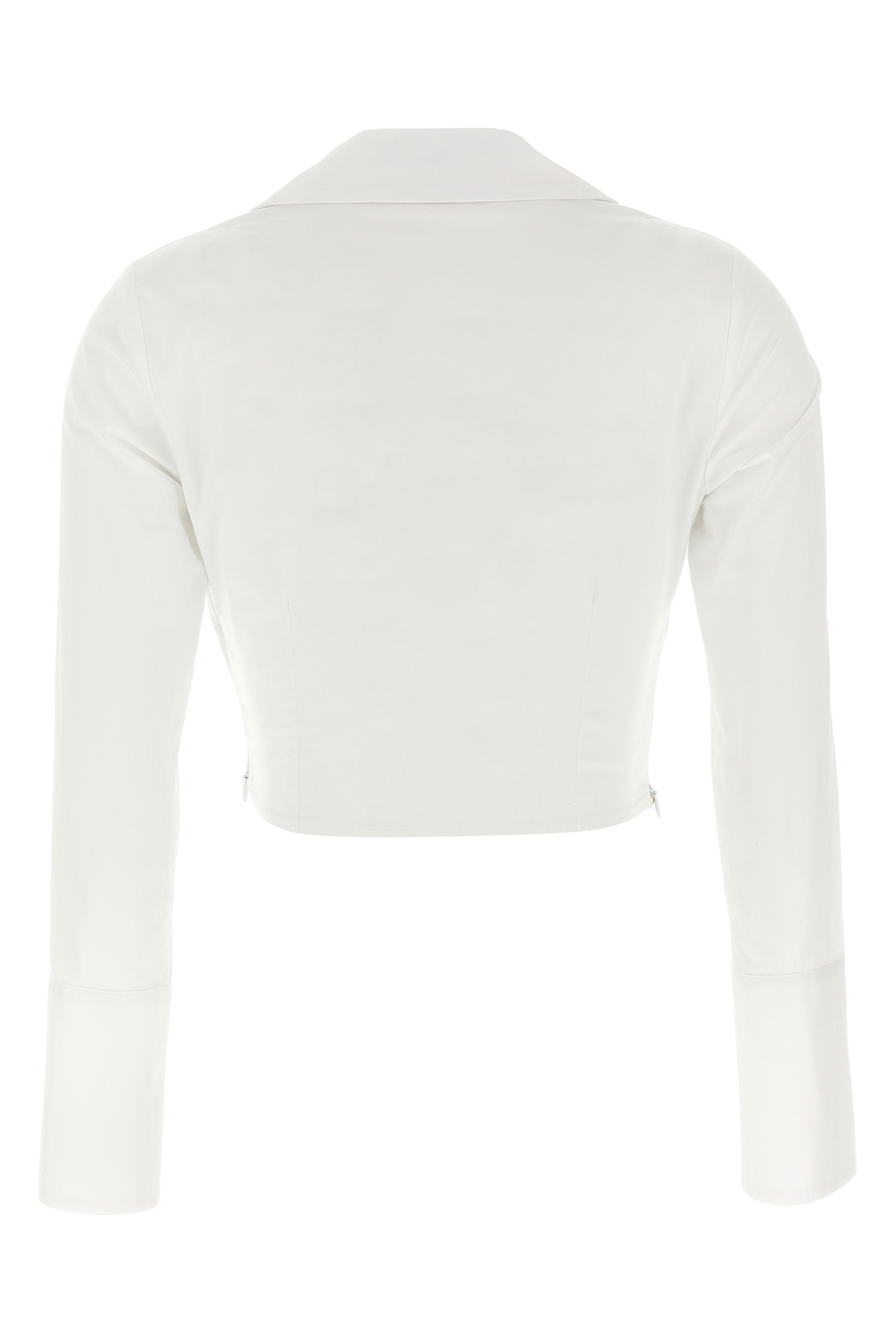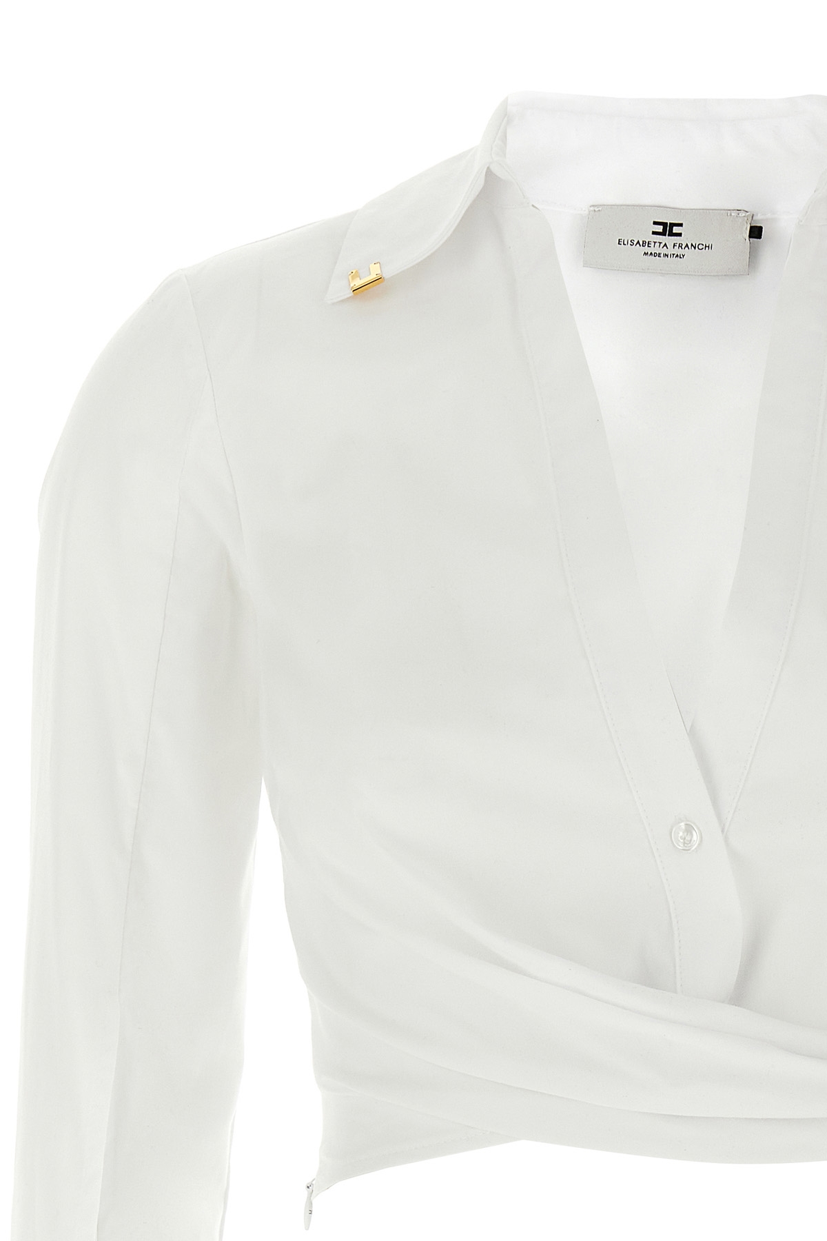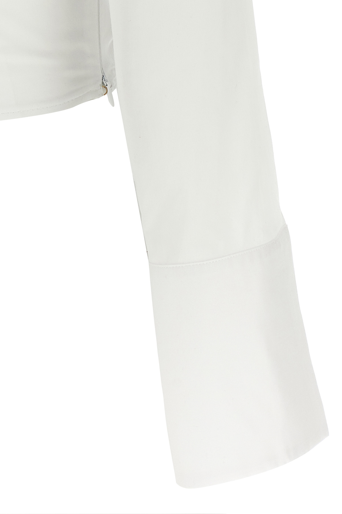 Cotton satin shirt, V-neck with button closure, crop model, collar with metal logo details, crossing with draping on the hem, side slits with zip closure, long sleeves with wide split.