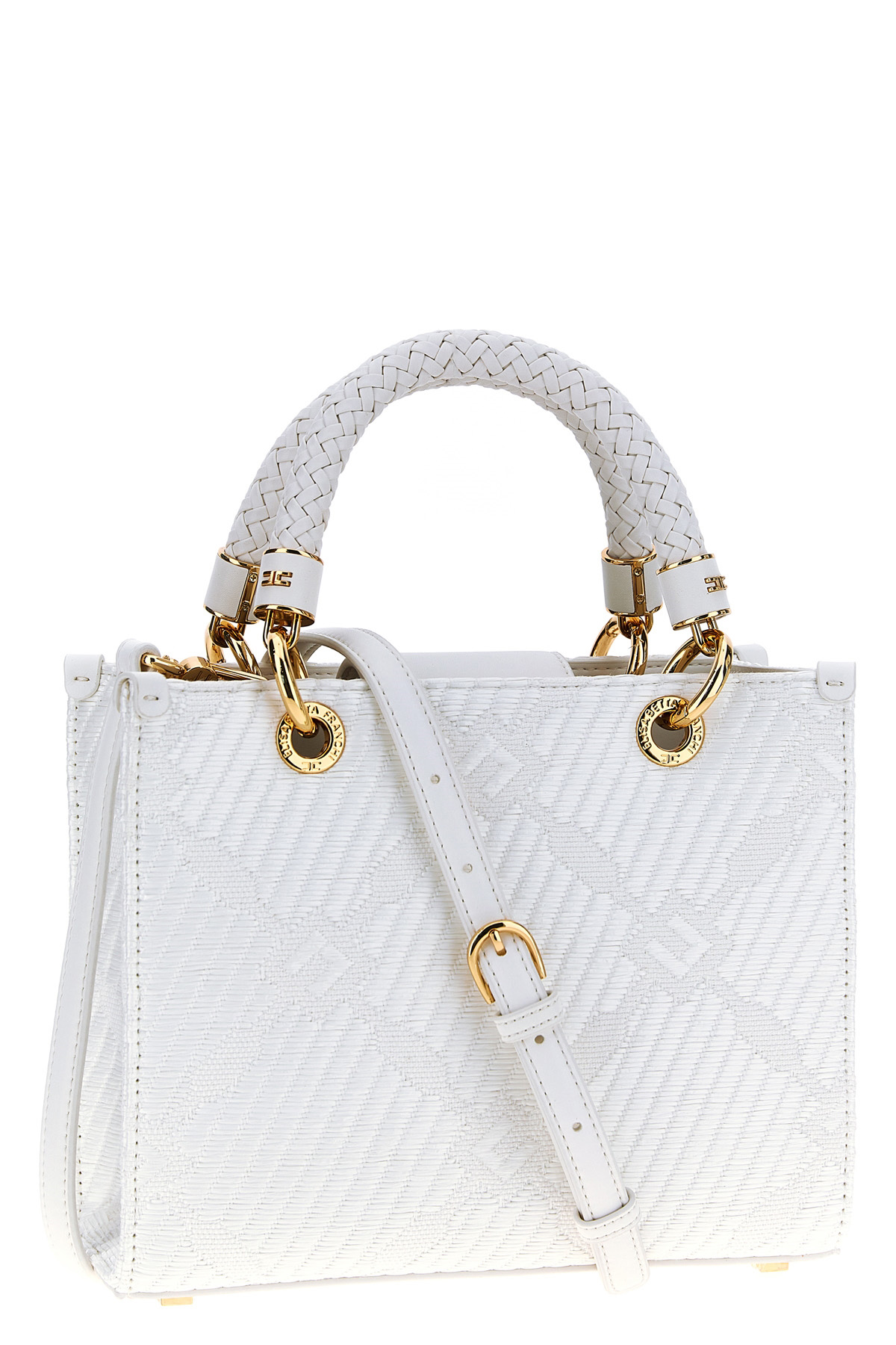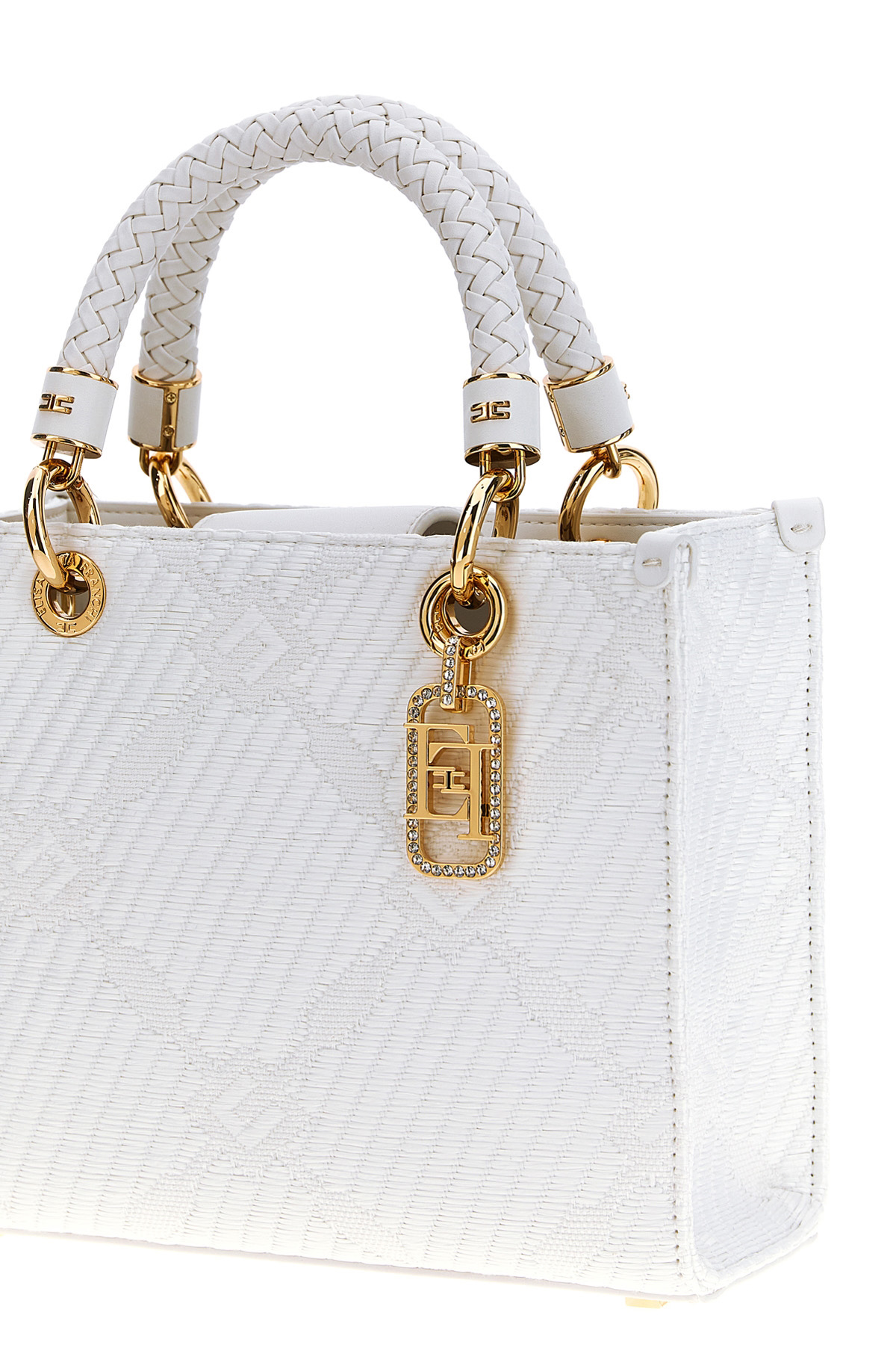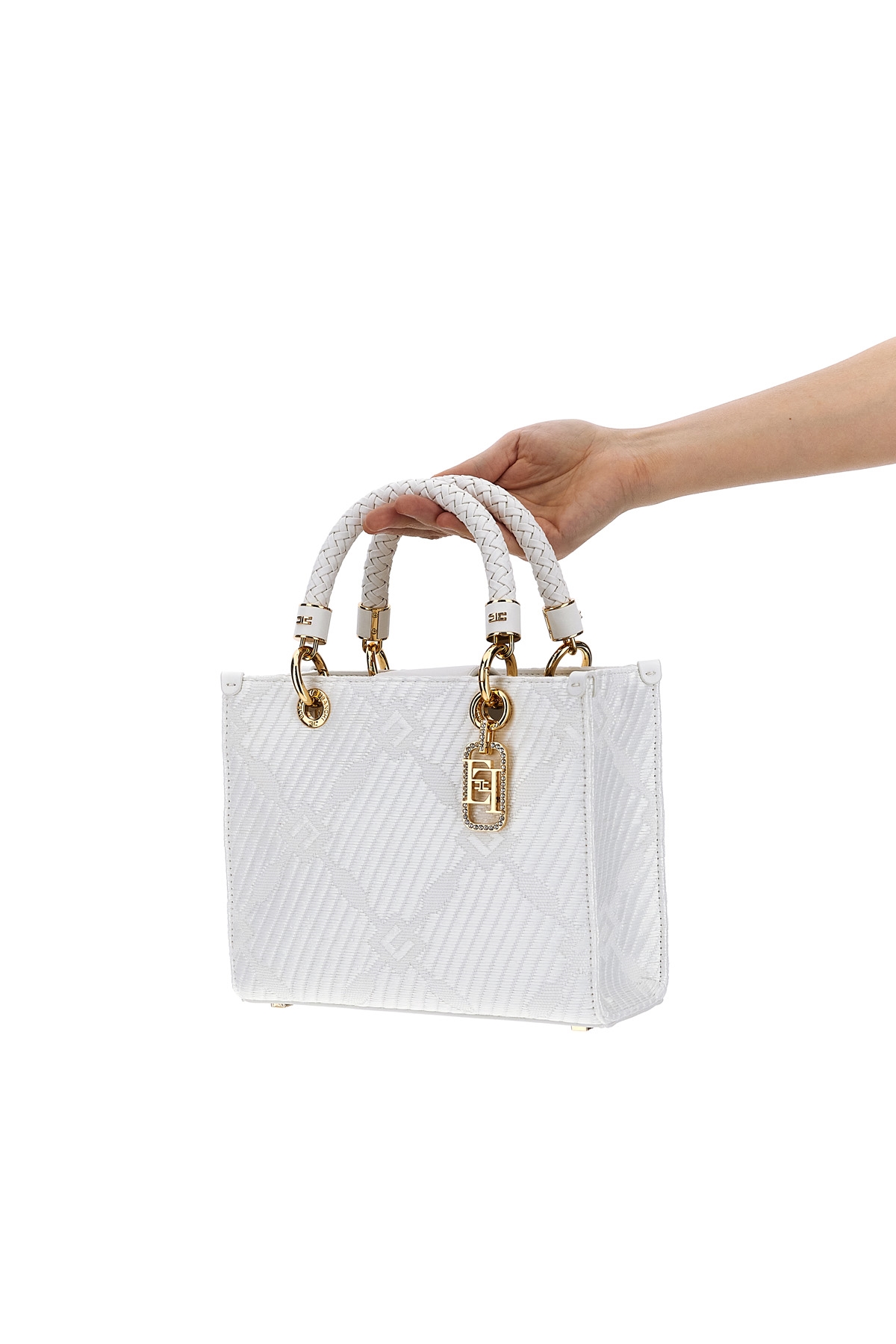 Small 'Tote' jacquard fabric bag with diamond pattern, double fixed braided leather handle, magnetic closure, gold metal and rhinestone charm, adjustable and removable shoulder strap, and metal details.