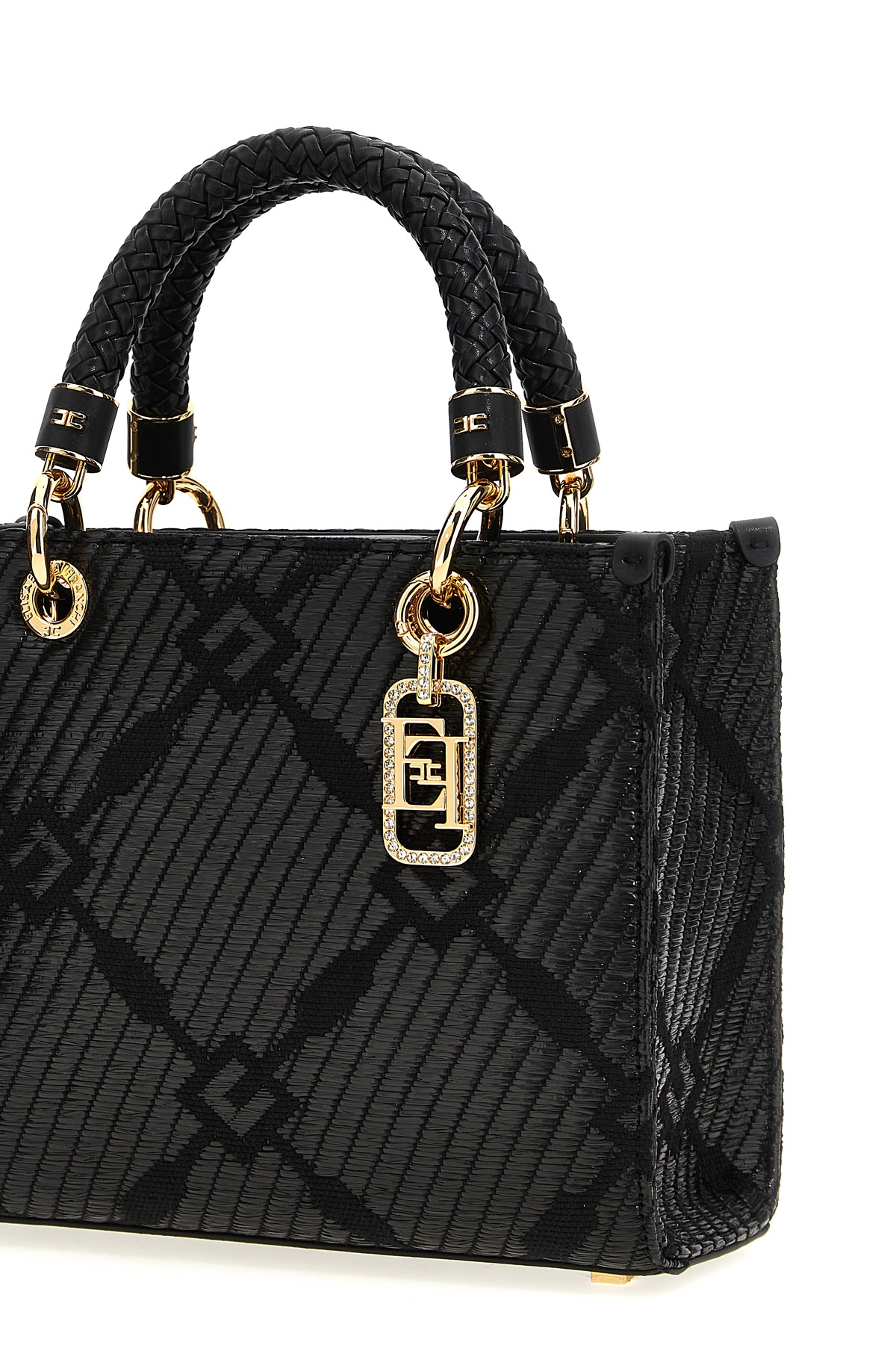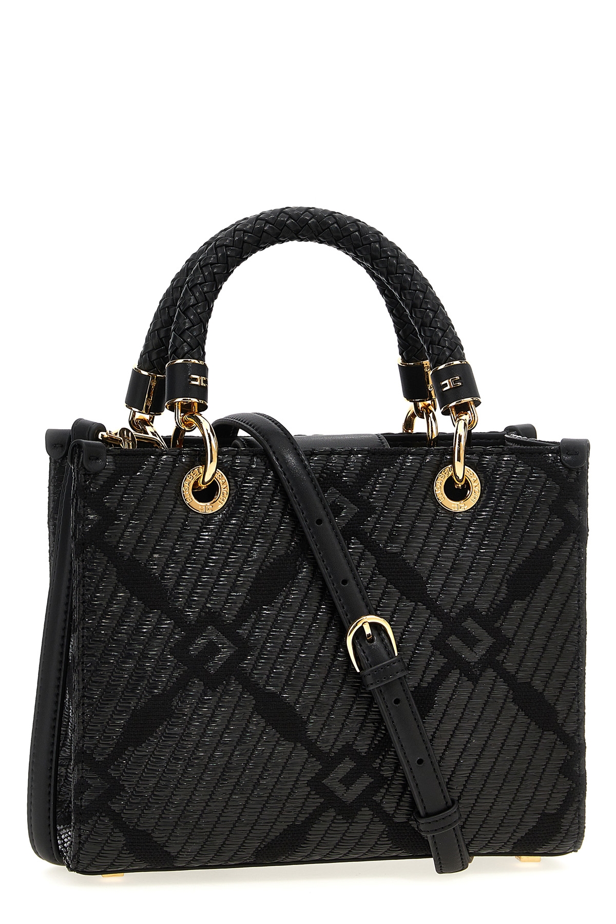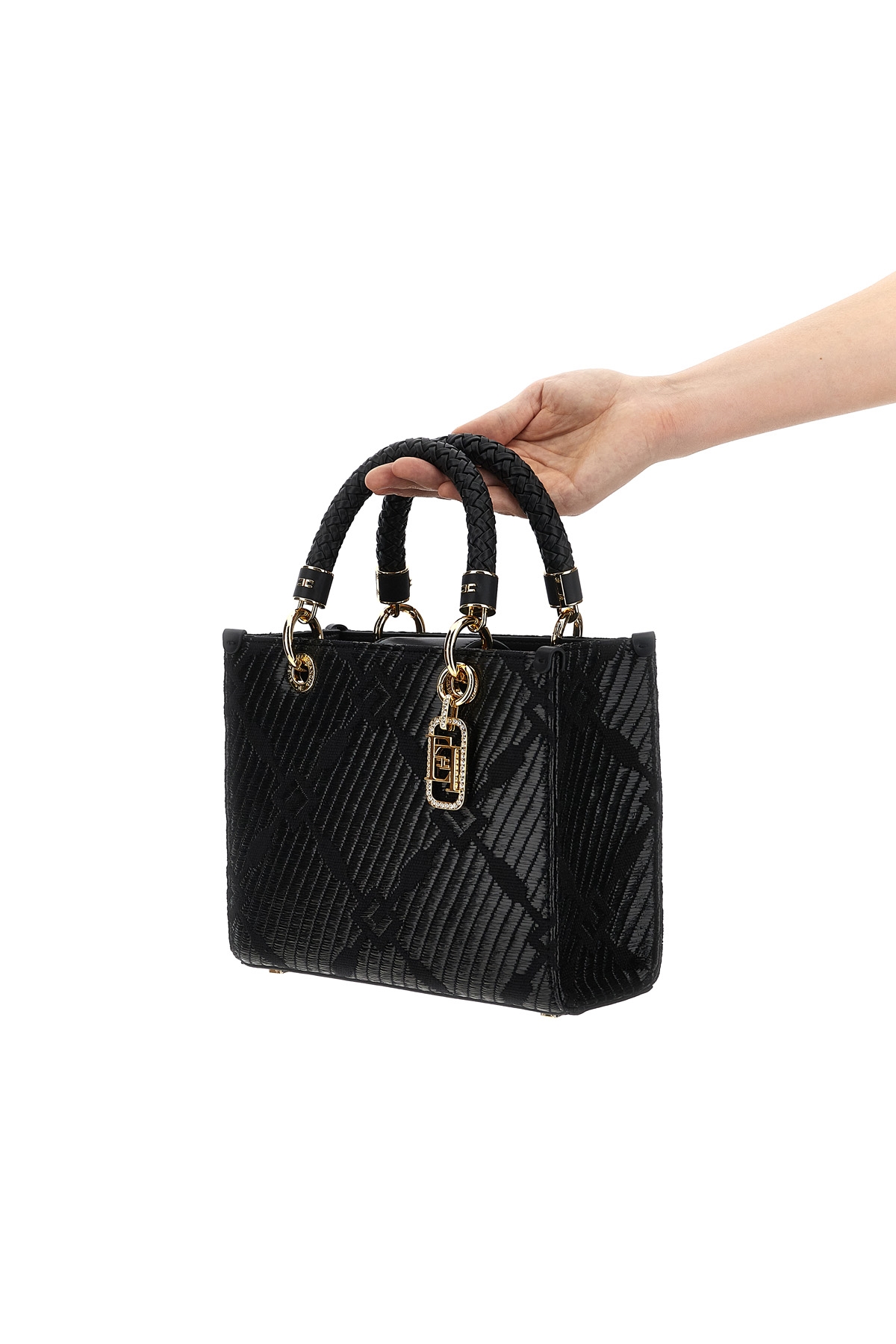 Small 'Tote' jacquard fabric bag with diamond pattern, double fixed braided leather handle, magnetic closure, gold metal and rhinestone charm, adjustable and removable shoulder strap, and metal details.