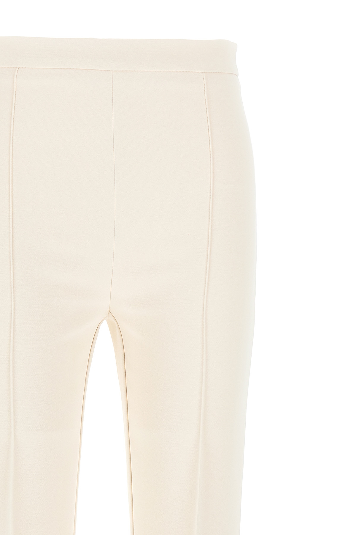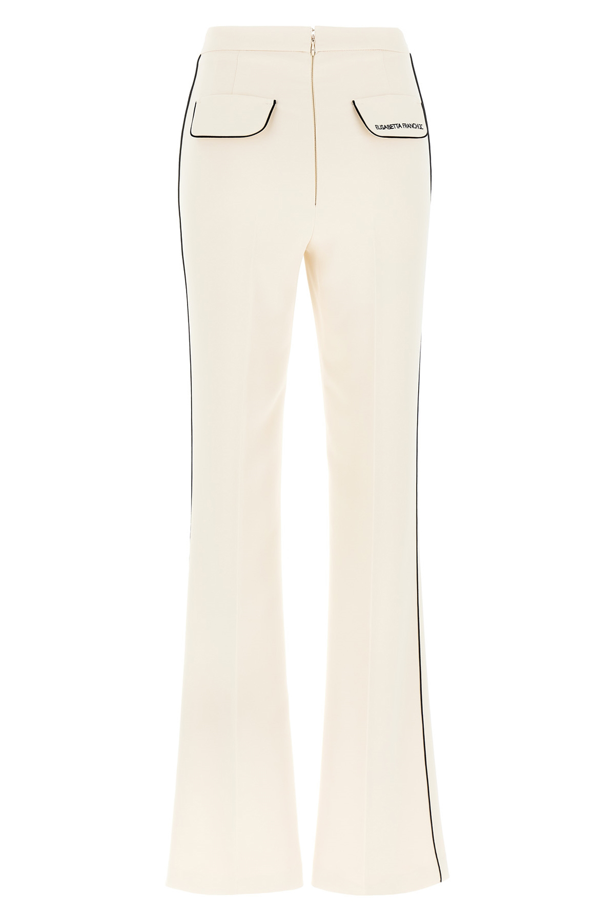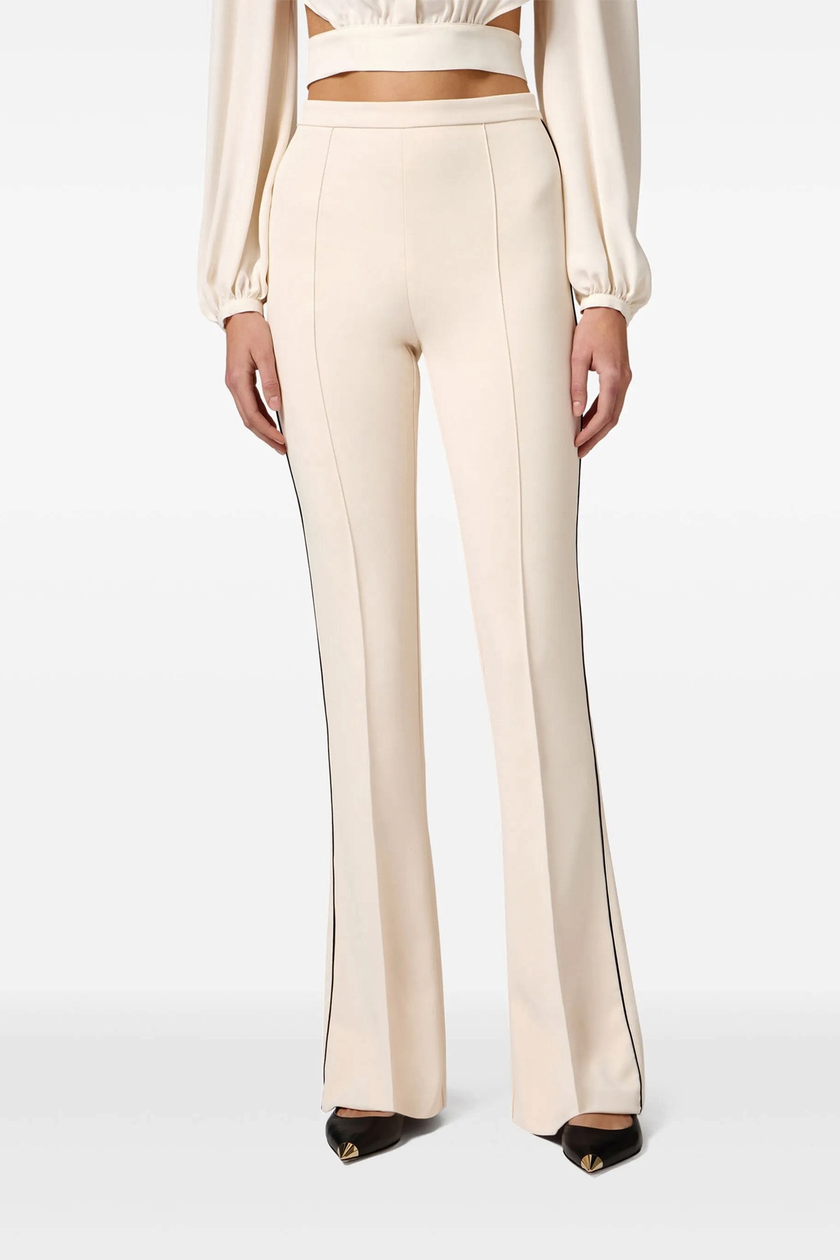 Stretch crepe pants with contrasting piping, waistband model, back zip closure, pockets, flared leg bottom, stretched pleat.