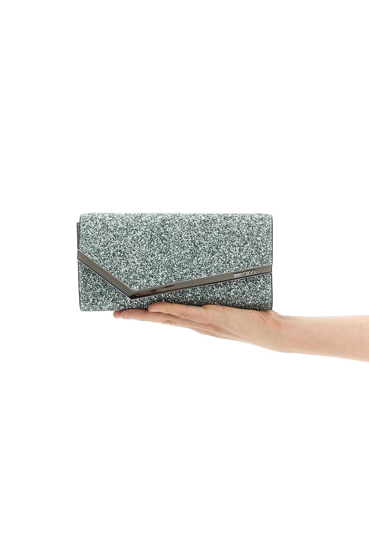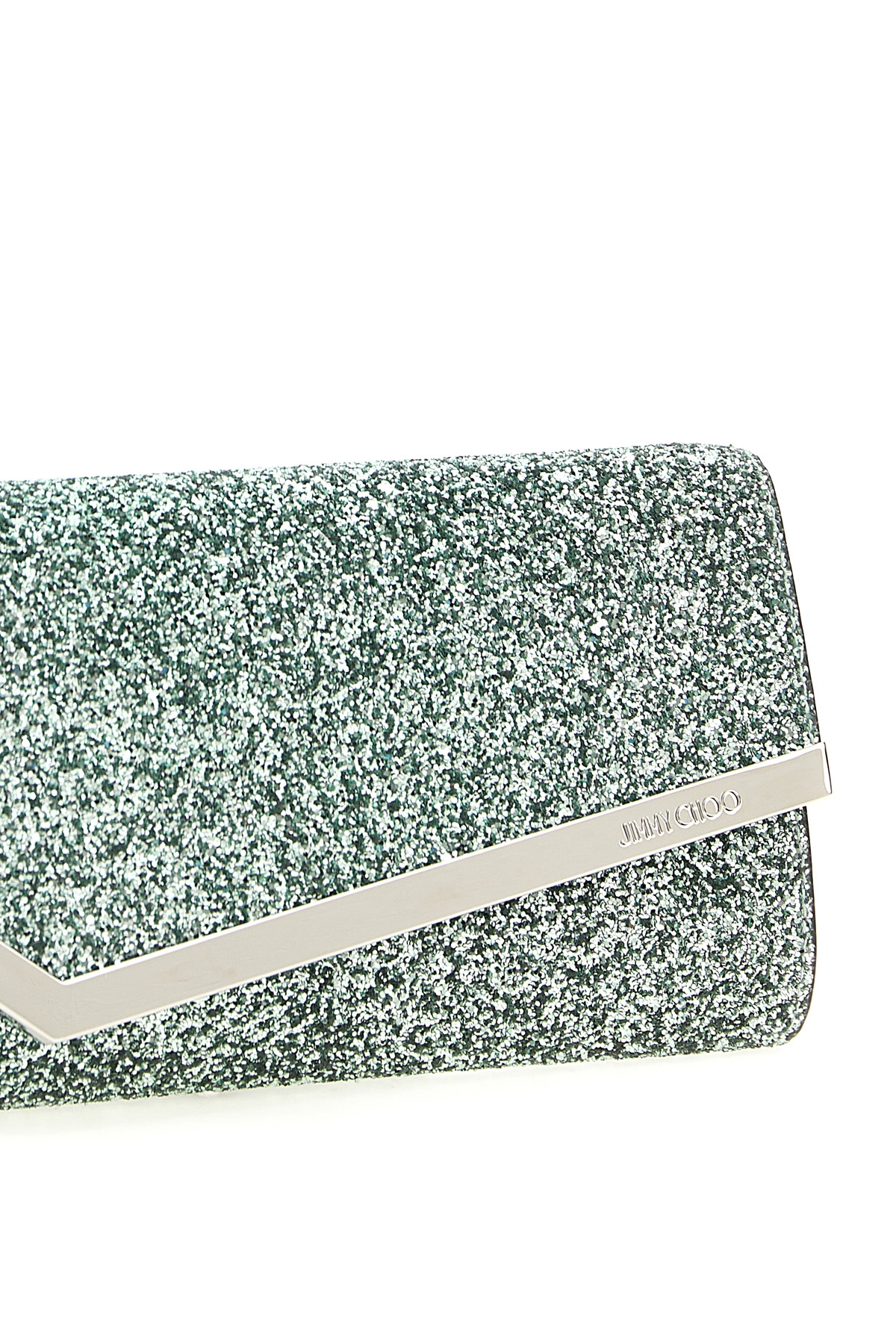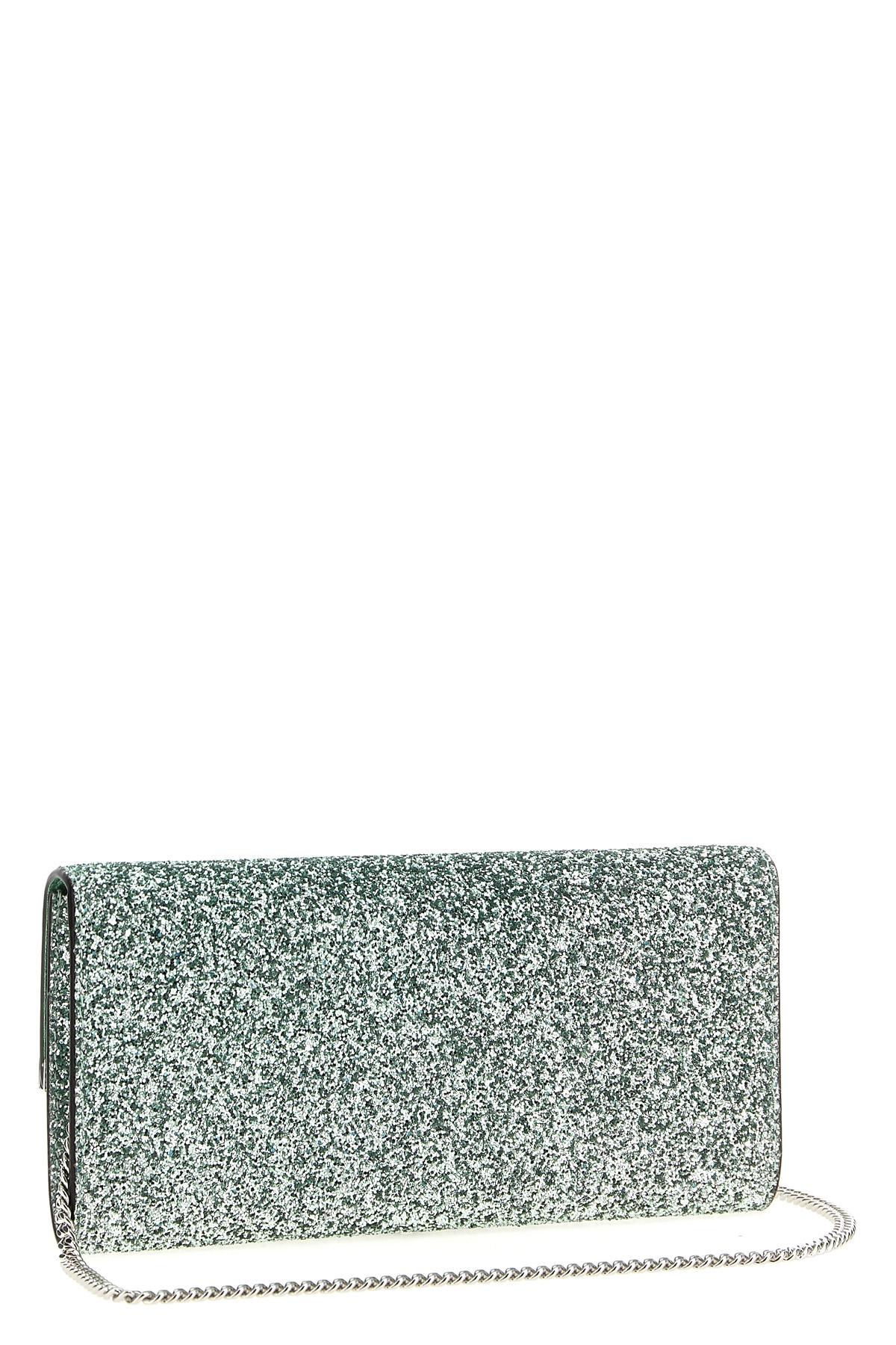 'Emmie' clutch bag in glitter fabric with metal details, magnetic flap closure, removable chain shoulder strap.