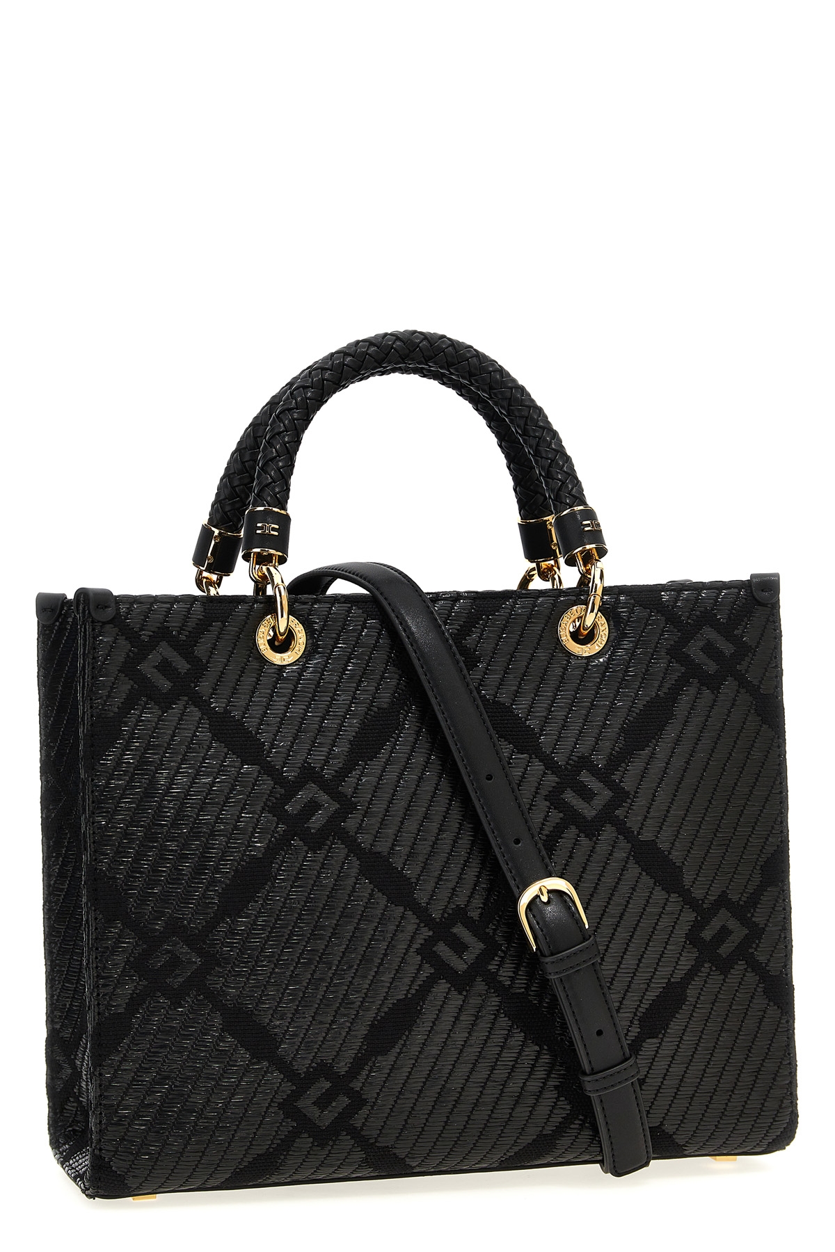 'Tote' midi bag in jacquard fabric with diamond pattern, double fixed braided leather handle, magnetic closure, gold metal and rhinestone charm, adjustable and removable shoulder strap, metal details.