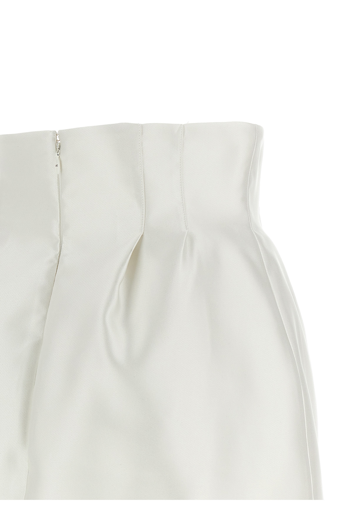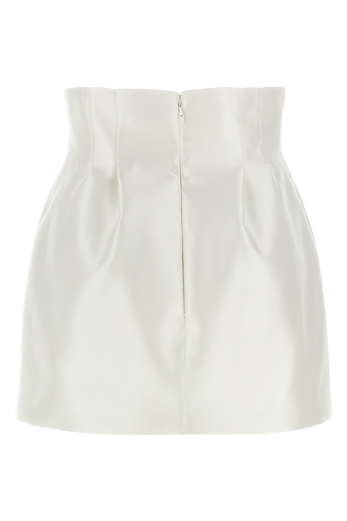 Duchesse mini skirt with pleats at the waist that create amphora silhouette on the hem, brooch with flower decoration and removable metal logo, back zip closure, monogram satin lining.