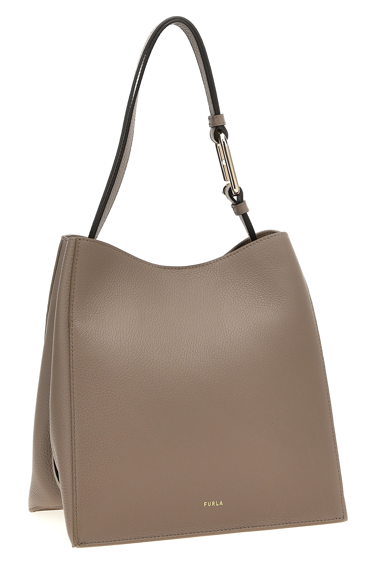 Furla Nuvola S shoulder bag in hammered leather, handle with adjustable metal logo detail, and magnetic closure.