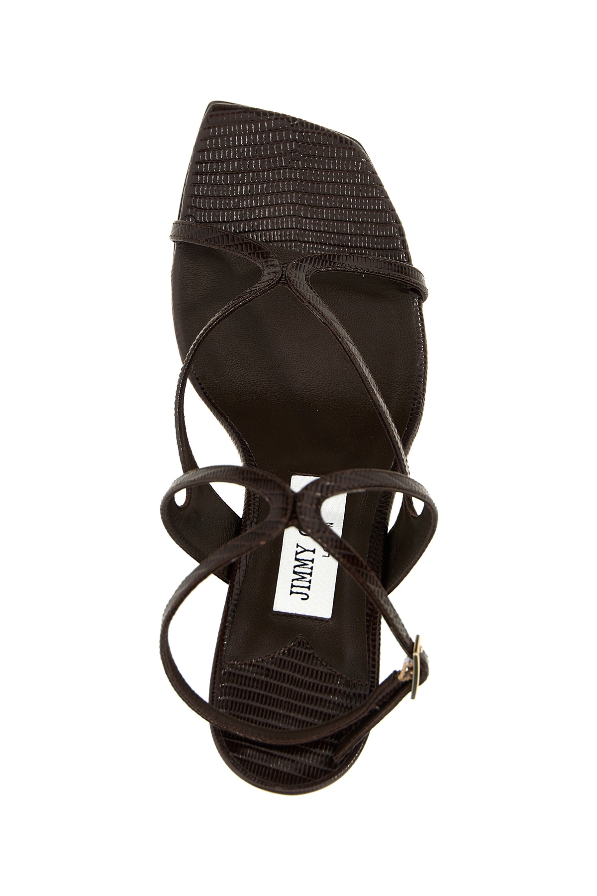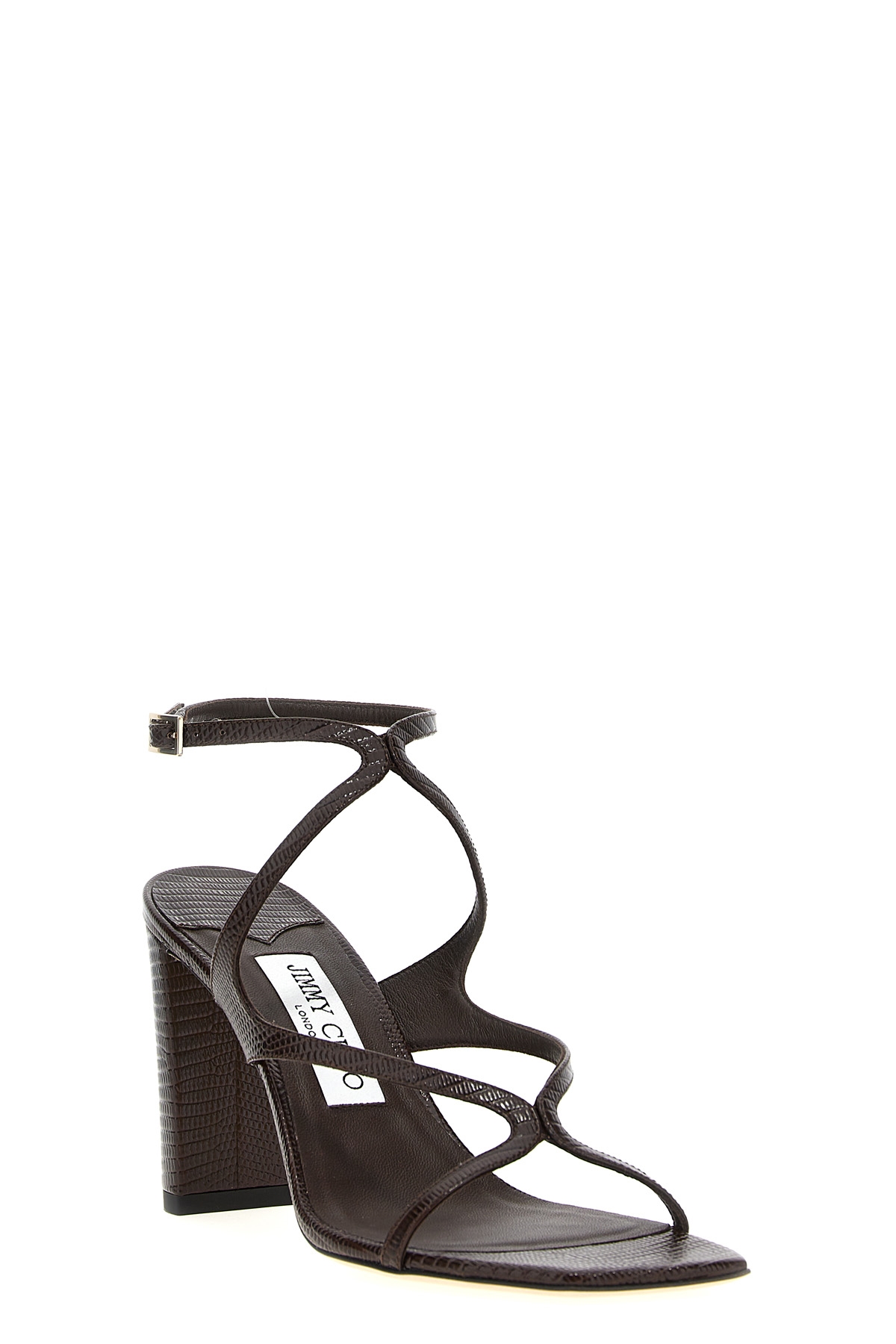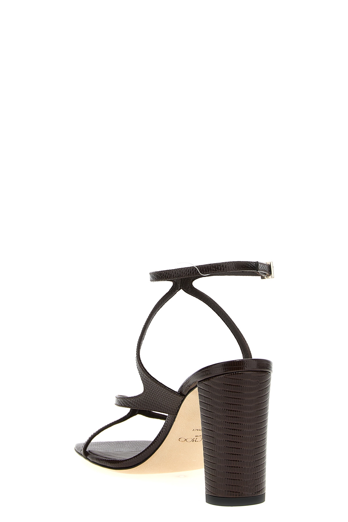 'Azie' snake-print leather sandals with adjustable ankle strap, square toe, chunky heel, leather sole.