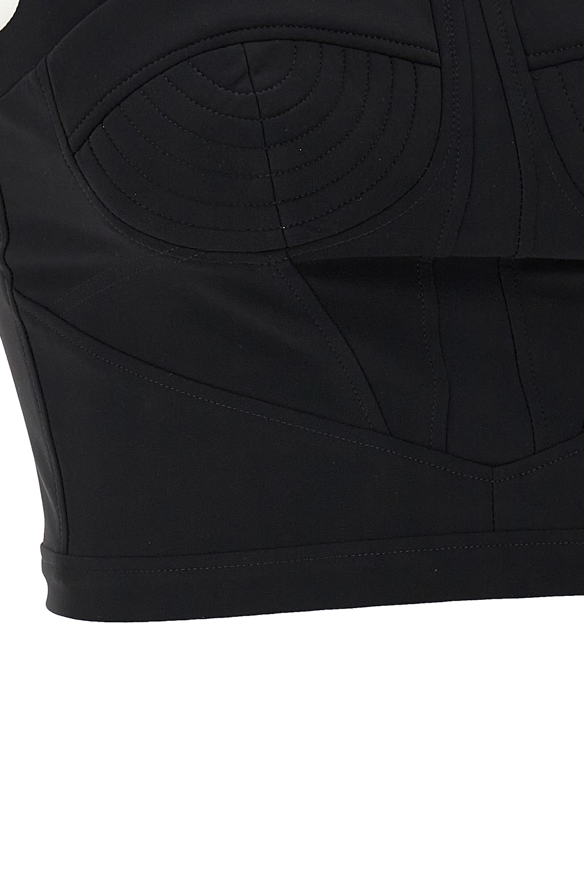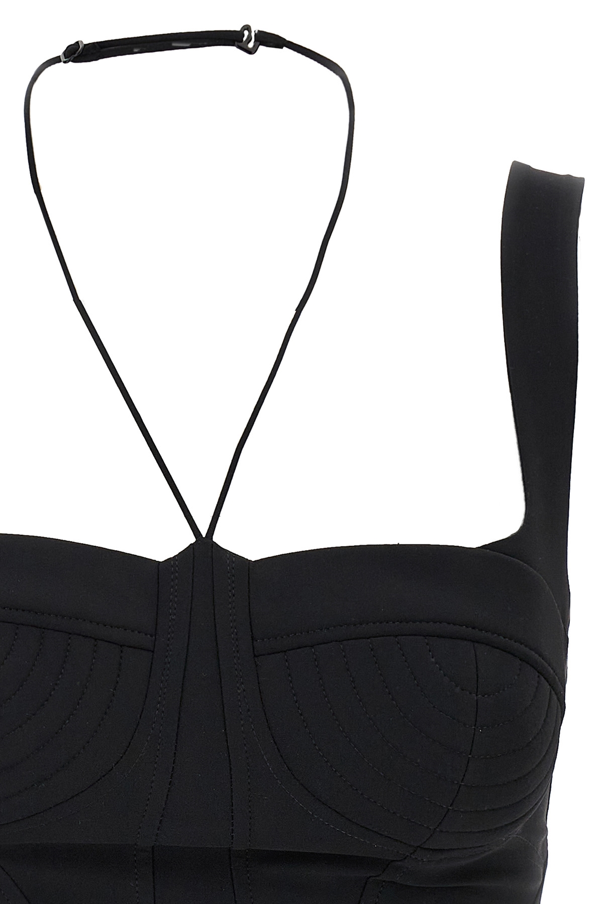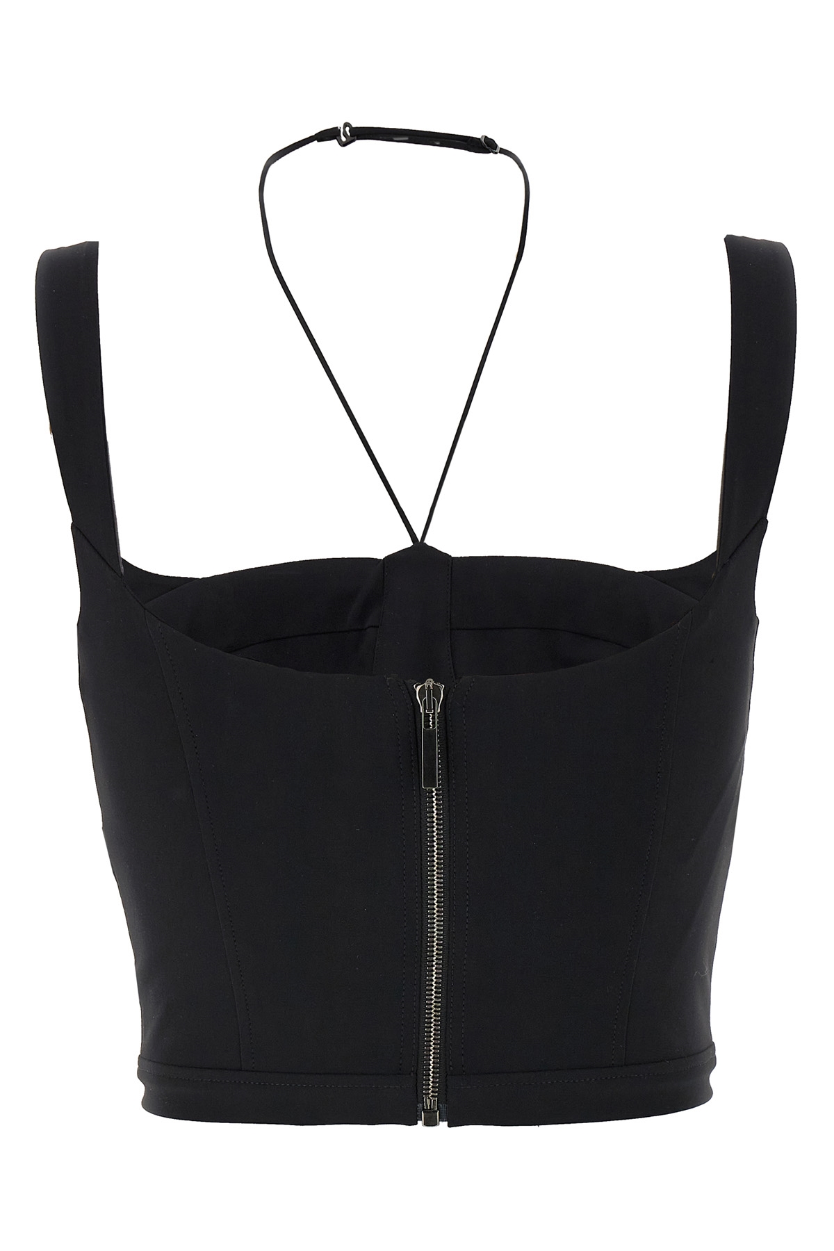 Stretch fabric top, shaped bustier style, thin straps, lacing at the neck, back zip closure.