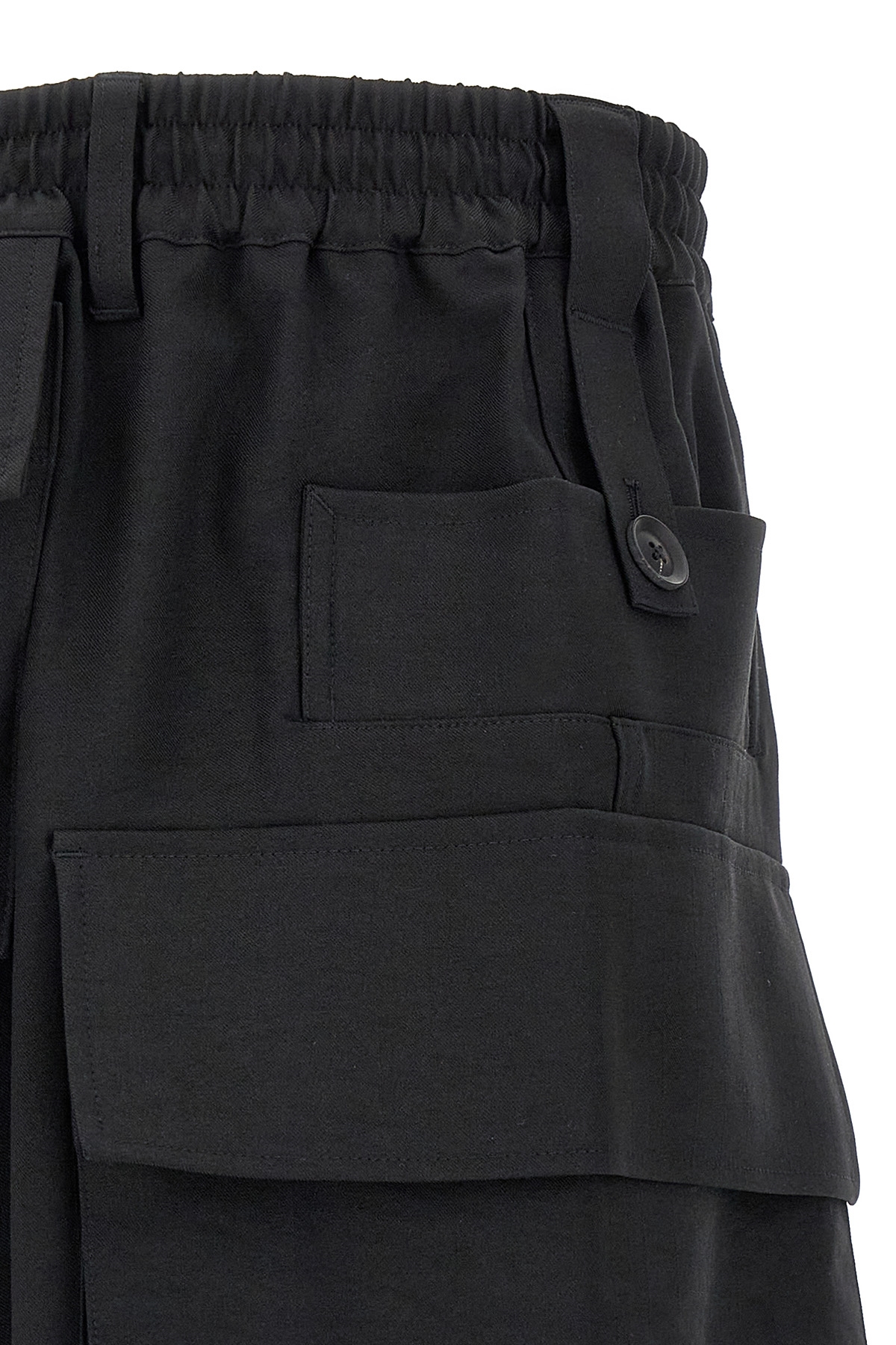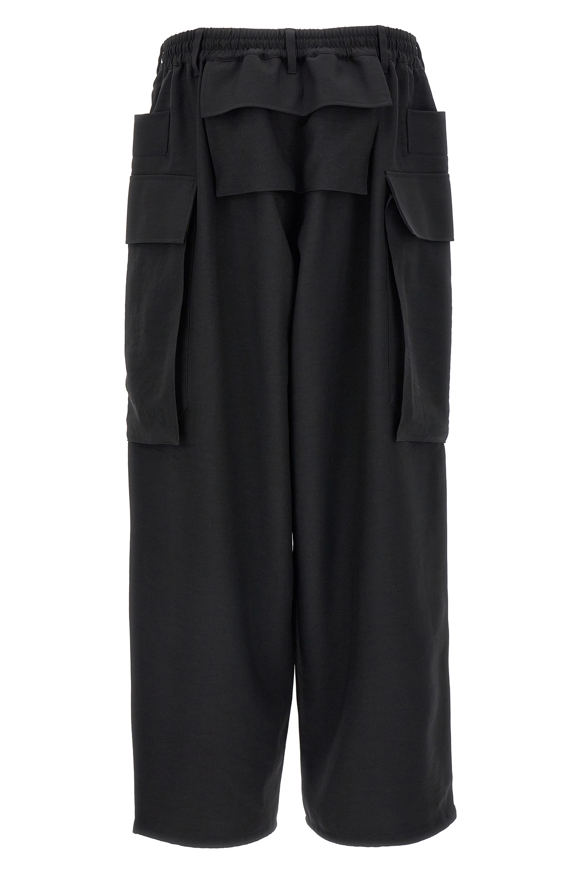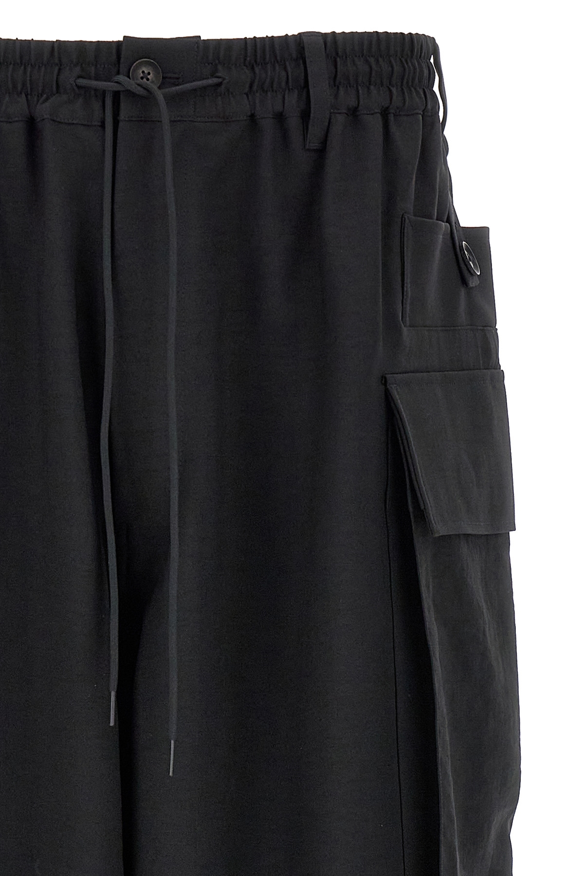'Y-3 Sport Uniform Cargo' low-waisted pants in polyester twill, wide leg with cargo pockets, adjustable drawstring elastic at the waist, zip and button closure, pockets.