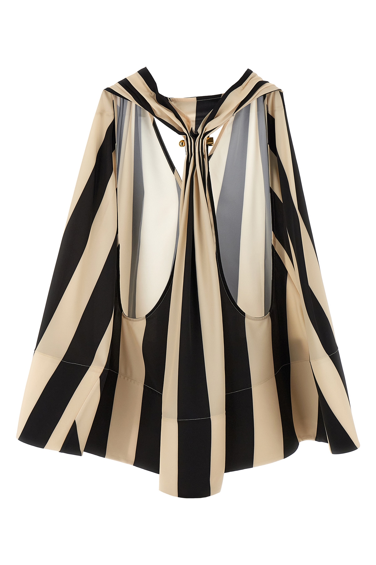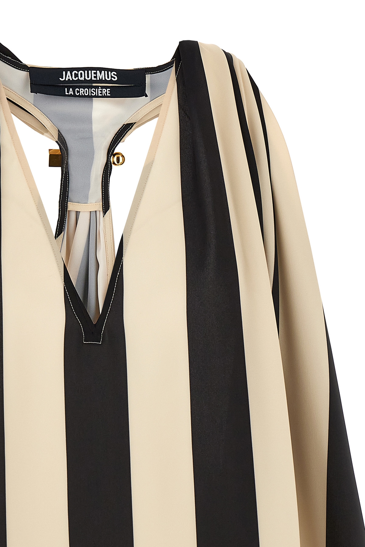 'Le Haut Norma' striped stretch viscose blend top with V-neck, trapezoid style with reinforced hem, deep rowing back neckline with Rond-Carre brooch, wide armholes.