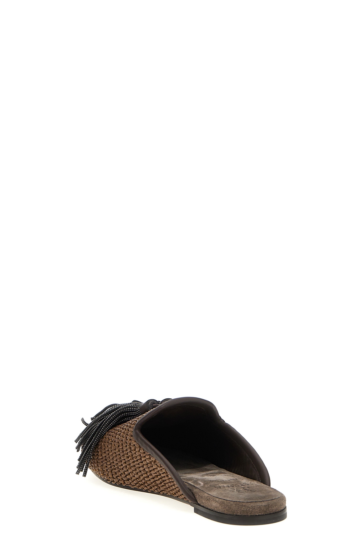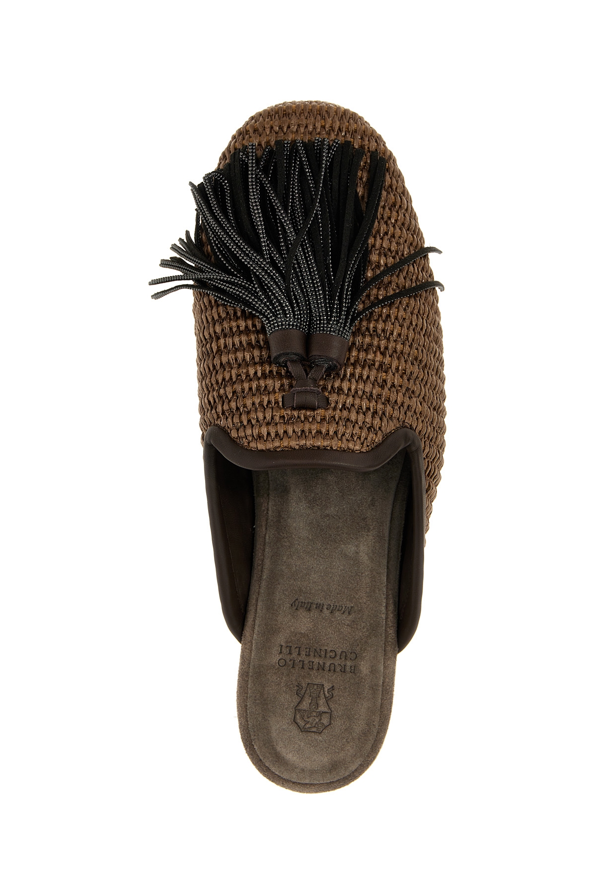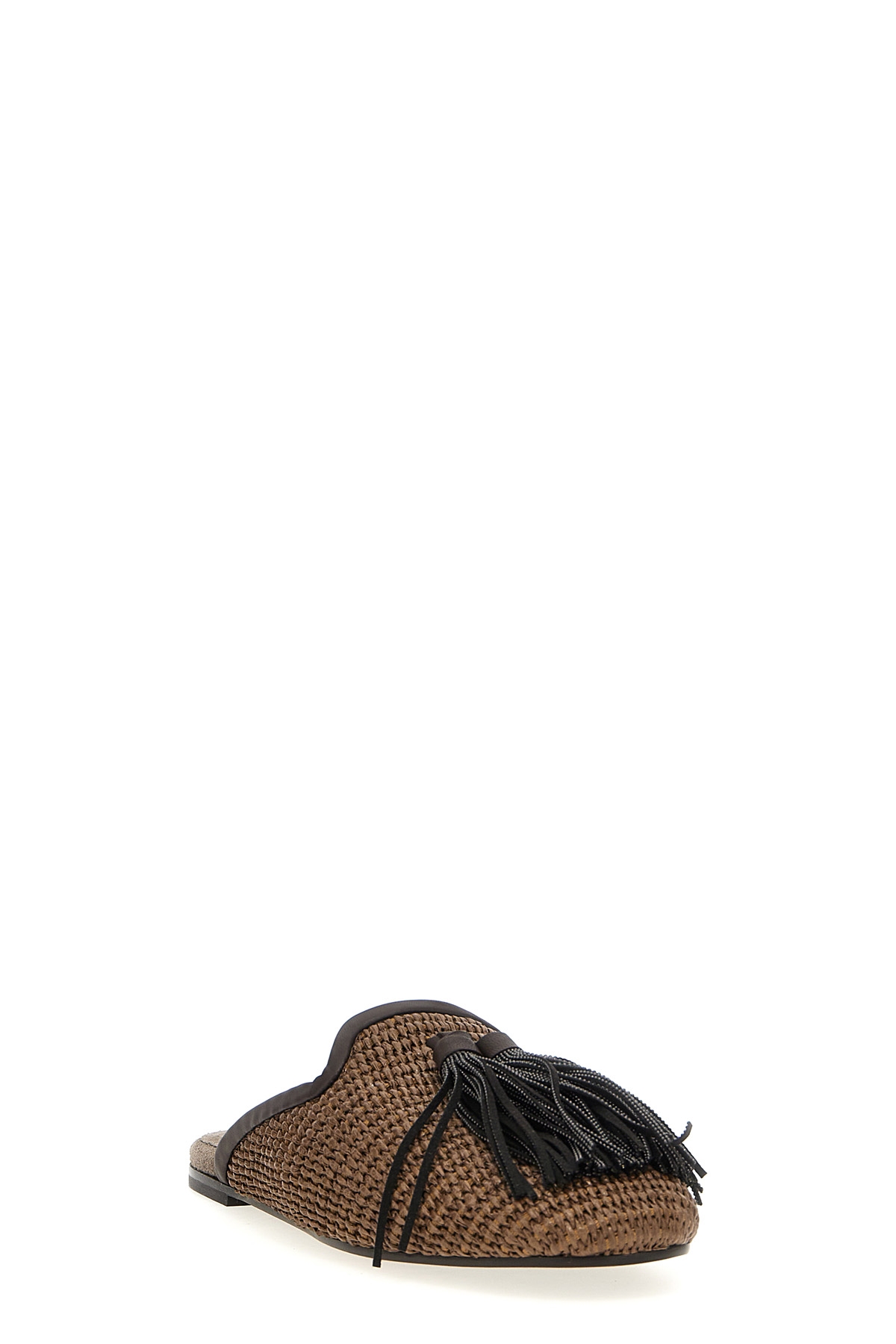 Braided raffia sabots with leather details and front monile tassels, leather and rubber sole.