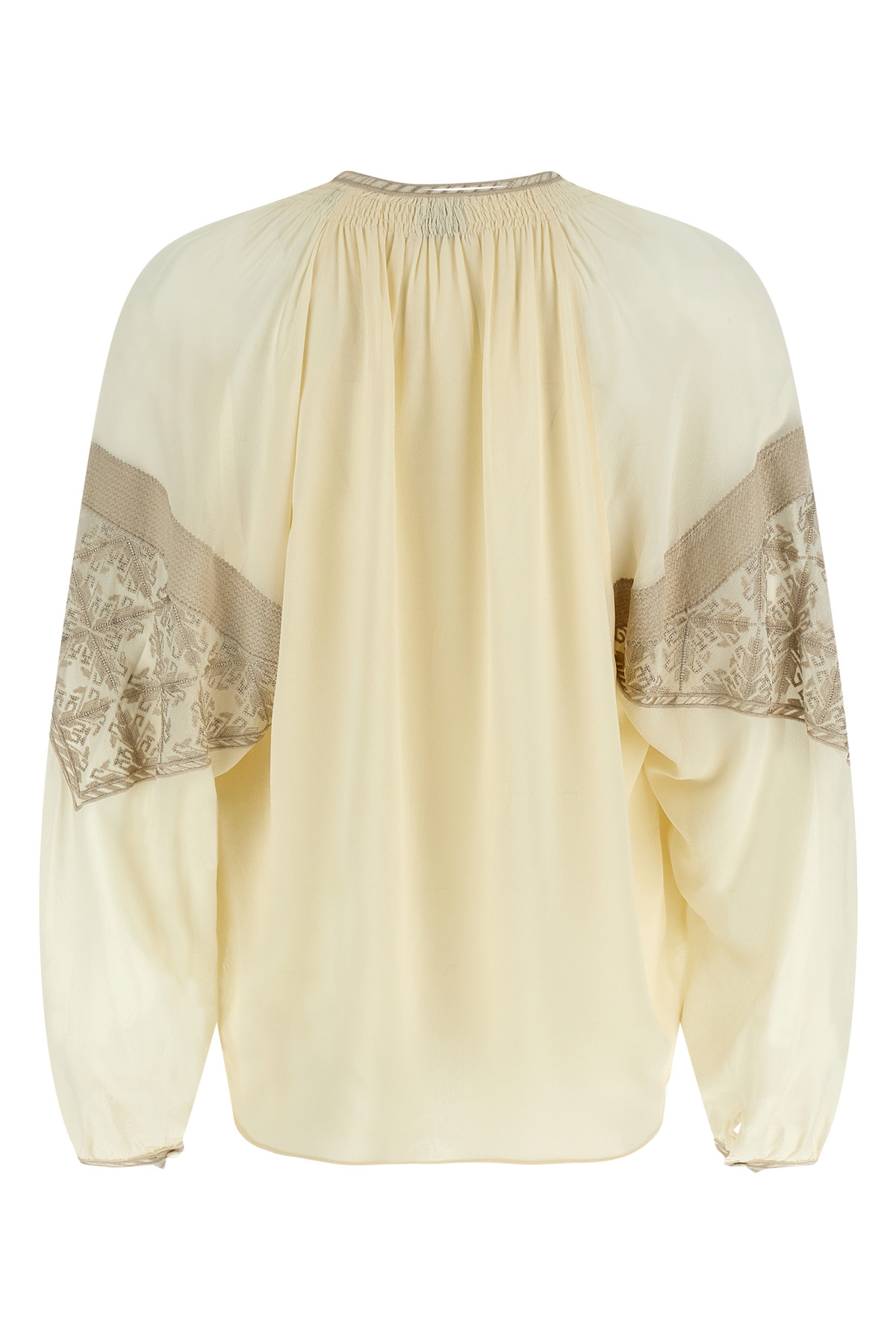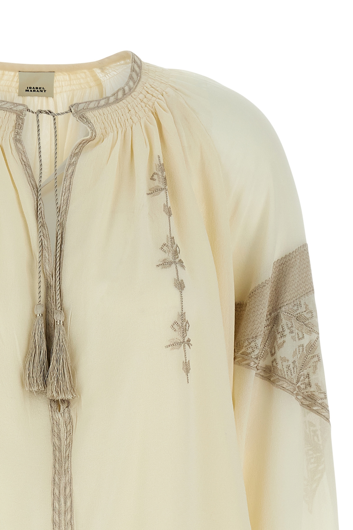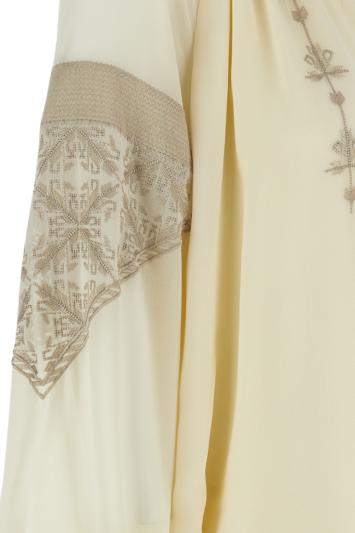 'Oris' blouse in embroidered silk crepe georgette, V-neck with hook closure, cord with tassels, long cuffed sleeves.