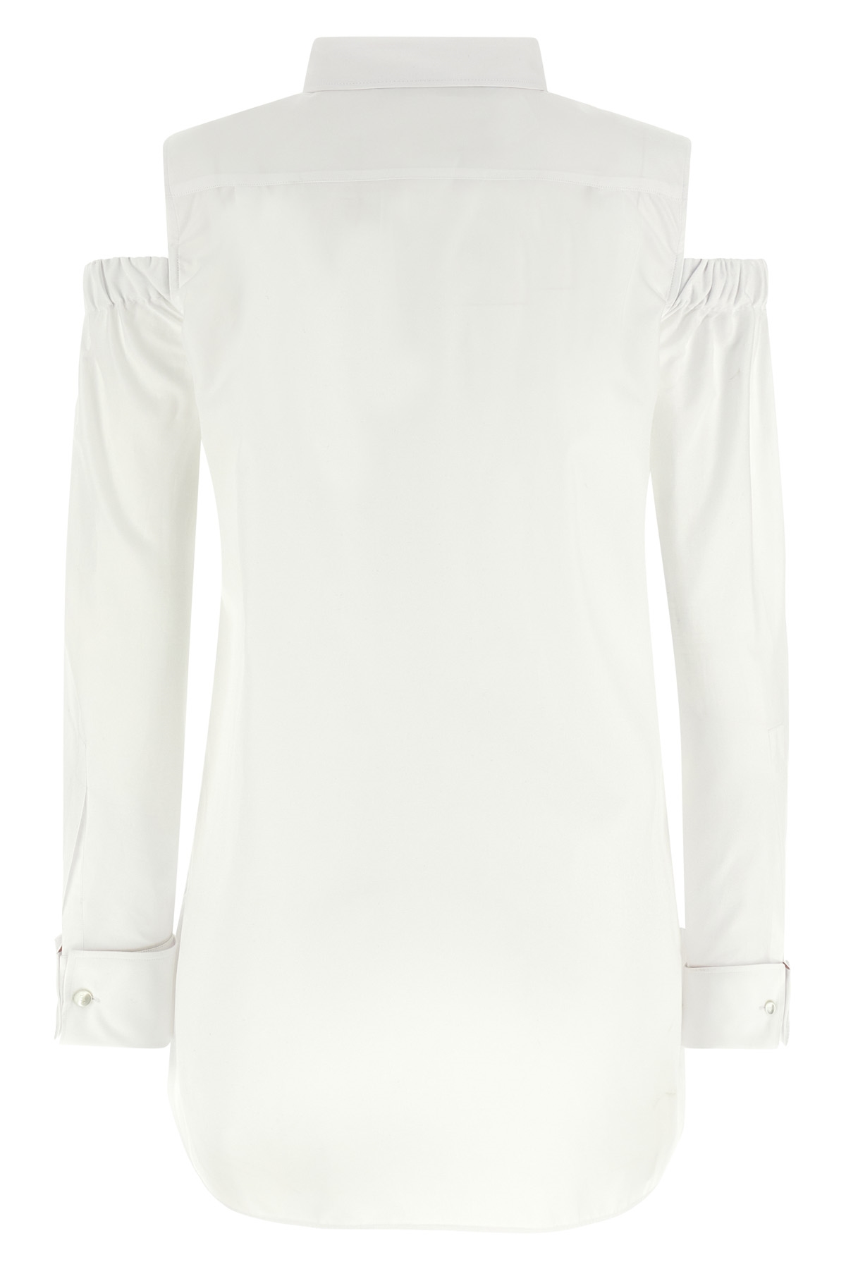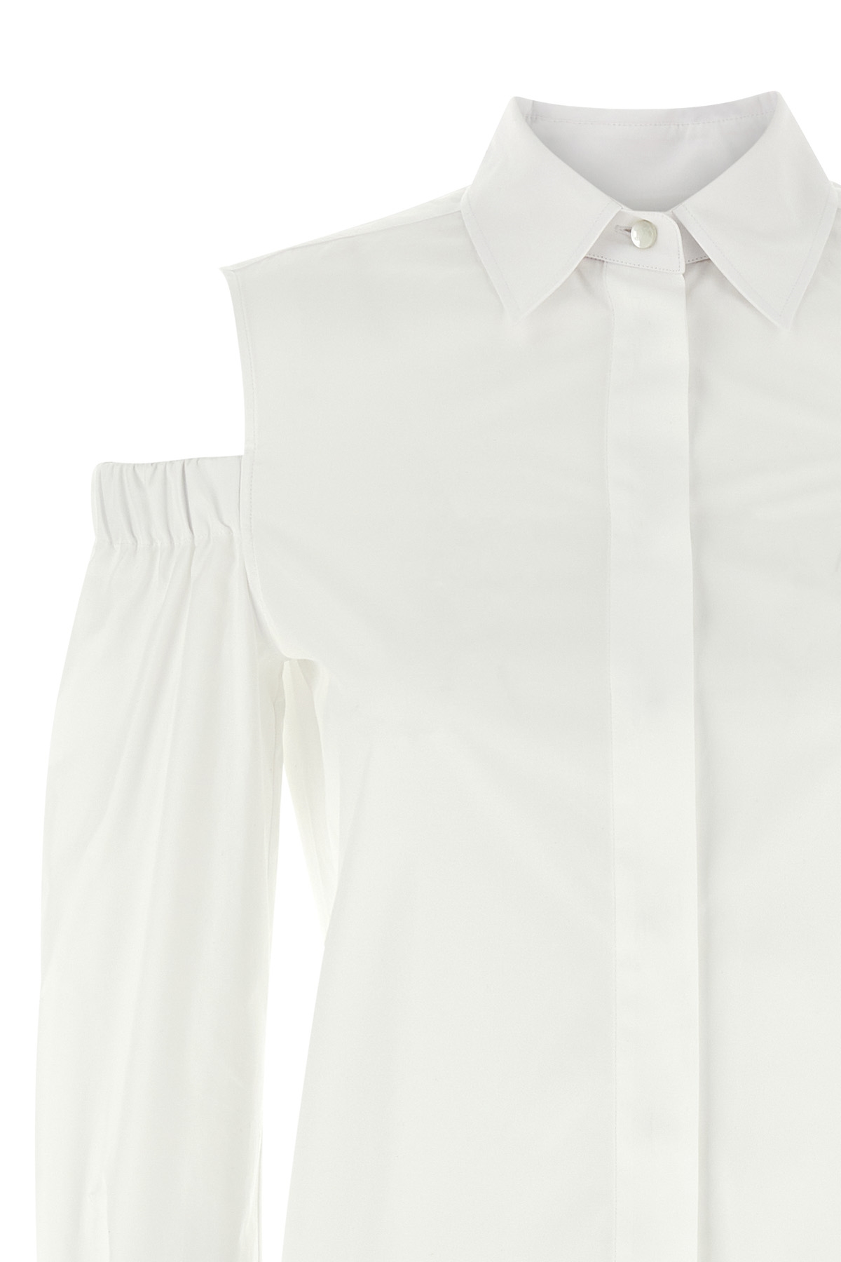 'Ragni' stretch cotton poplin shirt, long male model with a straight line, long sleeves with elastic cut-out detail curled on the shoulder, high cuffs with twin button, asymmetric hem, side slits, button closure.