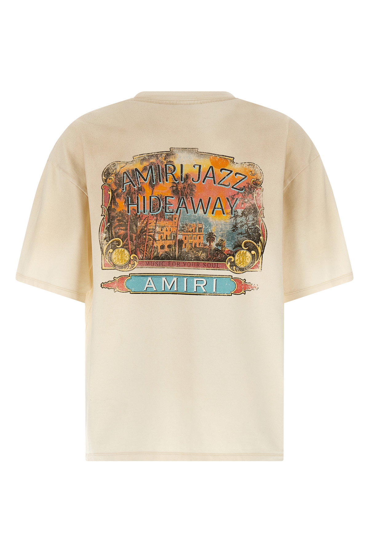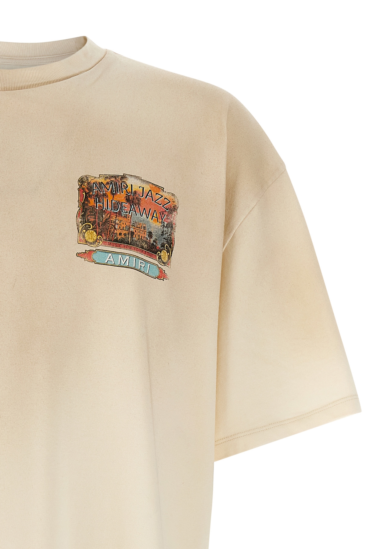 Cotton T-shirt with 'Amiri Jazz Hideaway' print on the front and back, crew neck, short sleeves and dropped shoulders.