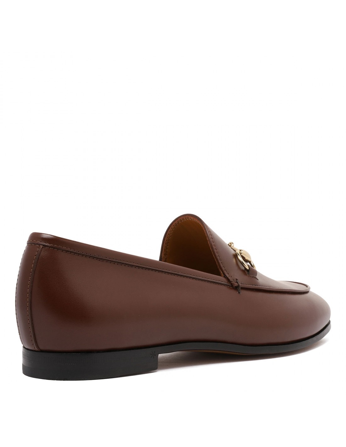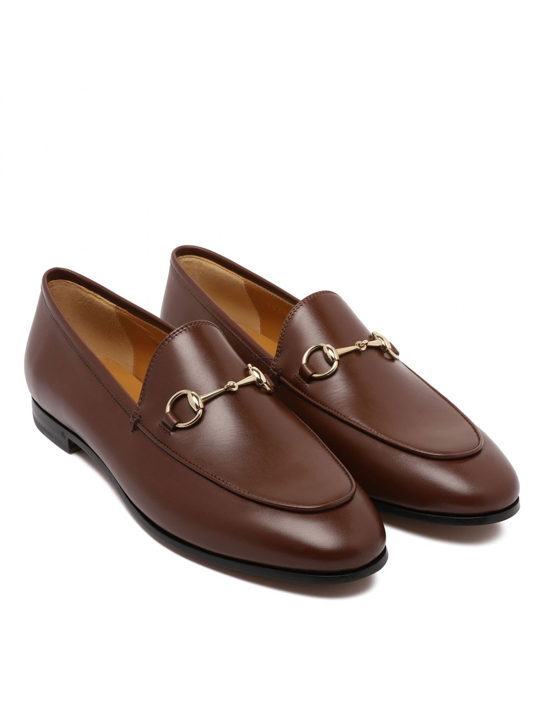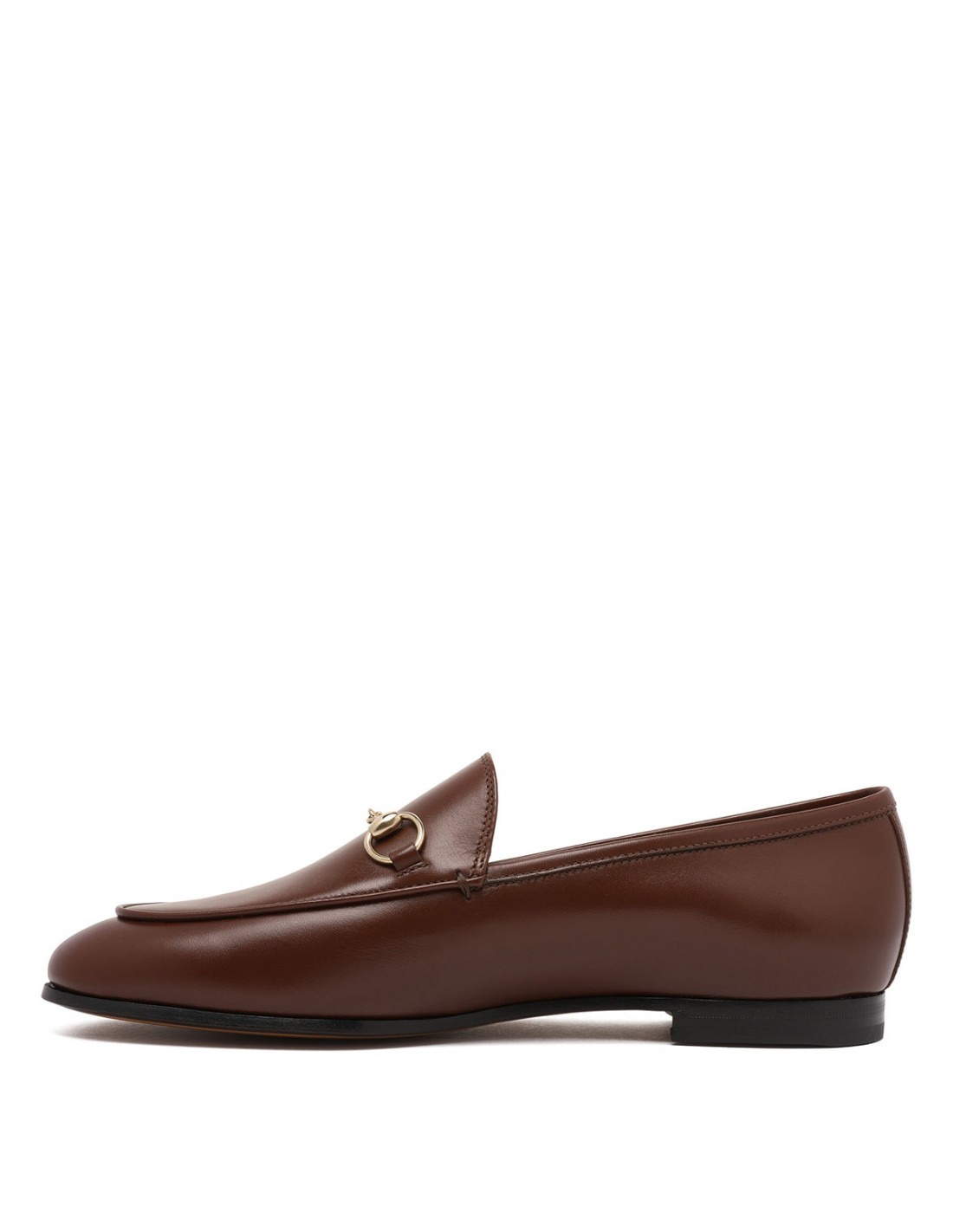 Chestnut brown leather Jordaan loafers from Gucci featuring light gold-toned Horsebit and hardware, almond toe, leather insole and sole.