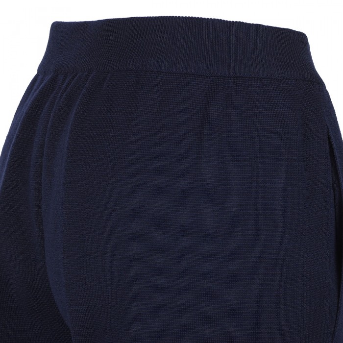 Navy blue fine wool pants from Gucci featuring white piping trims, elastic waist, pleats, side pockets, ribbed knit trims.